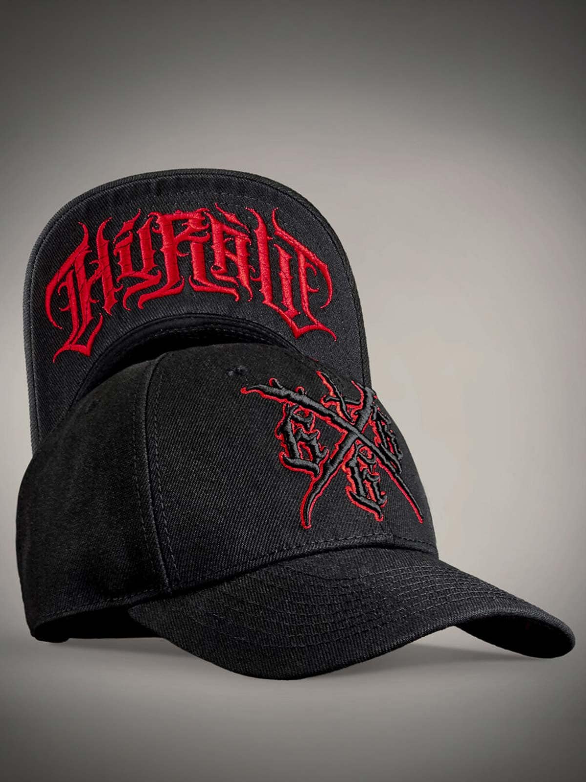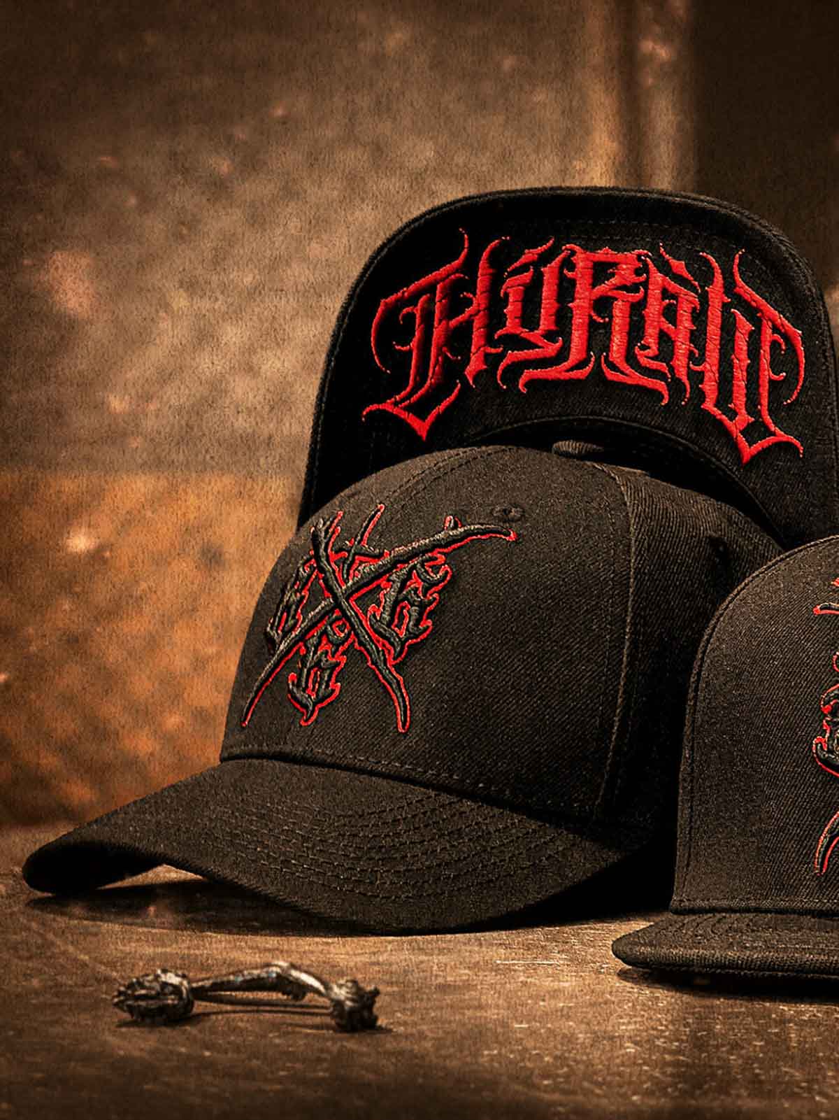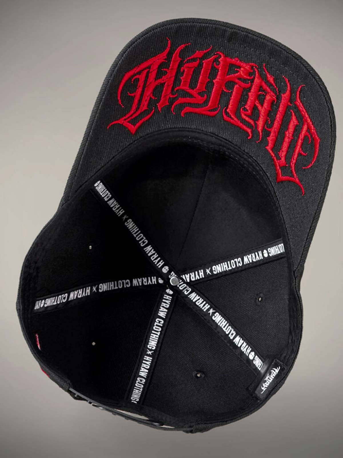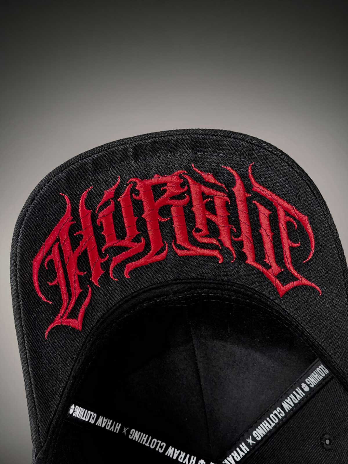 Sort kasket med råt, skræddersyet rødt tryk på skygens underside, broderet motiv foran og et lille rødt broderi bagpå. Kasketten har buet skygge og justerbar snapback for en behagelig pasform.