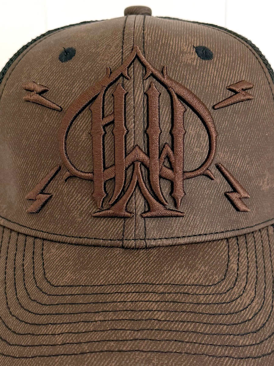 Brun kasket fremstillet i PU-læder foran og sort mesh bagpå. Den har broderet tryk foran, buet skygge og snapback-lukning.