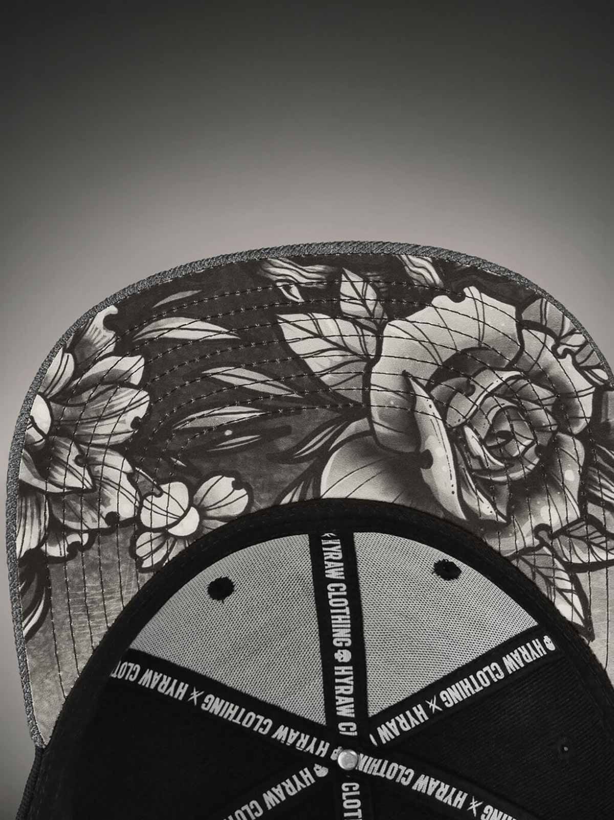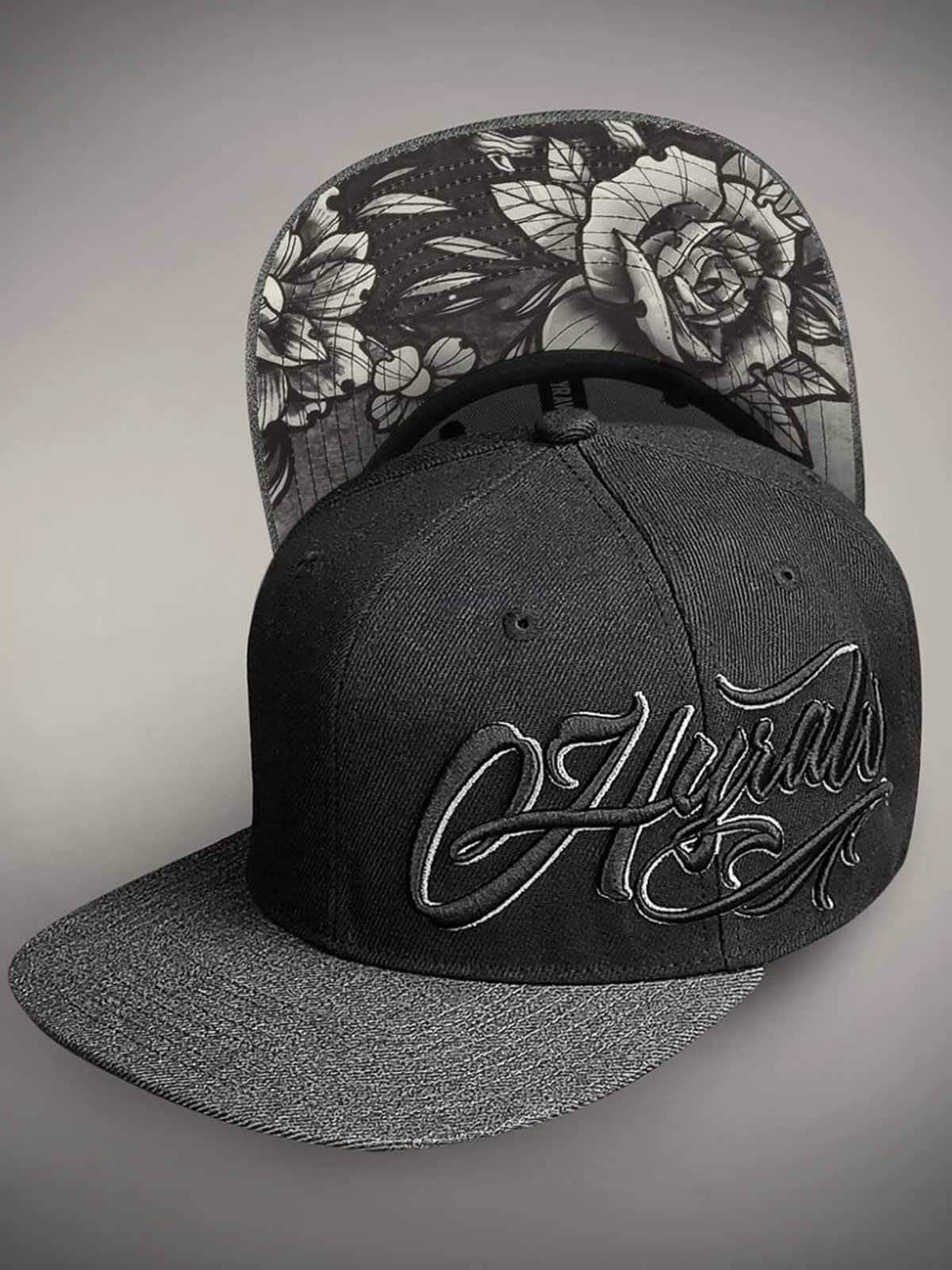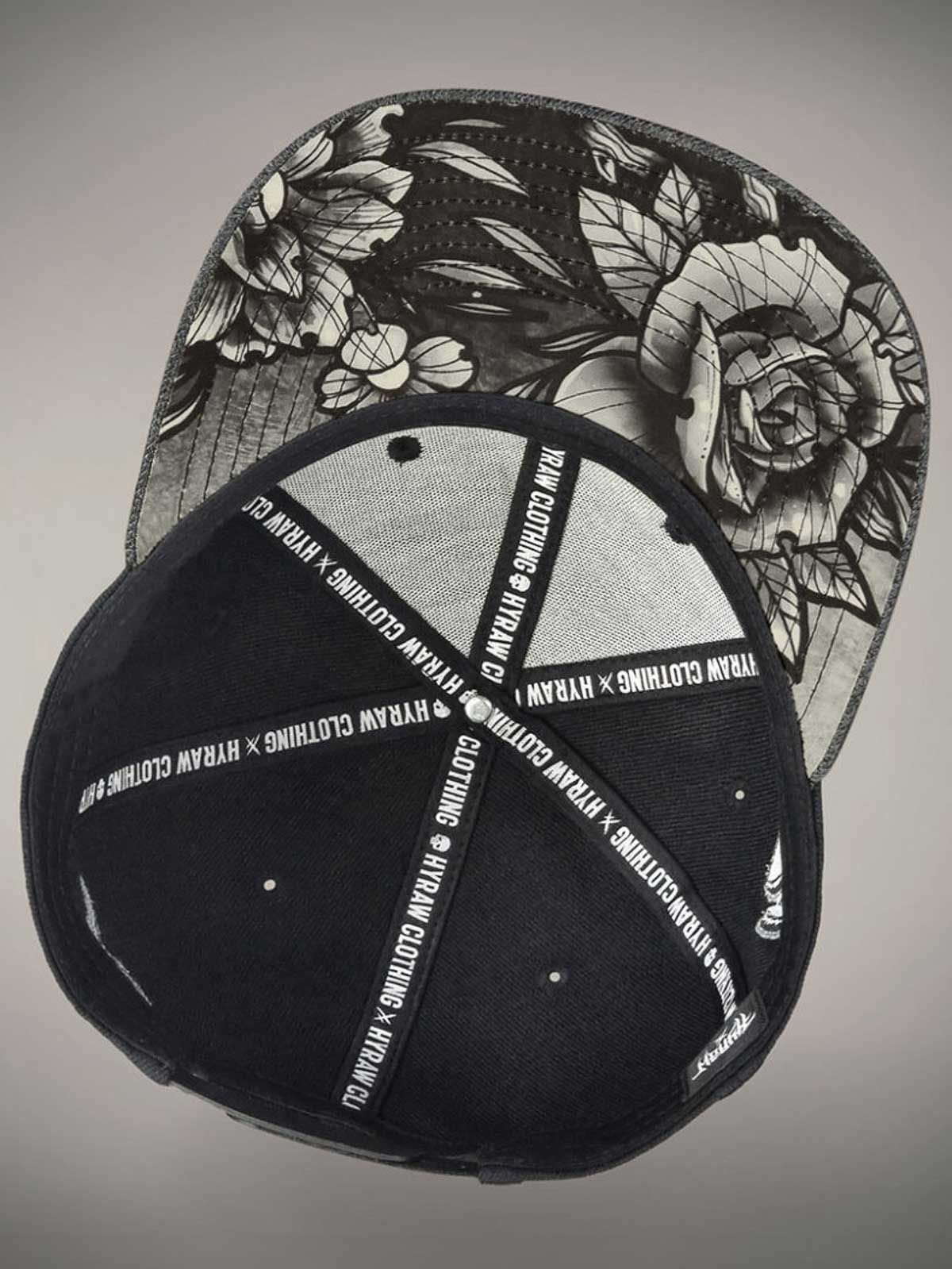 Sort kasket med grå flad skygge. Designet med et broderet logo og justerbar snapback for en perfekt pasform. Skyggens underside er dekoreret med et stilfuldt rosemotiv, som giver kasketten en unik og iøjnefaldende detalje.