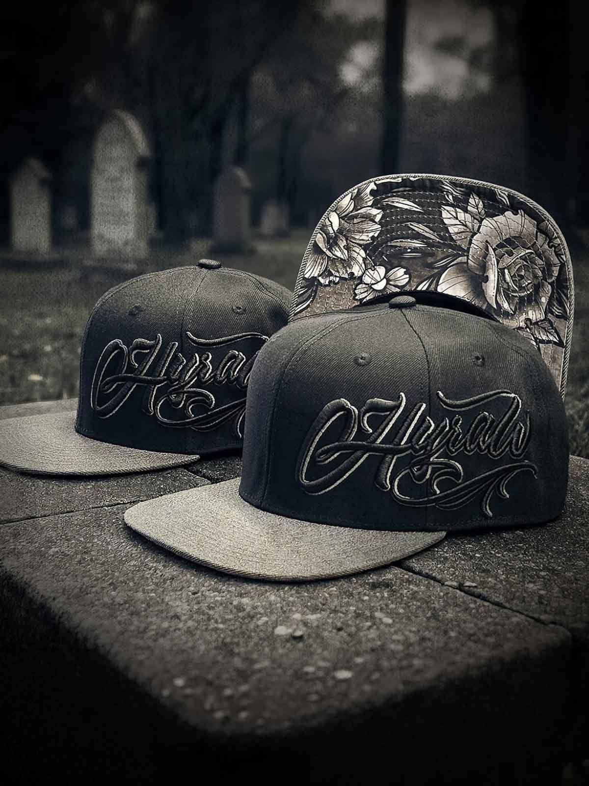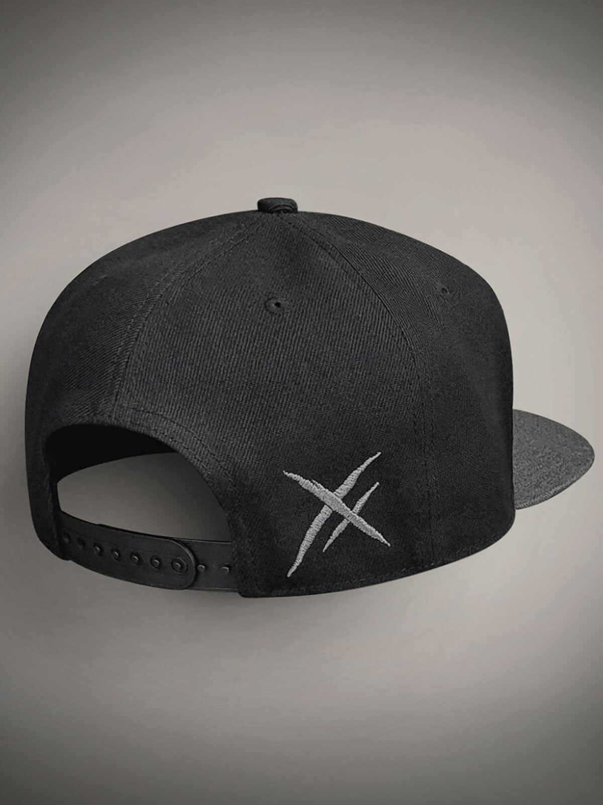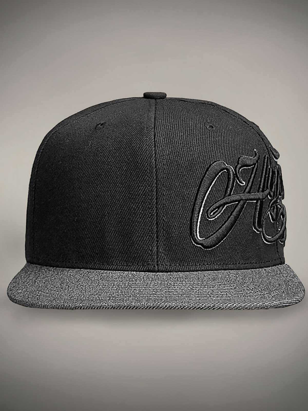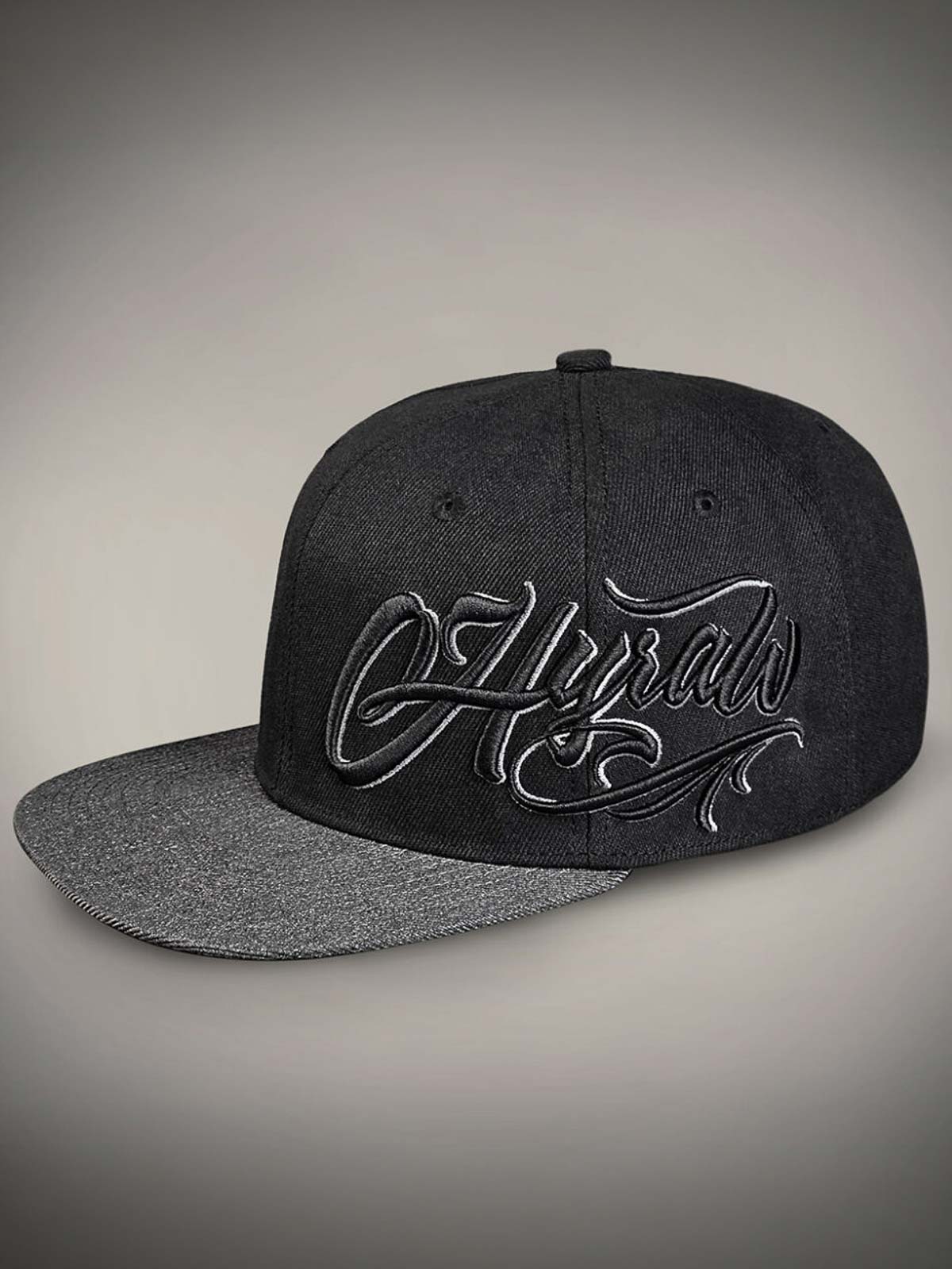 Sort kasket med grå flad skygge. Designet med et broderet logo og justerbar snapback for en perfekt pasform. Skyggens underside er dekoreret med et stilfuldt rosemotiv, som giver kasketten en unik og iøjnefaldende detalje.