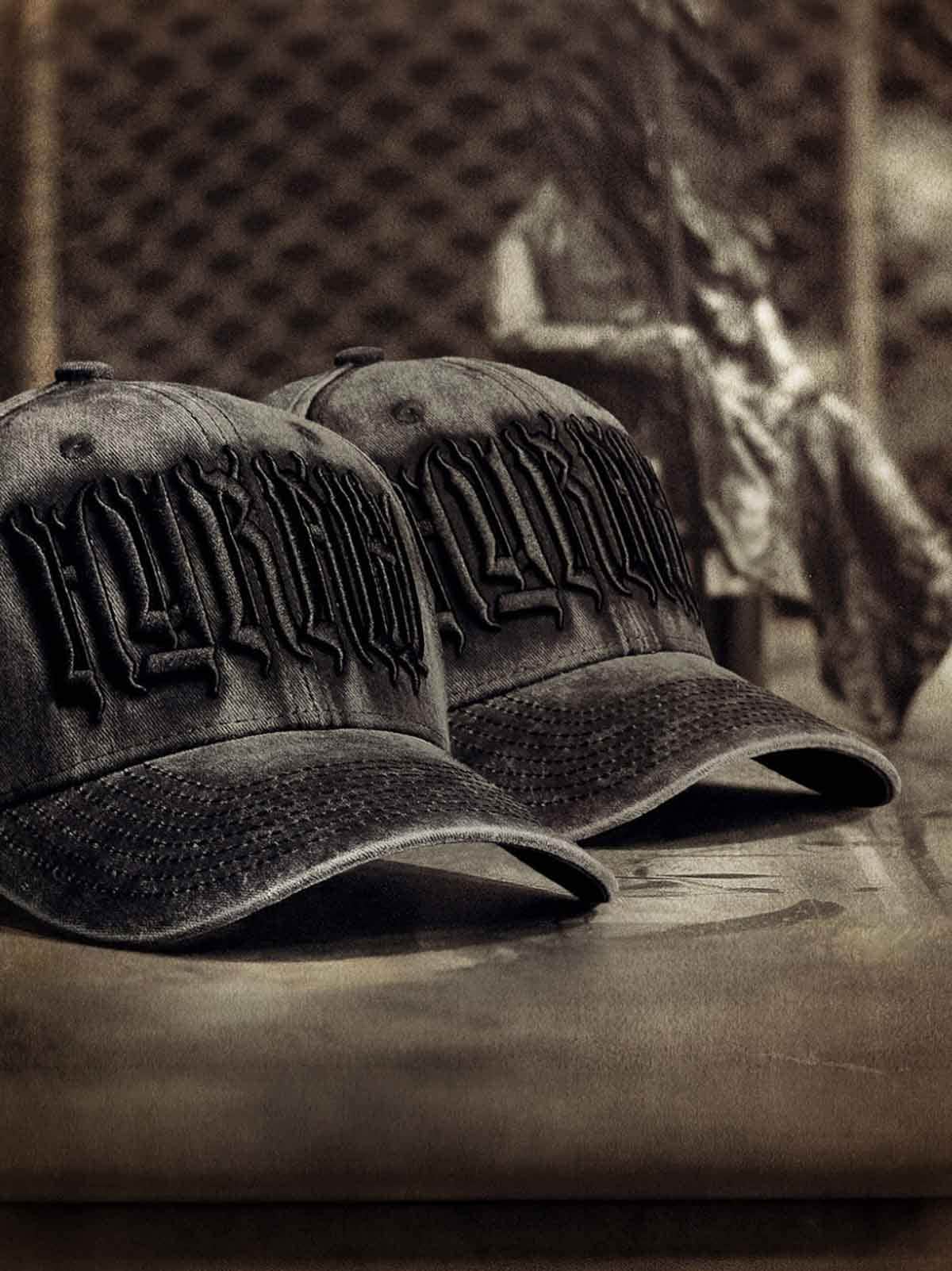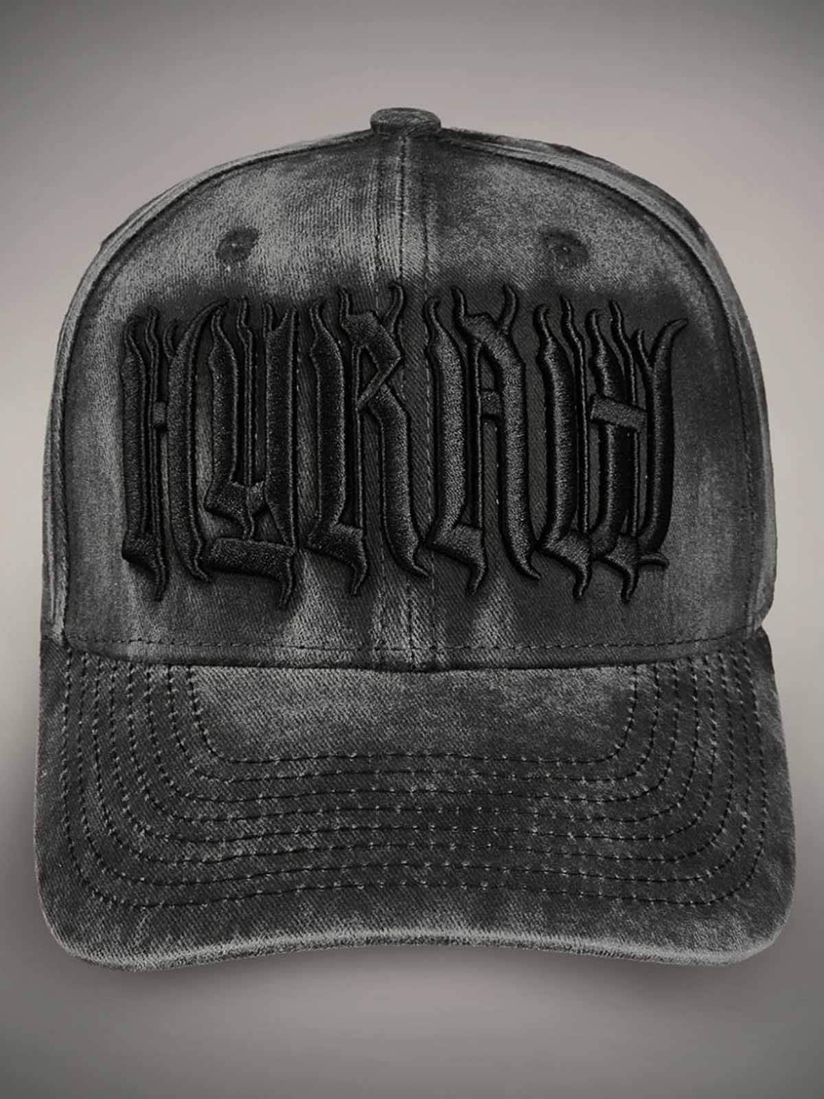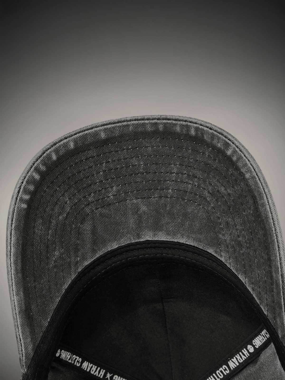 Mørkegrå kasket designet med broderet logo foran. Den har buet skygge og snapback-lukning.