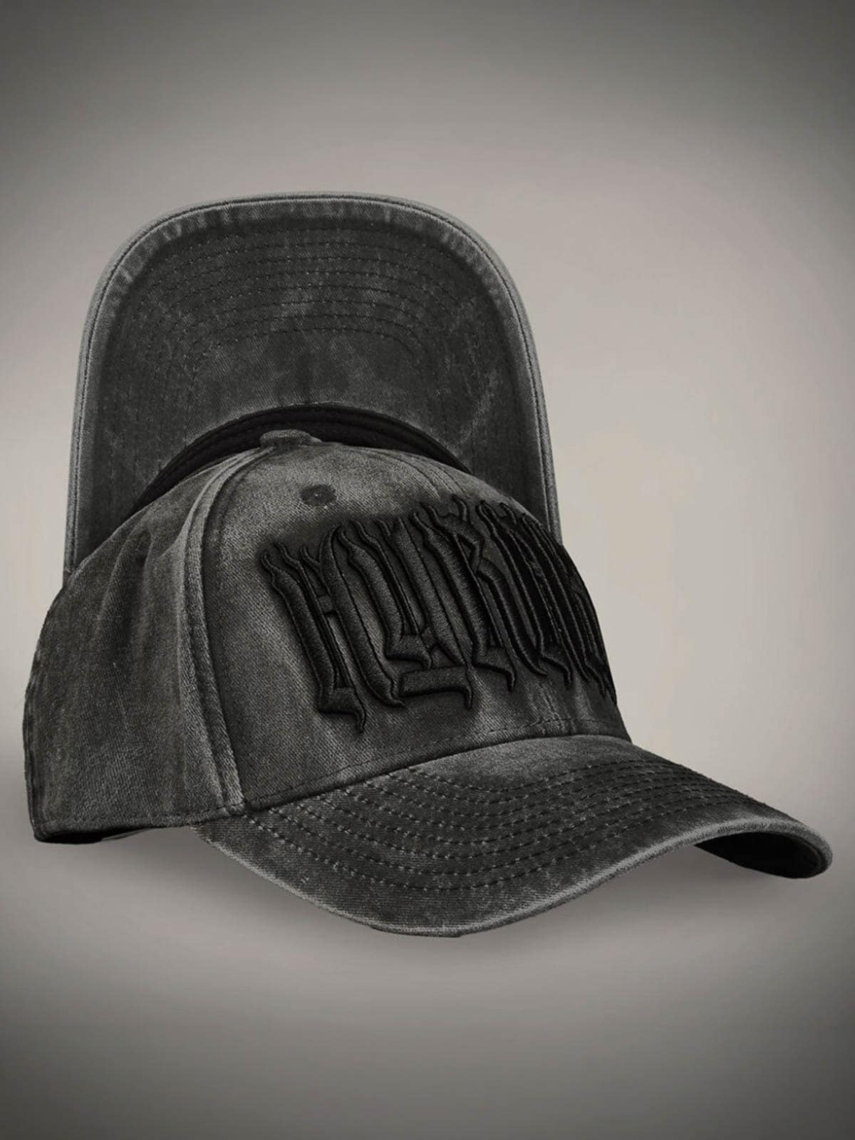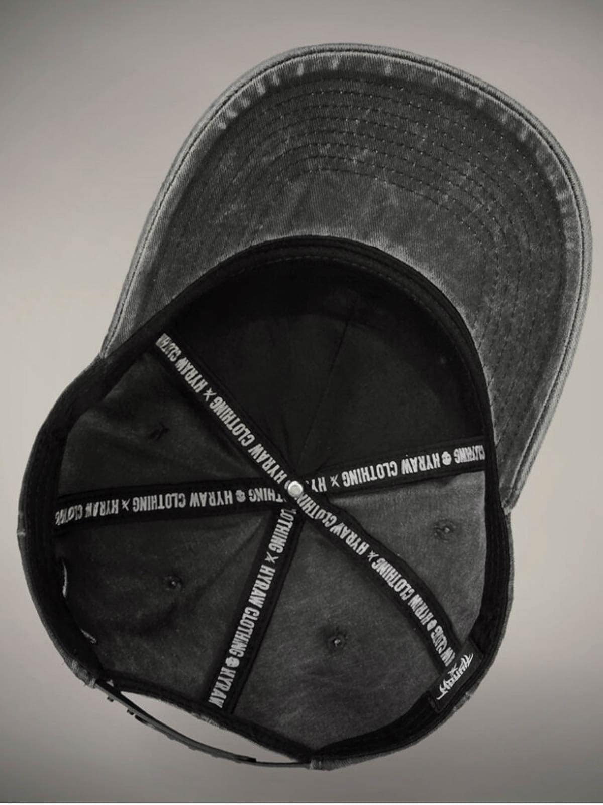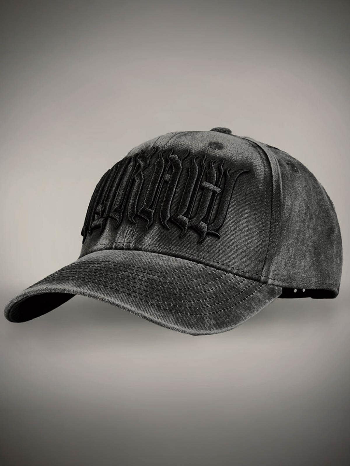 Mørkegrå kasket designet med broderet logo foran. Den har buet skygge og snapback-lukning.
