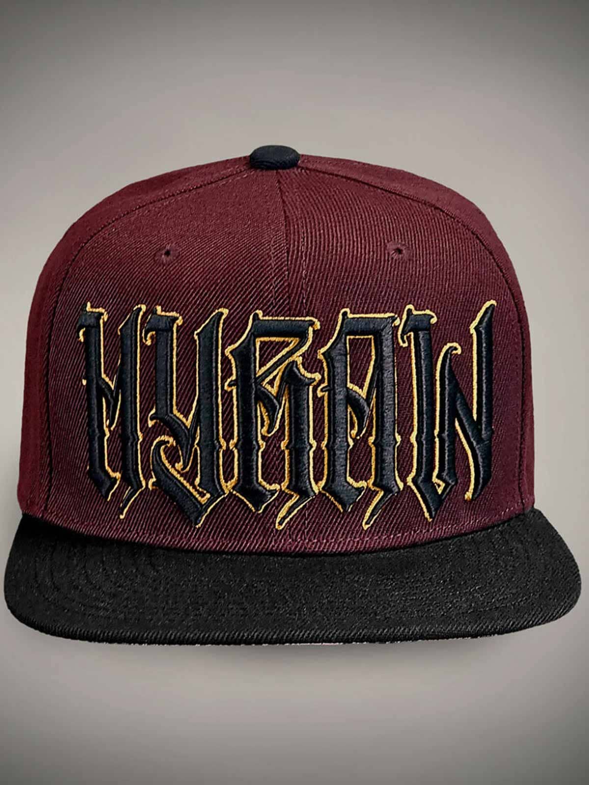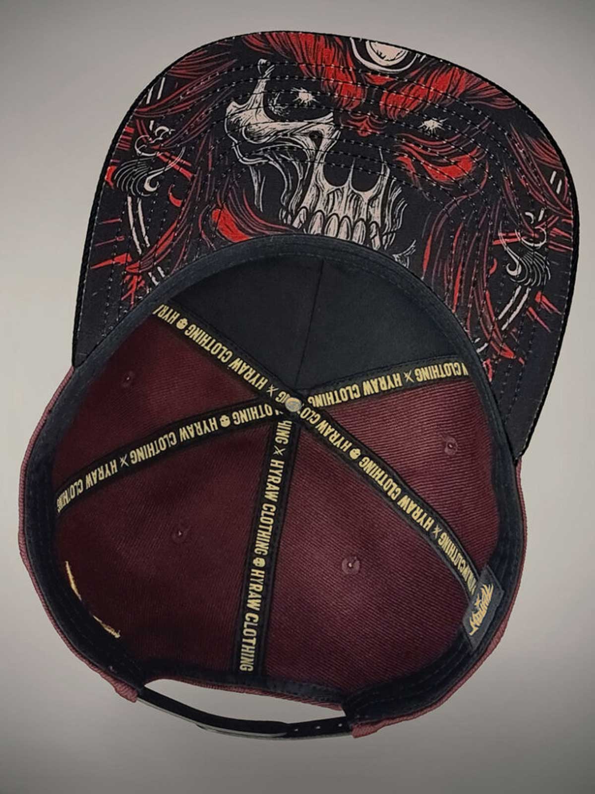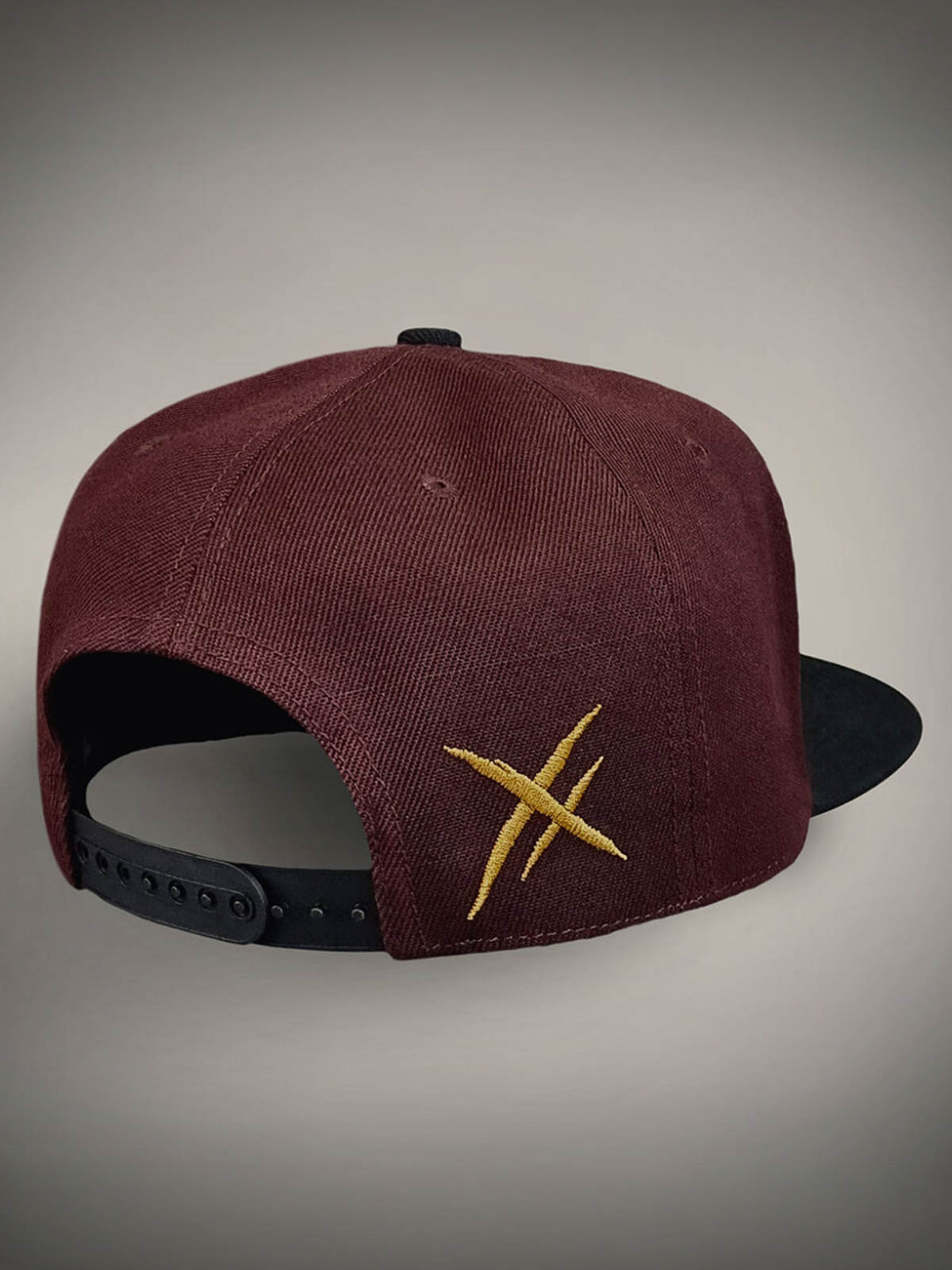 Vinrød kasket med flad skygge, dekoreret med skræddersyet logo i sort og gult foran samt et broderet gult motiv bagpå. Skyggens underside er designet med et unikt motiv, som giver kasketten en ekstra iøjnefaldende detalje.