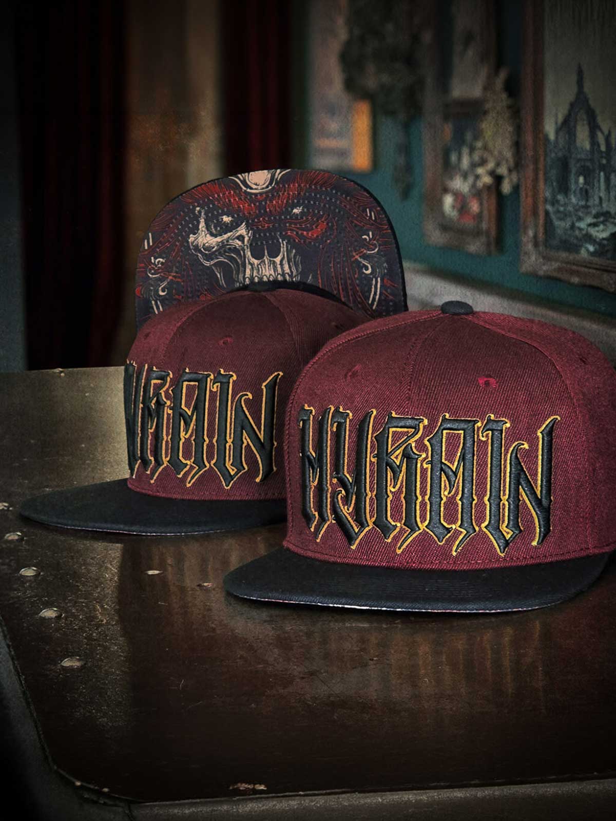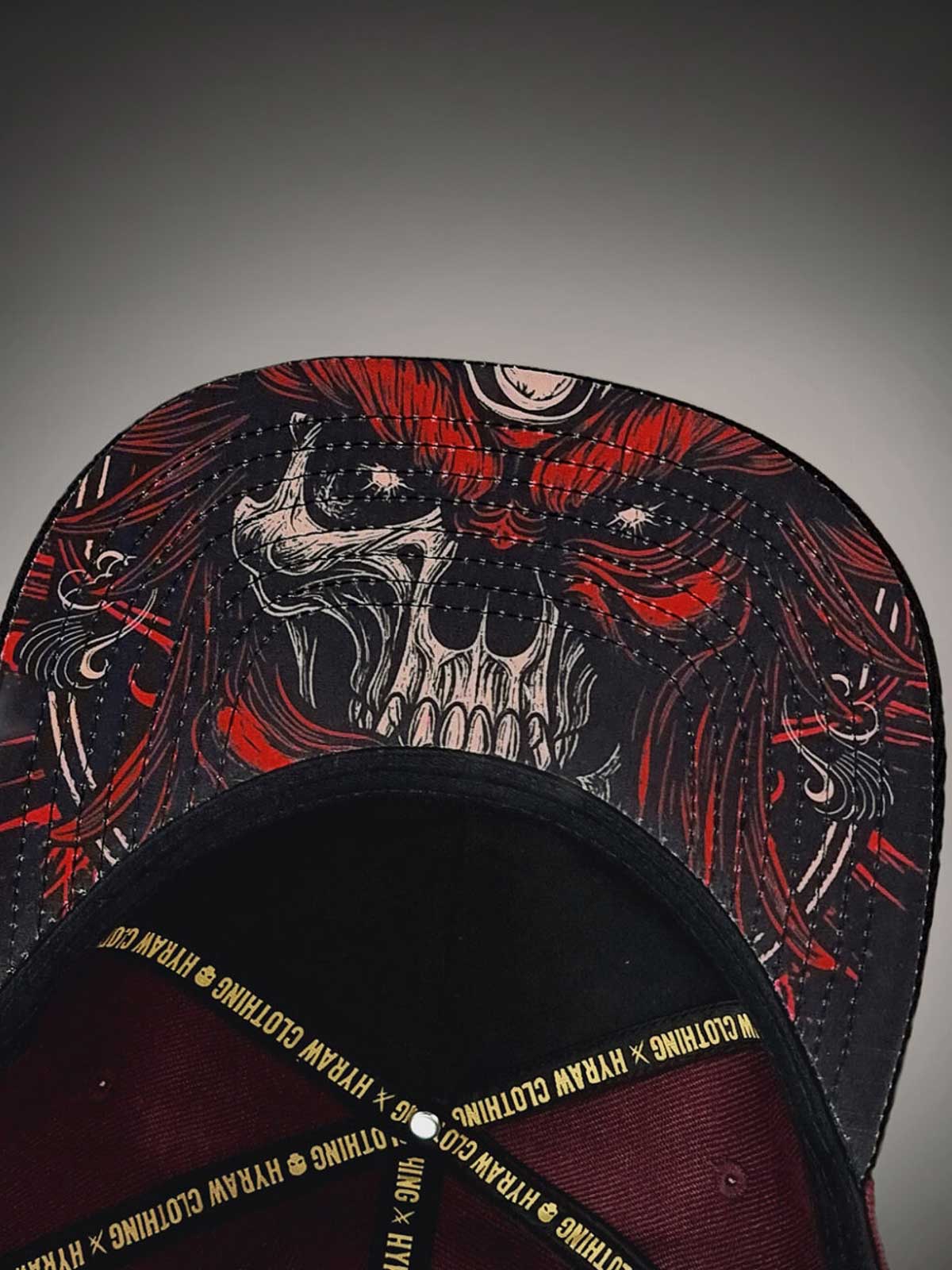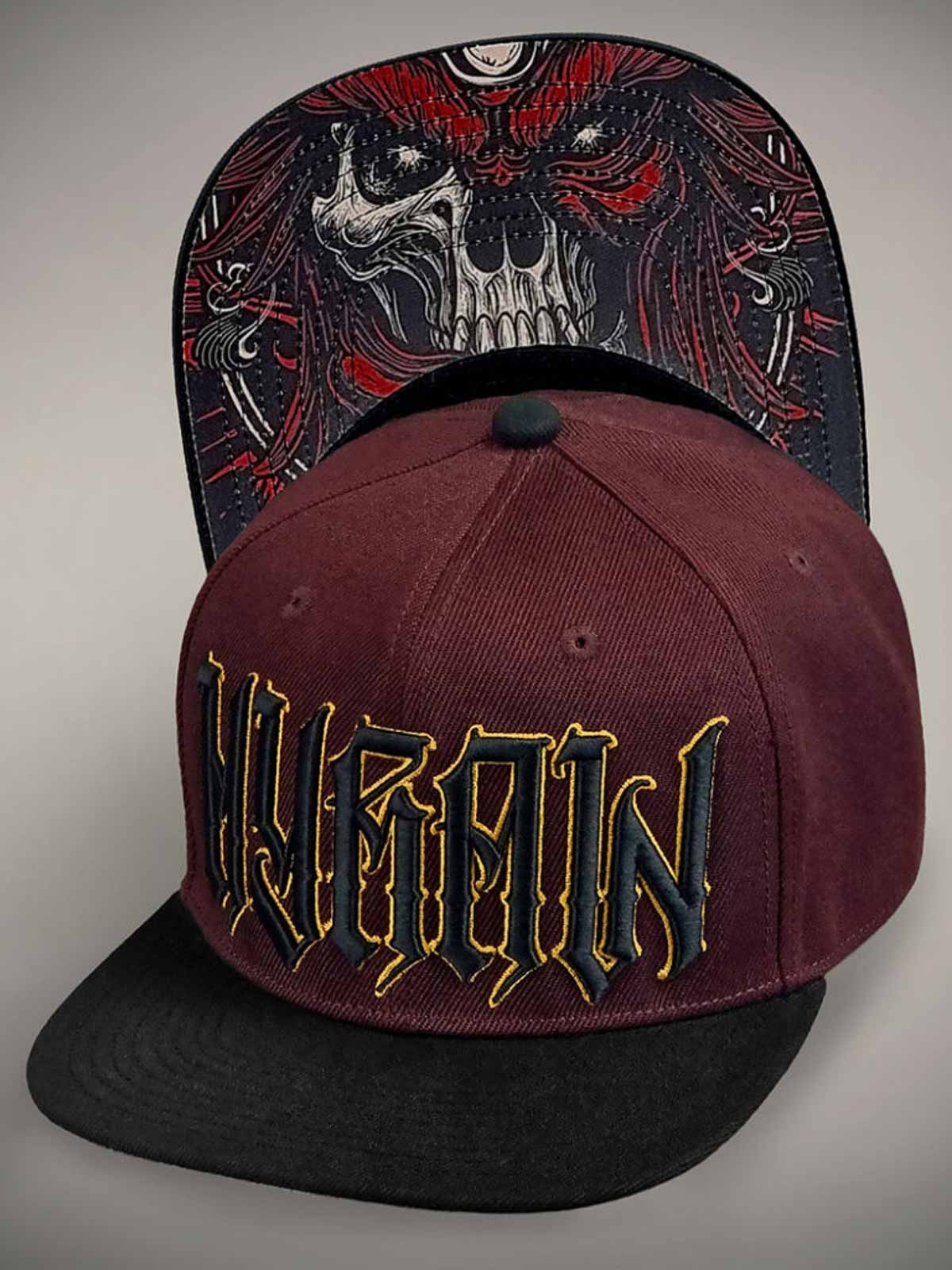 Vinrød kasket med flad skygge, dekoreret med skræddersyet logo i sort og gult foran samt et broderet gult motiv bagpå. Skyggens underside er designet med et unikt motiv, som giver kasketten en ekstra iøjnefaldende detalje.