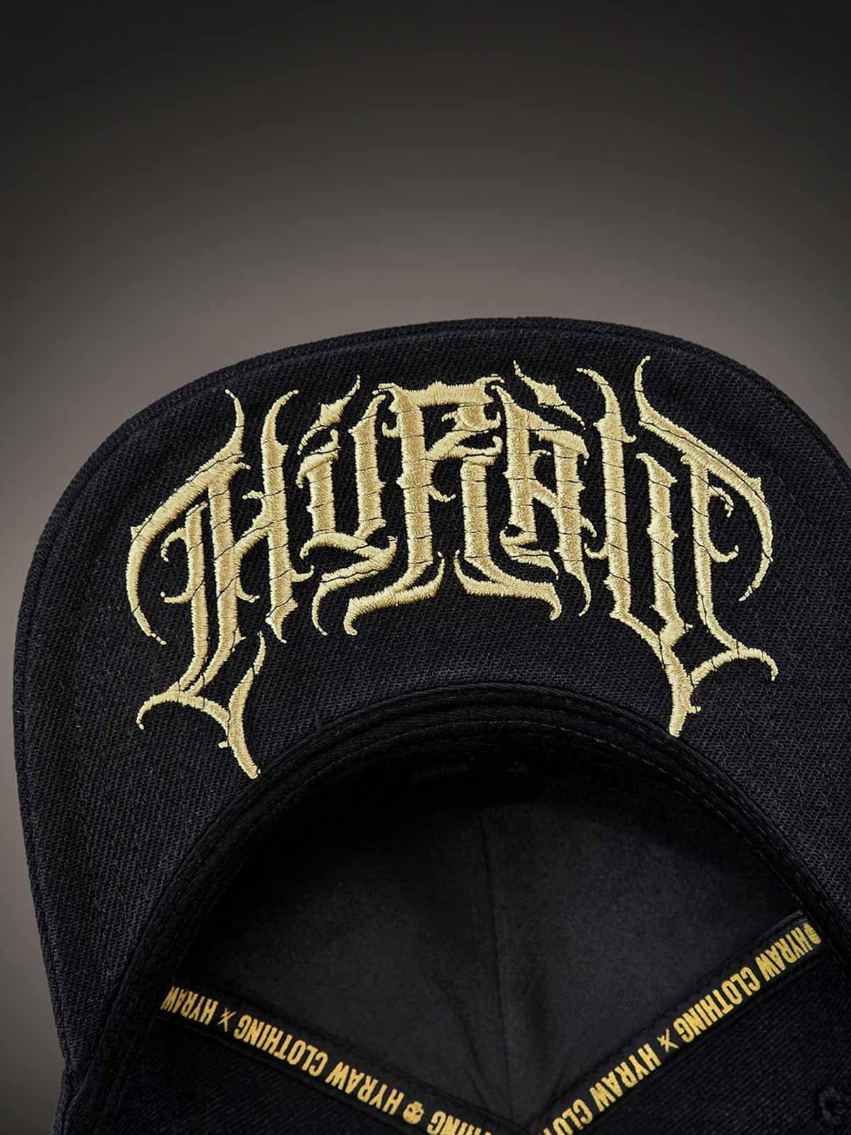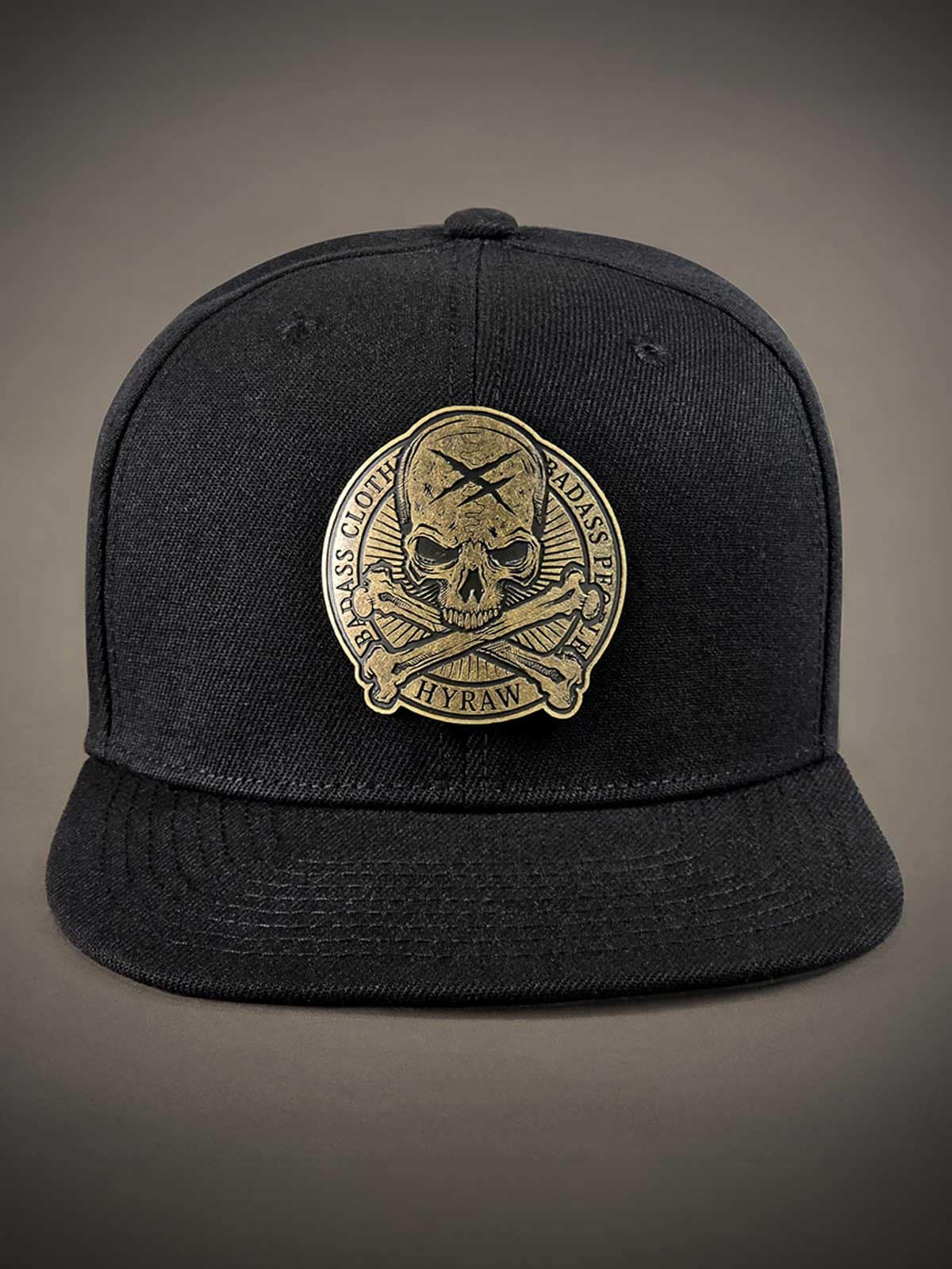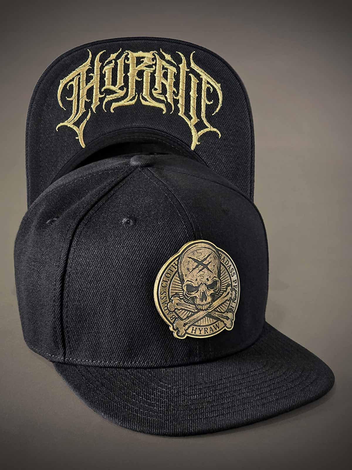 Sort kasket med snapback og en lige skærm. Den er dekoreret med en patch i metal med et dødningehoved fortil. Skærmens underside er designet med et broderet logo.