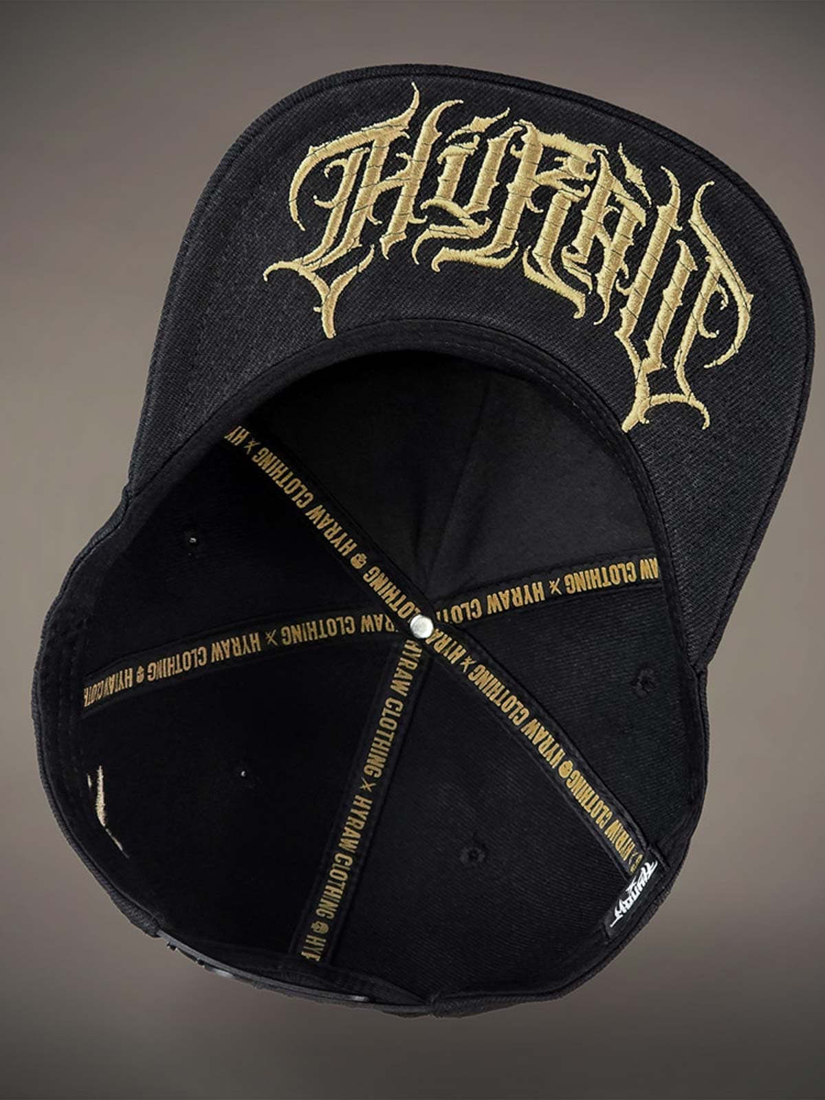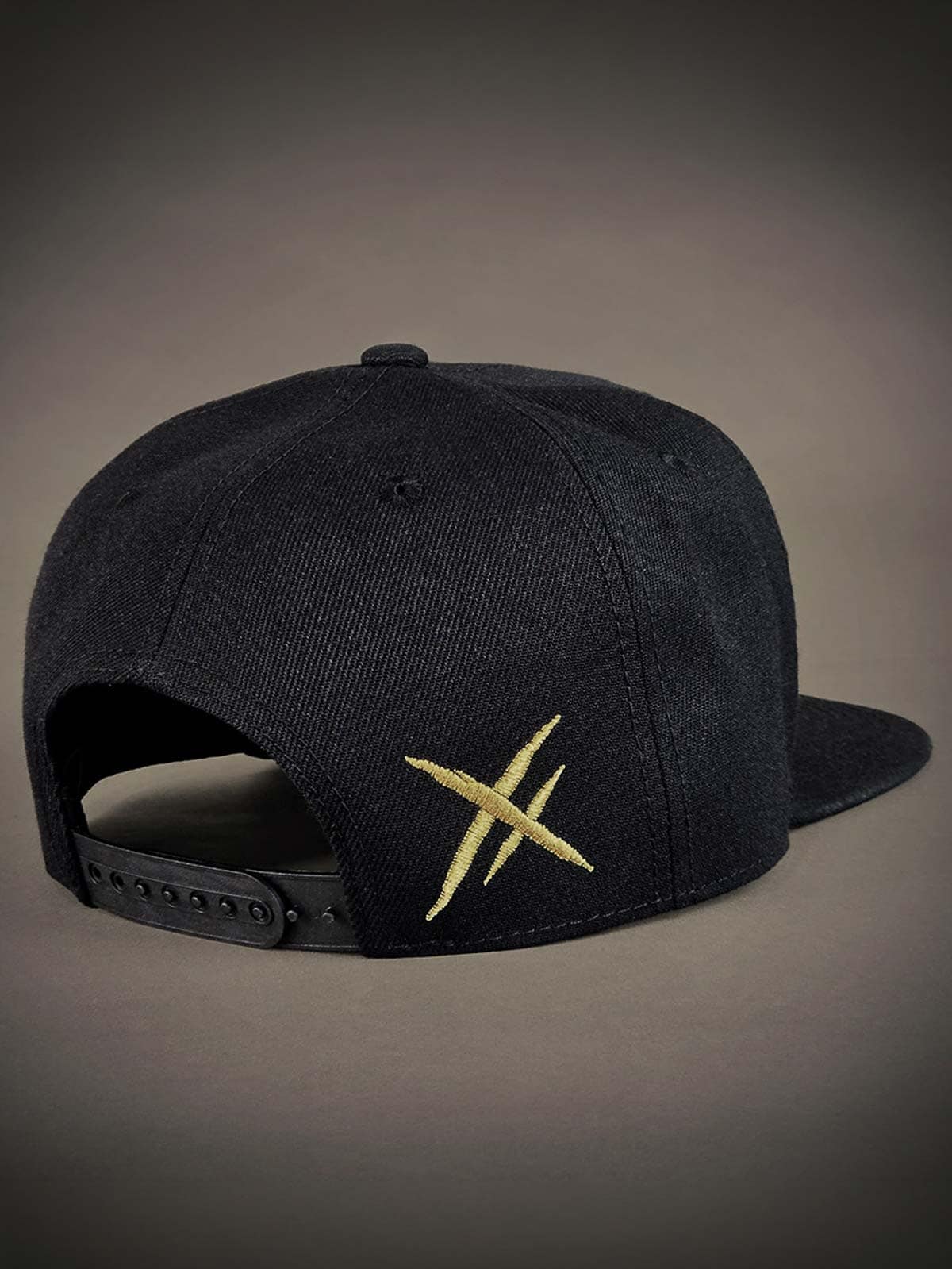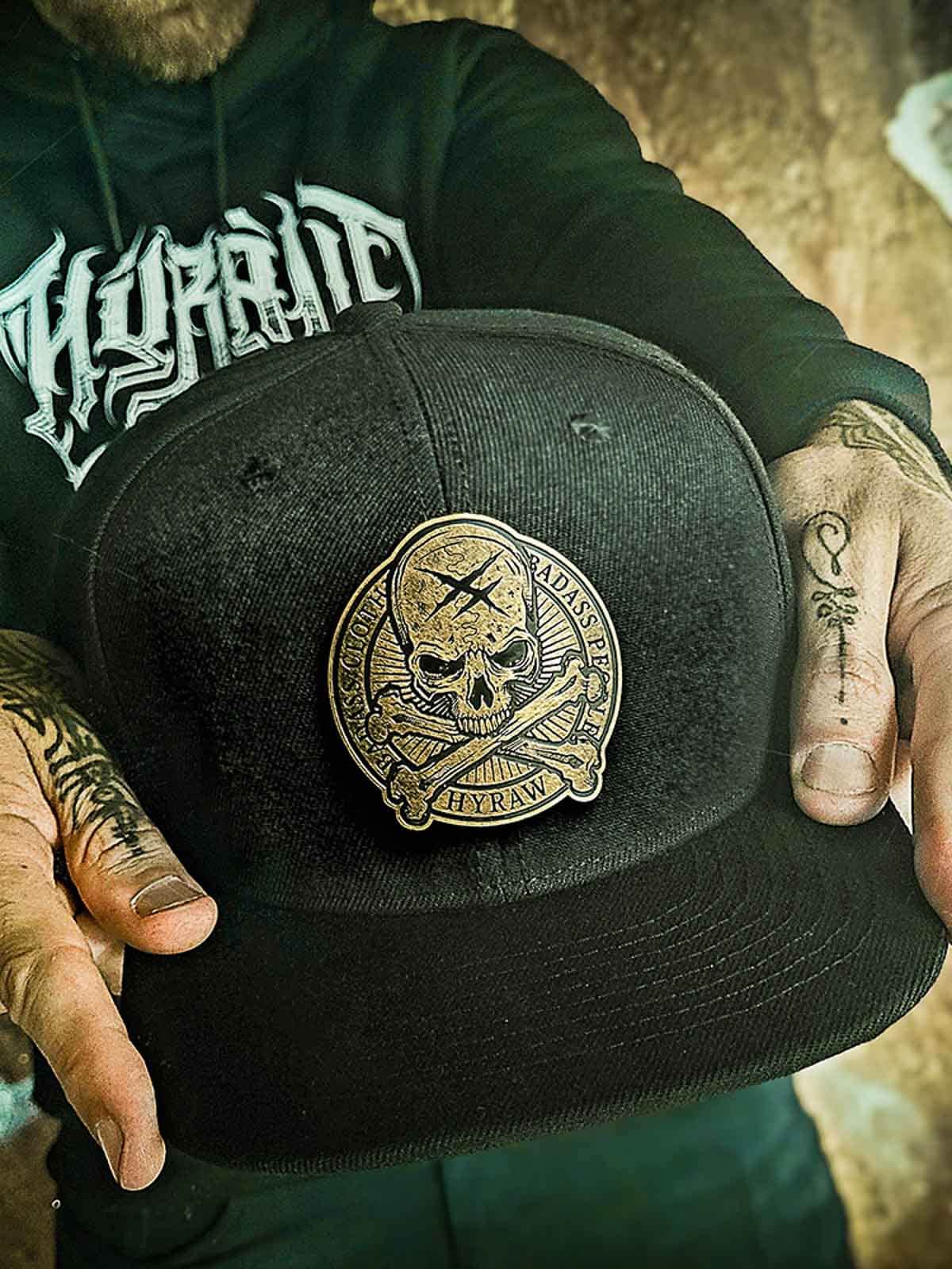 Sort kasket med snapback og en lige skærm. Den er dekoreret med en patch i metal med et dødningehoved fortil. Skærmens underside er designet med et broderet logo.