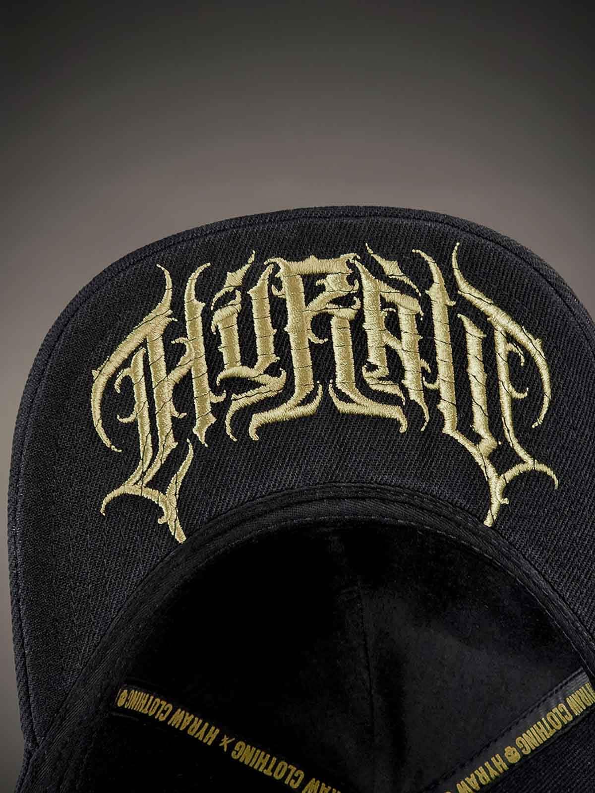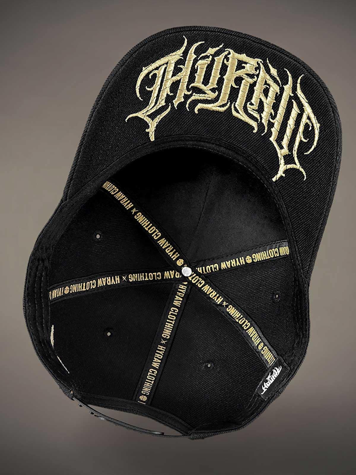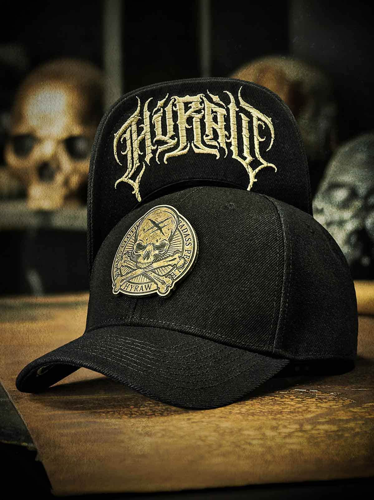 Sort kasket med snapback og buet skygge. Den er dekoreret med en patch i metal med et dødningehoved fortil. Skærmens underside er designet med et broderet logo.
