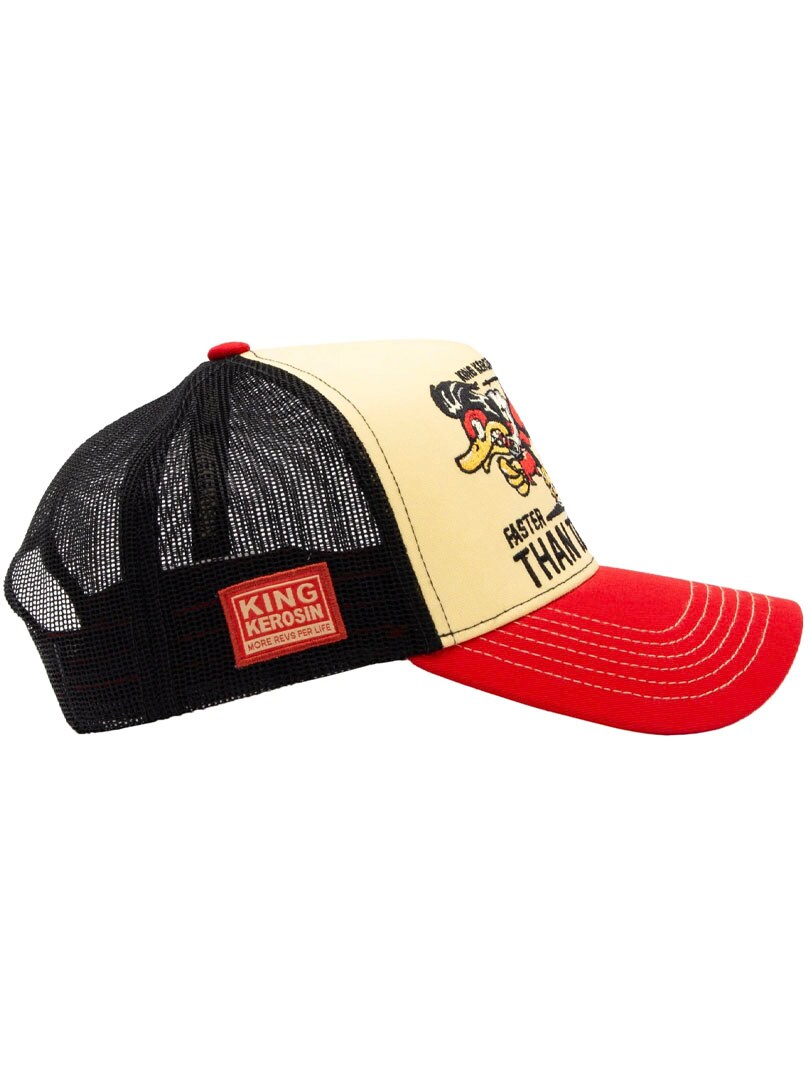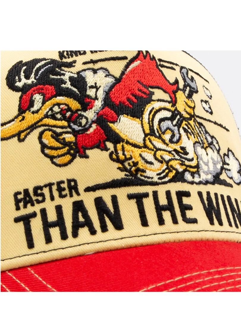 Smart kasket med rød skygge, der giver et tydeligt farveudtryk. Den beige frontpanel skaber en retrofornemmelse, og den sorte mesh-bagpanel tilføjer den perfekte dosis coolness. Fronten er designet med broderet tryk foran med teksten «Faster Than The Wind». Takket være det luftige mesh-materiale og den justerbare snapback sidder kasketten altid komfortabelt.
