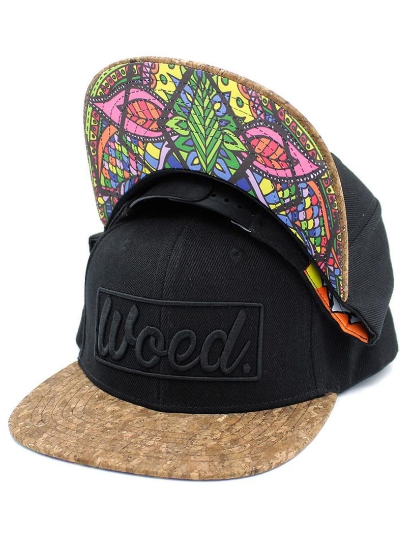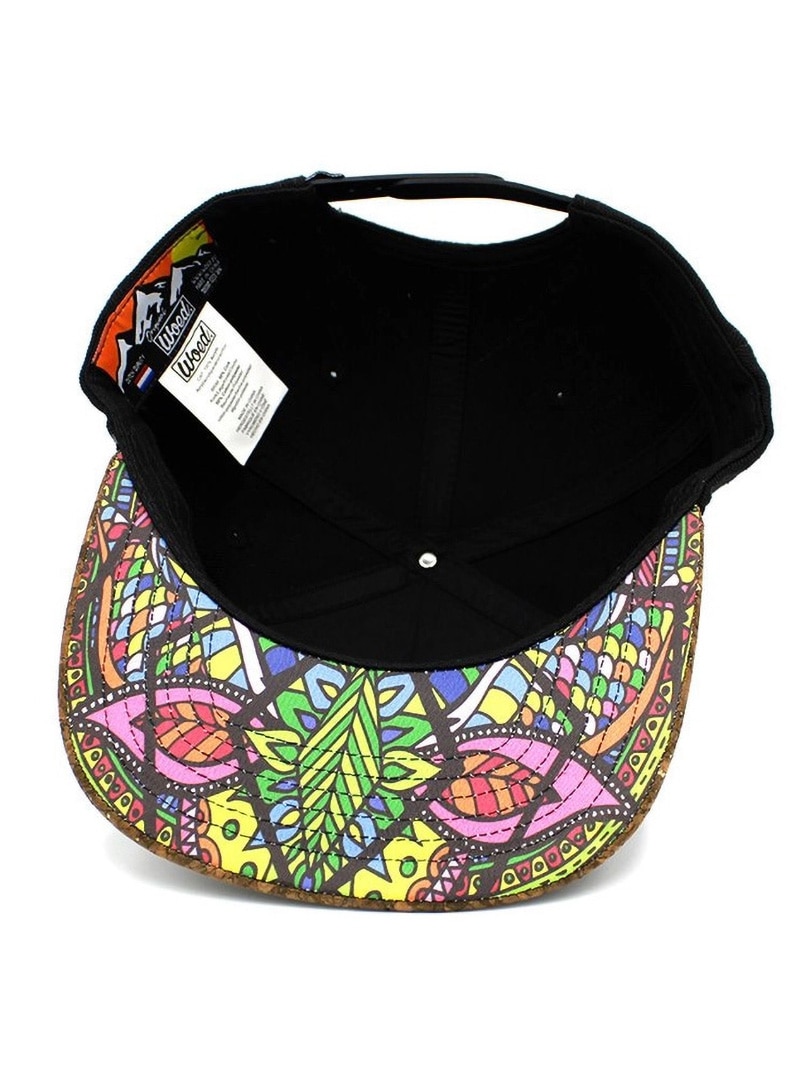 Snapback-kasket i slidstærk akryl med 3D-broderet logo foran. Skyggen har en overside i kork og et farverigt kunstmotiv af Minka Hoek på undersiden, hvilket giver kasketten et unikt udtryk.