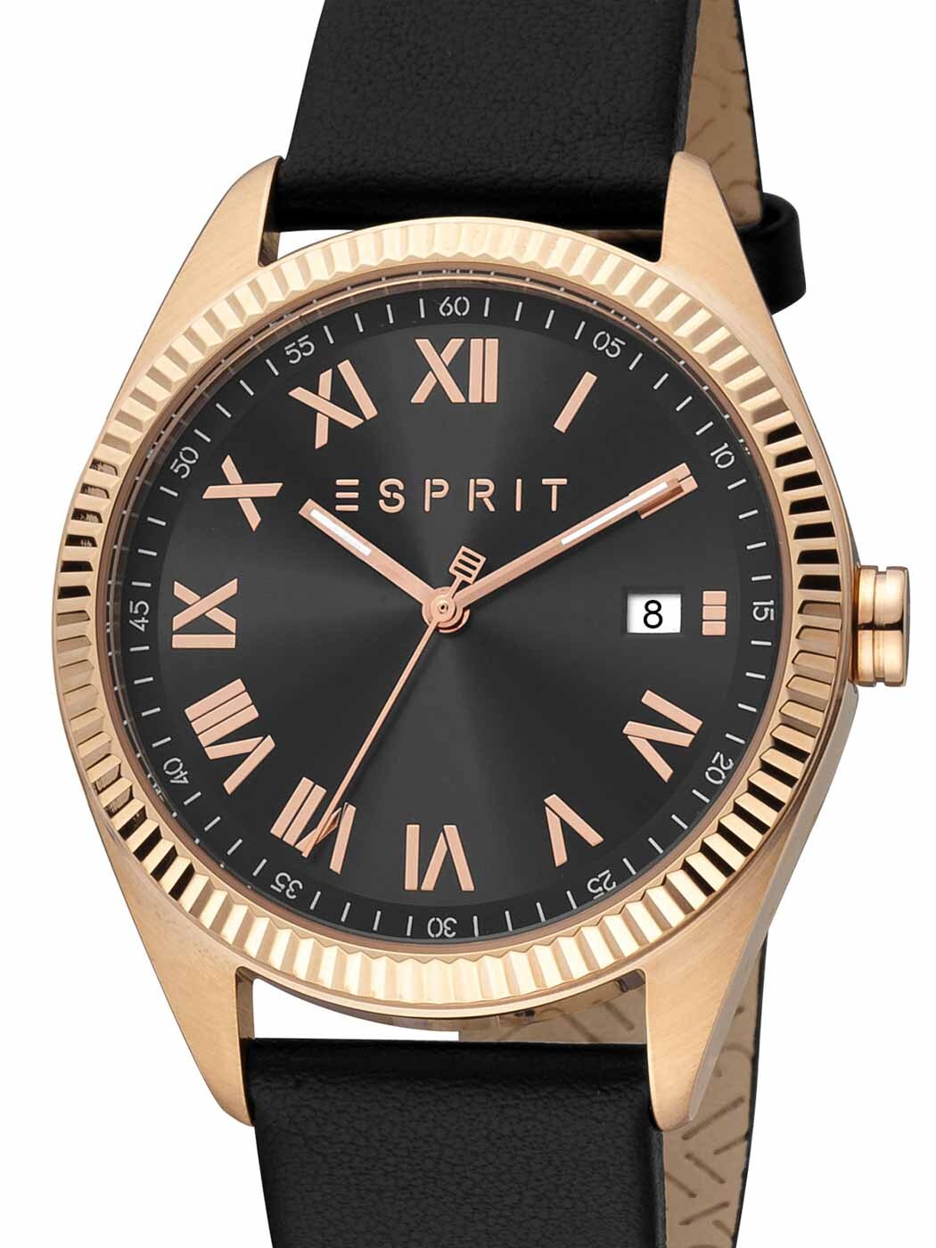 Ur med urkasse i rosenguld-tone og sort læderrem. Designet med en riflet urkrans (bezel) og sort urskive med romertal. Uret er udstyret med datovisning og drives af et pålideligt quartz-urværk for høj præcision. Vandtæt ned til 100 meter.