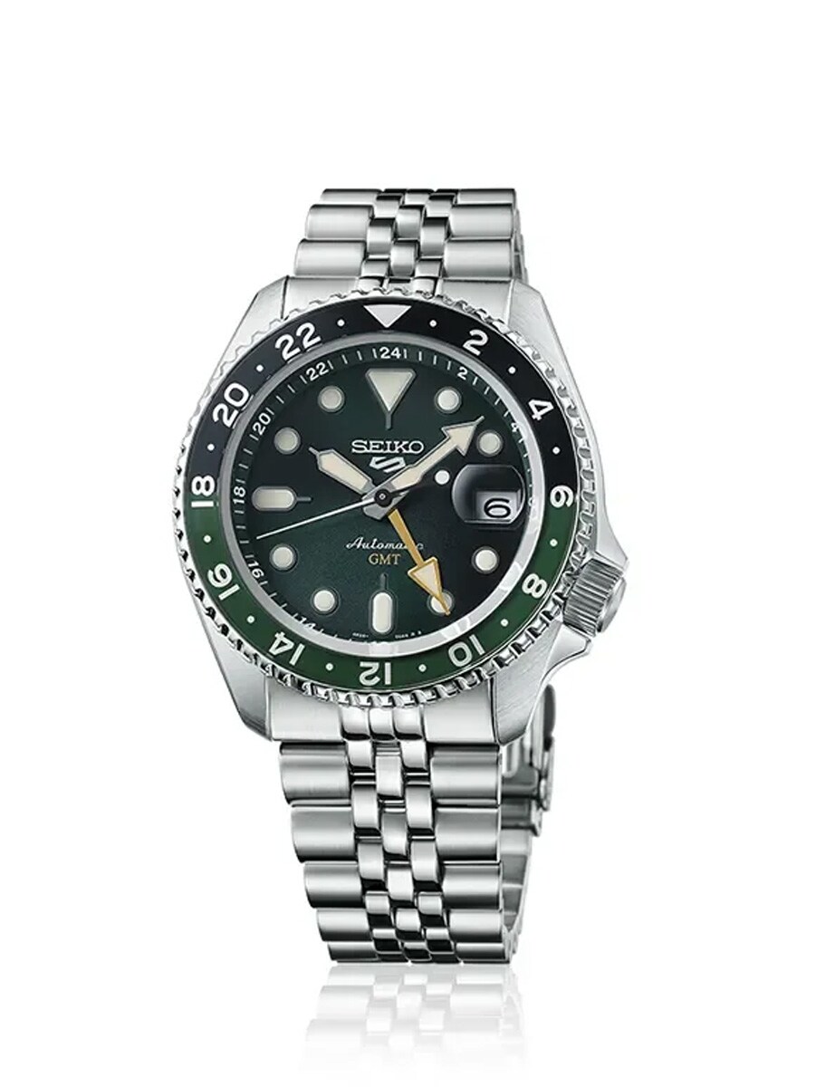 Seiko 5 Sports SSK035K1 er et elegant automatisk GMT-ur, der lader dig holde styr på to tidszoner samtidigt, perfekt til den moderne rejsende. Det har en iøjnefaldende grøn urskive med sunburst-effekt og en tofarvet drejelig krans i sort og grønt. Uret bæres på en behagelig femrækket lænke i rustfrit stål og er beskyttet af et ridsefast Hardlex-glas med datoforstørrelse. Det automatiske urværk oplades af dine bevægelser og kan beundres gennem den åbne bagside. Med 100 meters vandtæthed kombinerer denne model sporty holdbarhed med tidløs stil og funktionalitet.