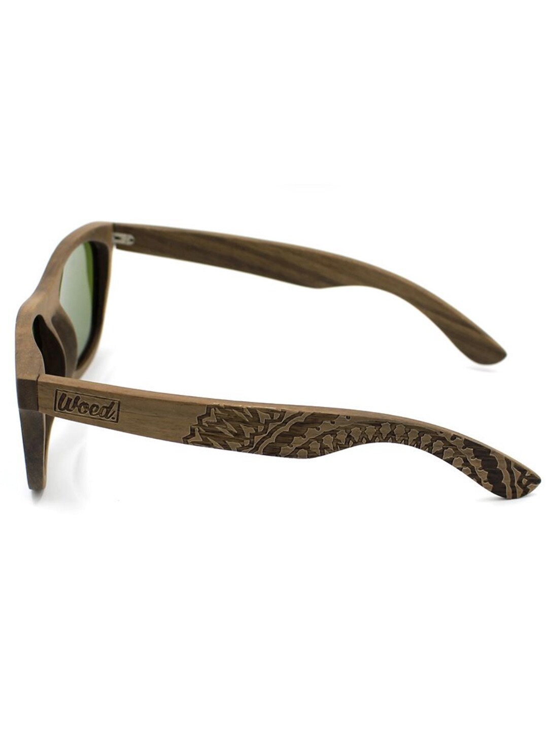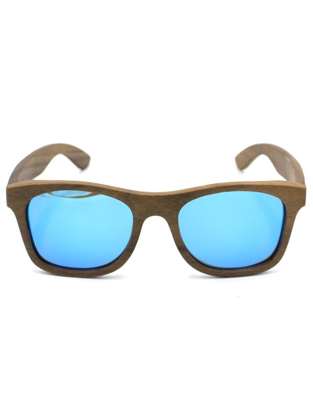 Unikke solbriller i valnøddetræ med blå glas og mønstrede stænger. Udstyret med UV400-polariserede linser, som beskytter mod solen og reducerer generende reflekser. Leveres med pudseklud og praktisk opbevaringspose.