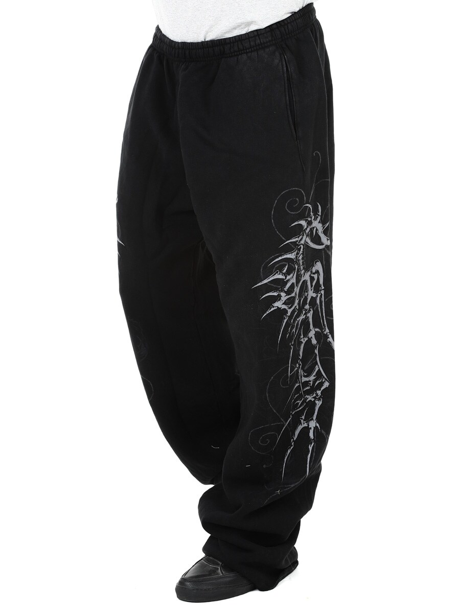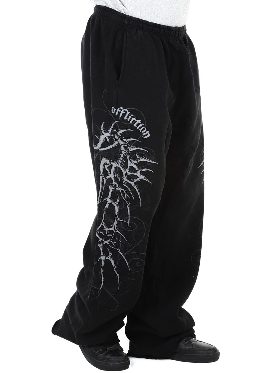 Et par bløde og komfortable sweatpants med masser af attitude. Den sorte, vaskede base kombineres med store grafiske print langs benene, som giver bukserne et unikt udtryk. Den elastiske linning prydes af Affliction-logoet og har snøre for justerbar pasform. Brede ben skaber en afslappet silhuet, perfekt til hverdagsbrug med en rockinspireret stil.