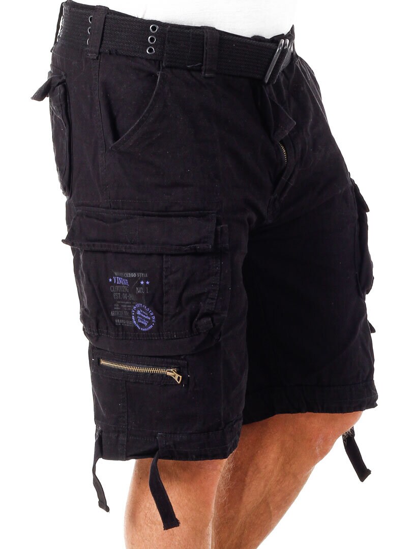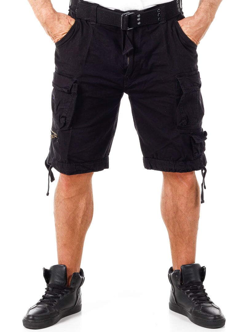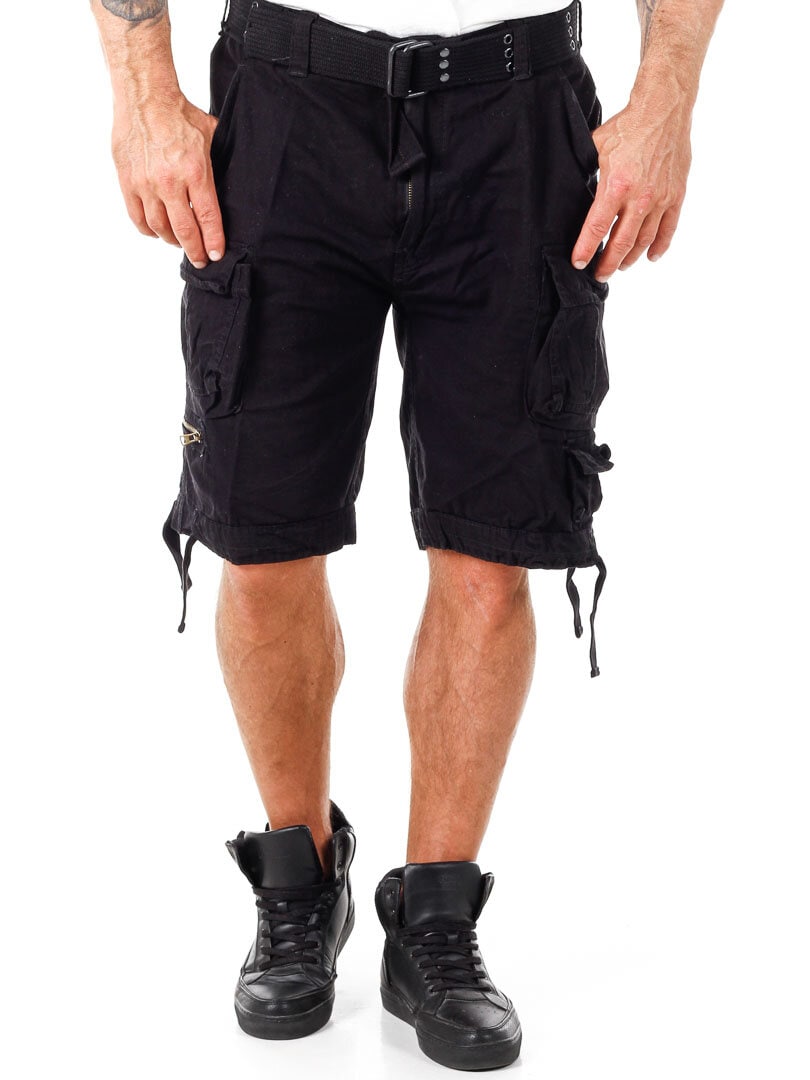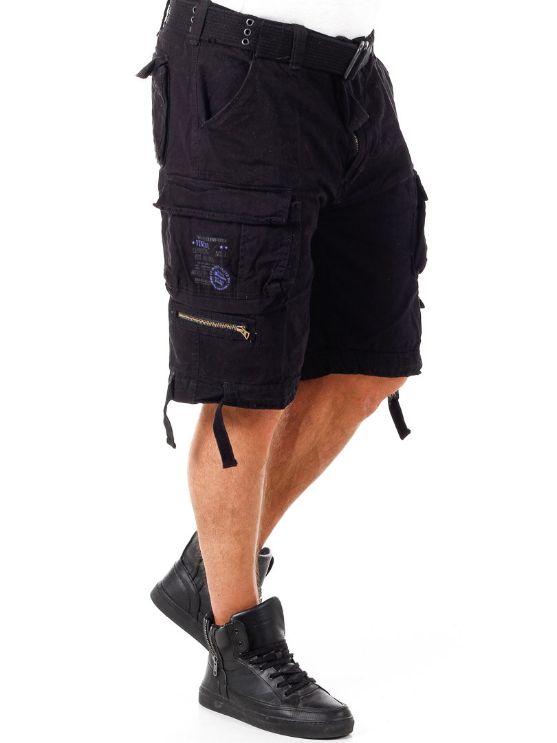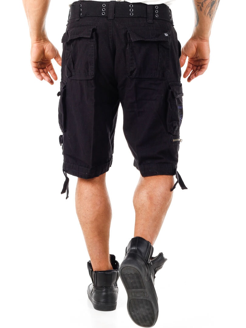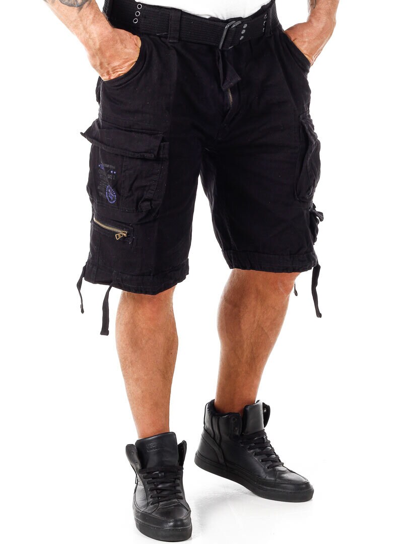 Sorte shorts med teksttryk, i kontrastfarver, på siden. De er fremstillet i en mere grov bomuldskvalitet. Desuden har disse shorts godt med lommer, og så kan de reguleres i taljen og ved benenes slutning ved hjælp af snører. Et aftageligt bælte i taljen medfølger.