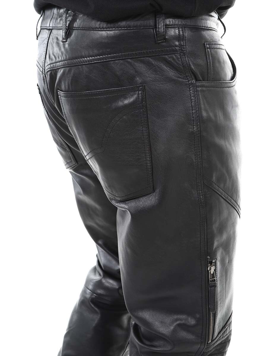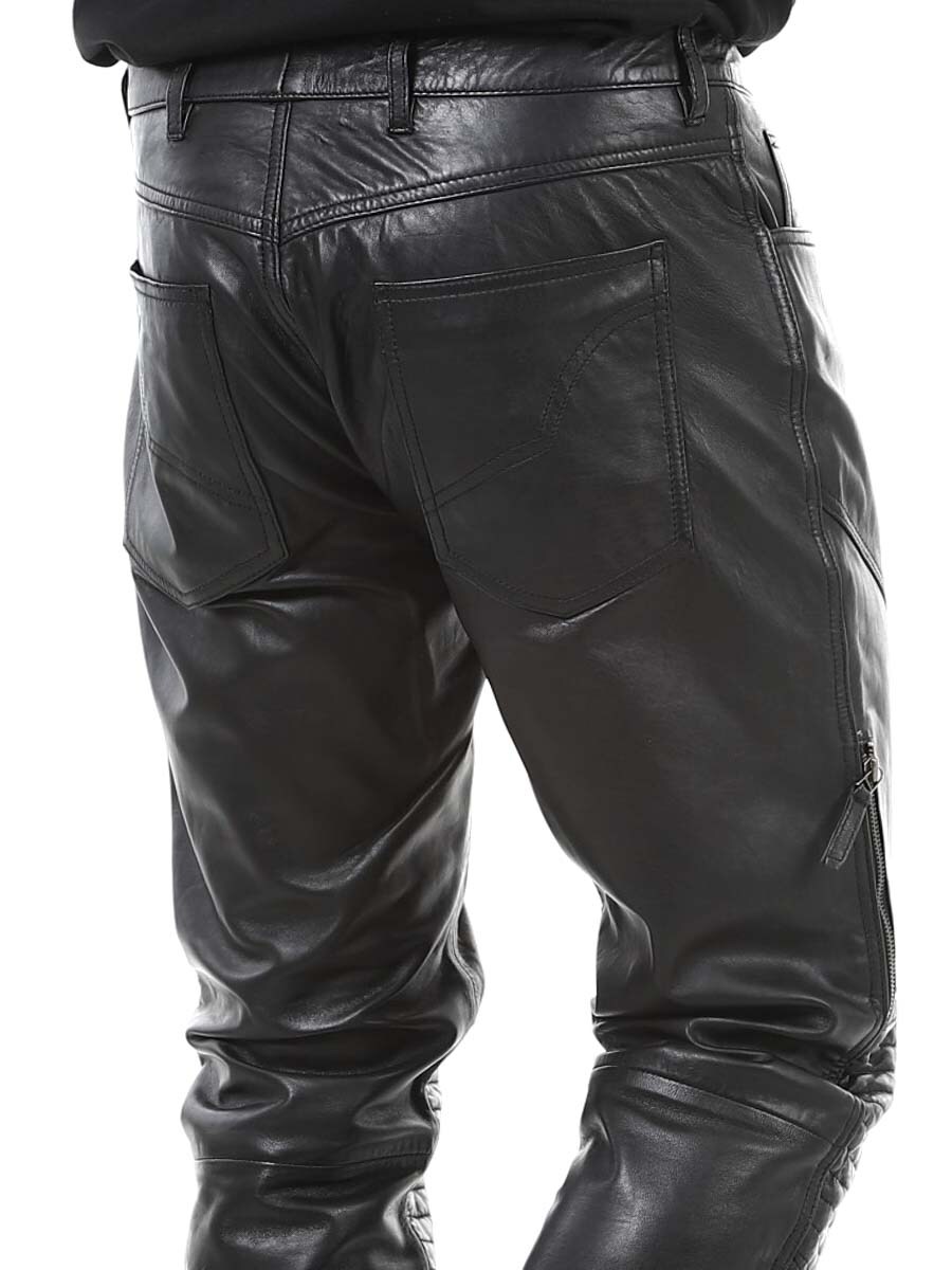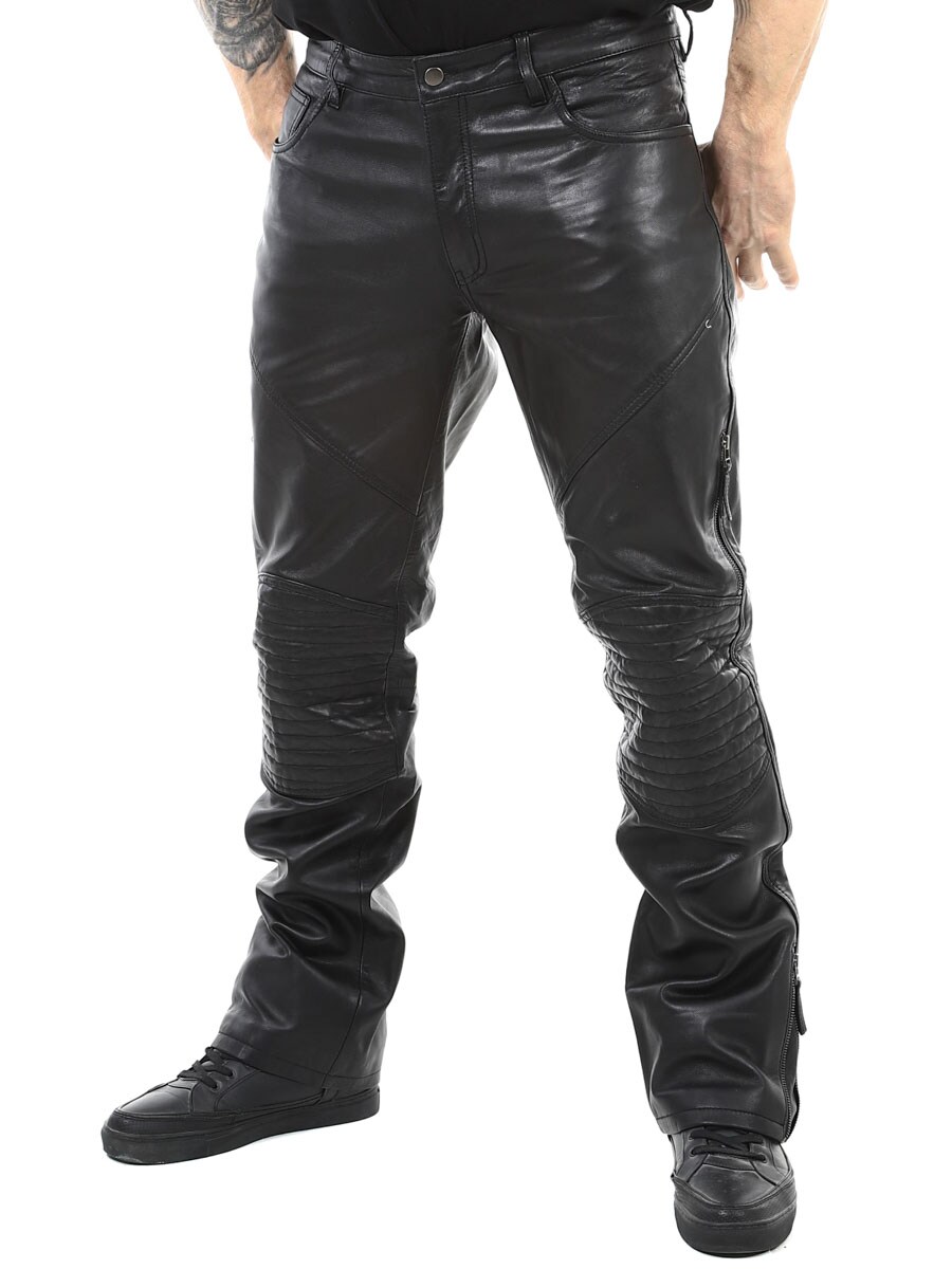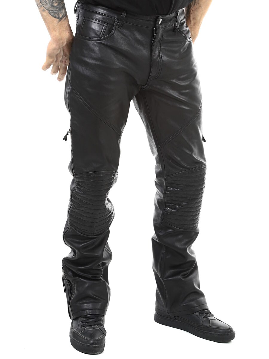 Stilfulde bukser i ægte fåreskind, som giver dem en blød og smidig fornemmelse, samtidig med at de bevarer et slidstærkt og langtidsholdbar kvalitet. De har fem klassiske lommer og lynlåse for enden af benene, hvilket giver en justerbar pasform. Detaljeret med lynlåse og polstrede knæ. Designet til motorcykelentusiaster og dem, der ønsker et edgy look!