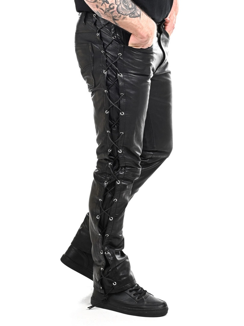Bukser i ægte læder og med et tyndt fór samt snøring på siderne, så bredden kan justeres. Den har tre lomer fortil, to lommer bagpå samt stropper i taljen. De lukkes ved hjælp af lynlås samt en knap i metal.