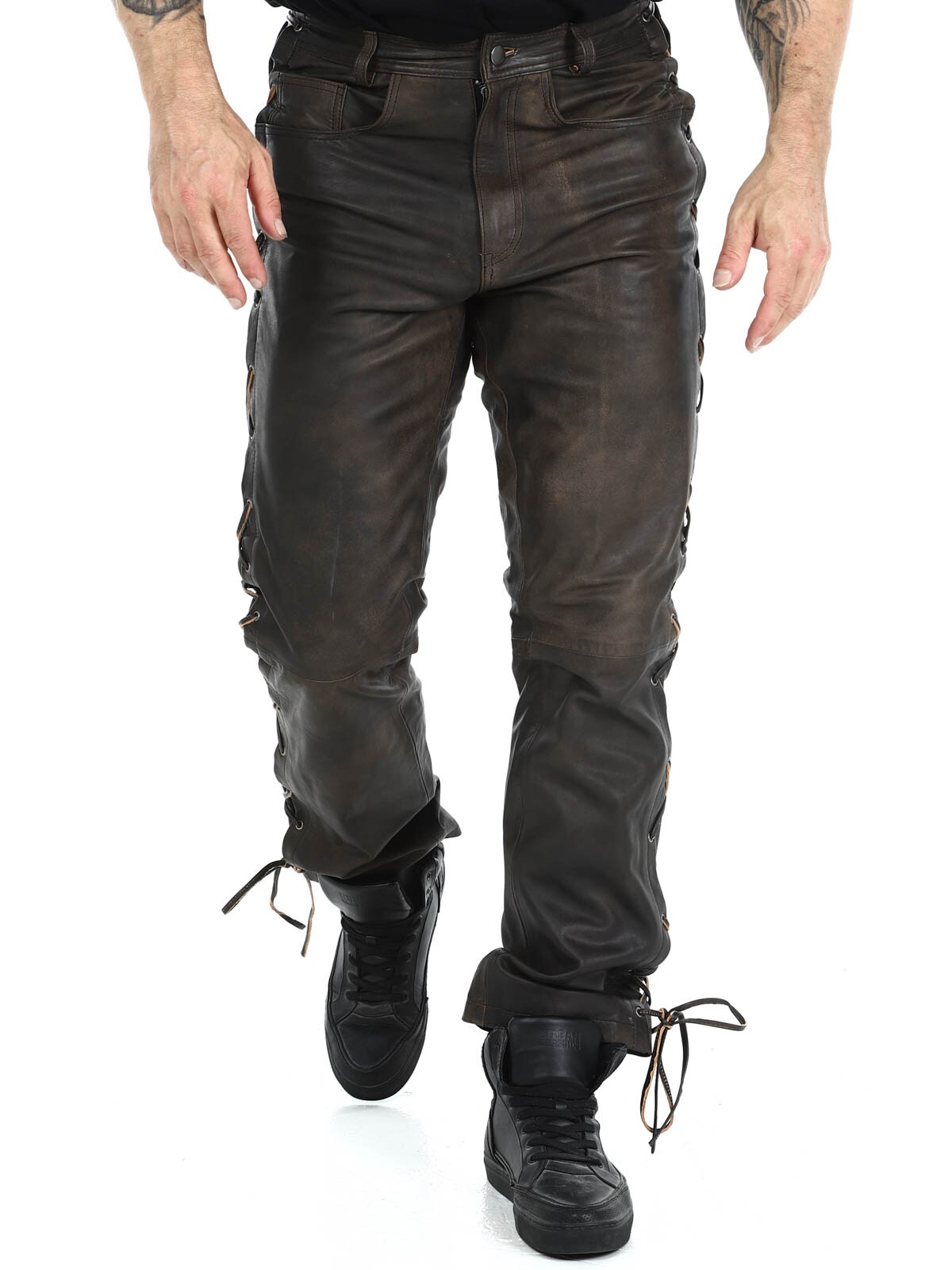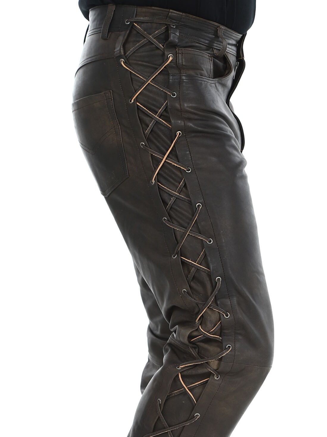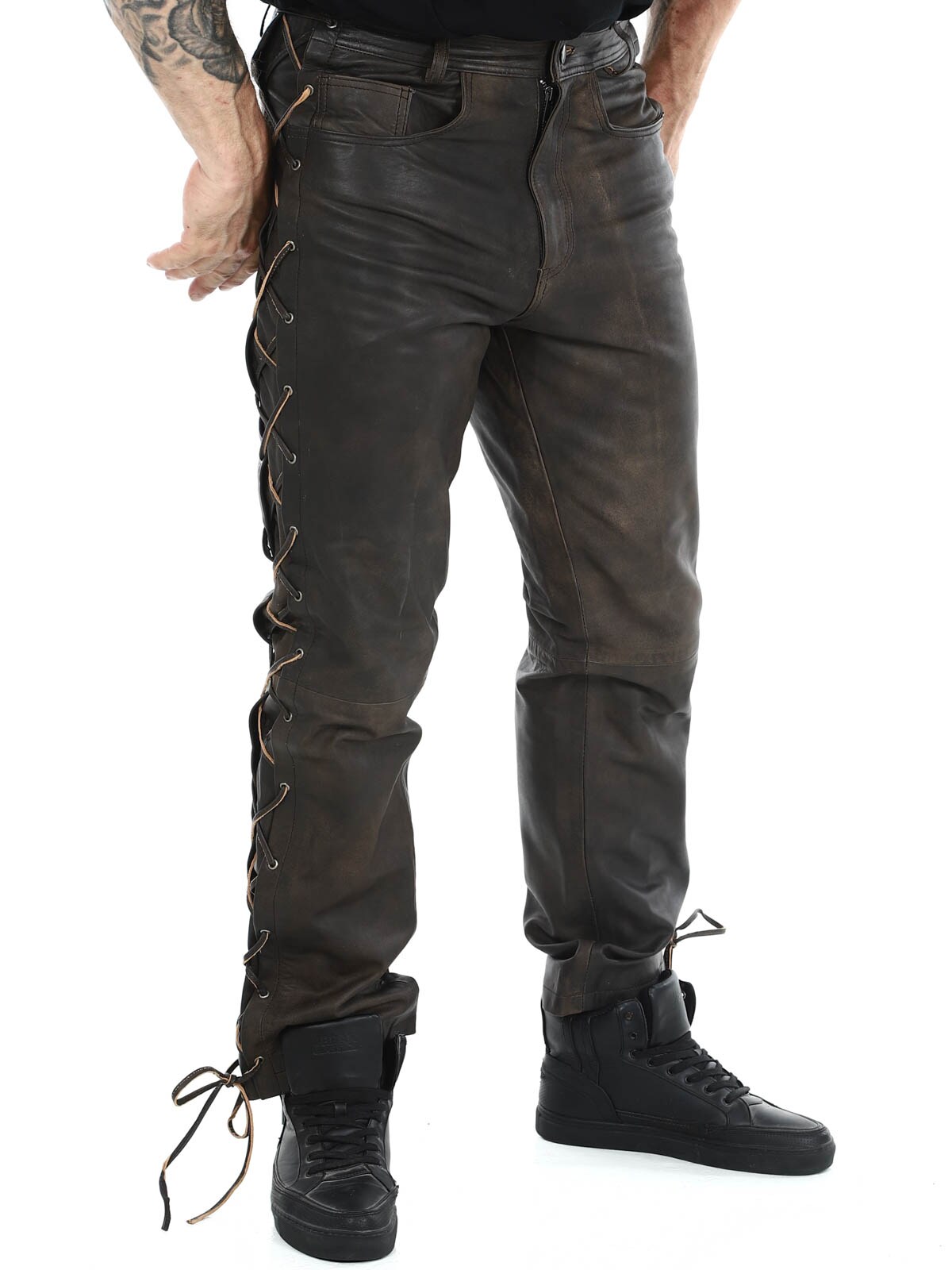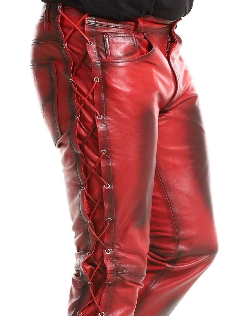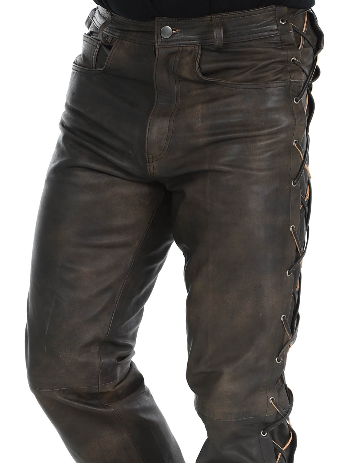 Bukser i ægte læder og med et tyndt fór samt snøring på siderne, så bredden kan justeres. Den har tre lomer fortil, to lommer bagpå samt stropper i taljen. De lukkes ved hjælp af lynlås samt en knap i metal.