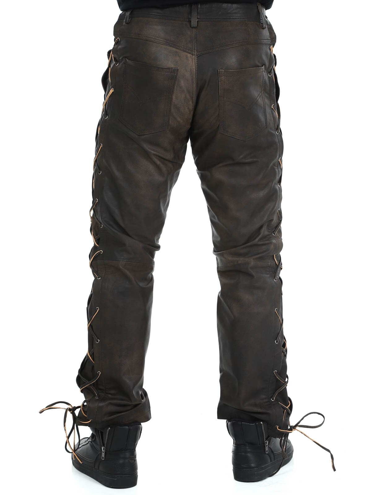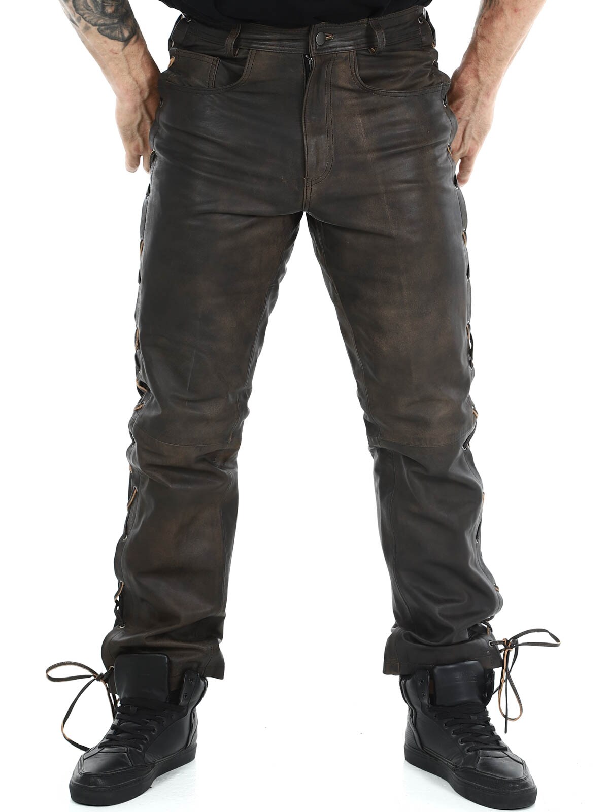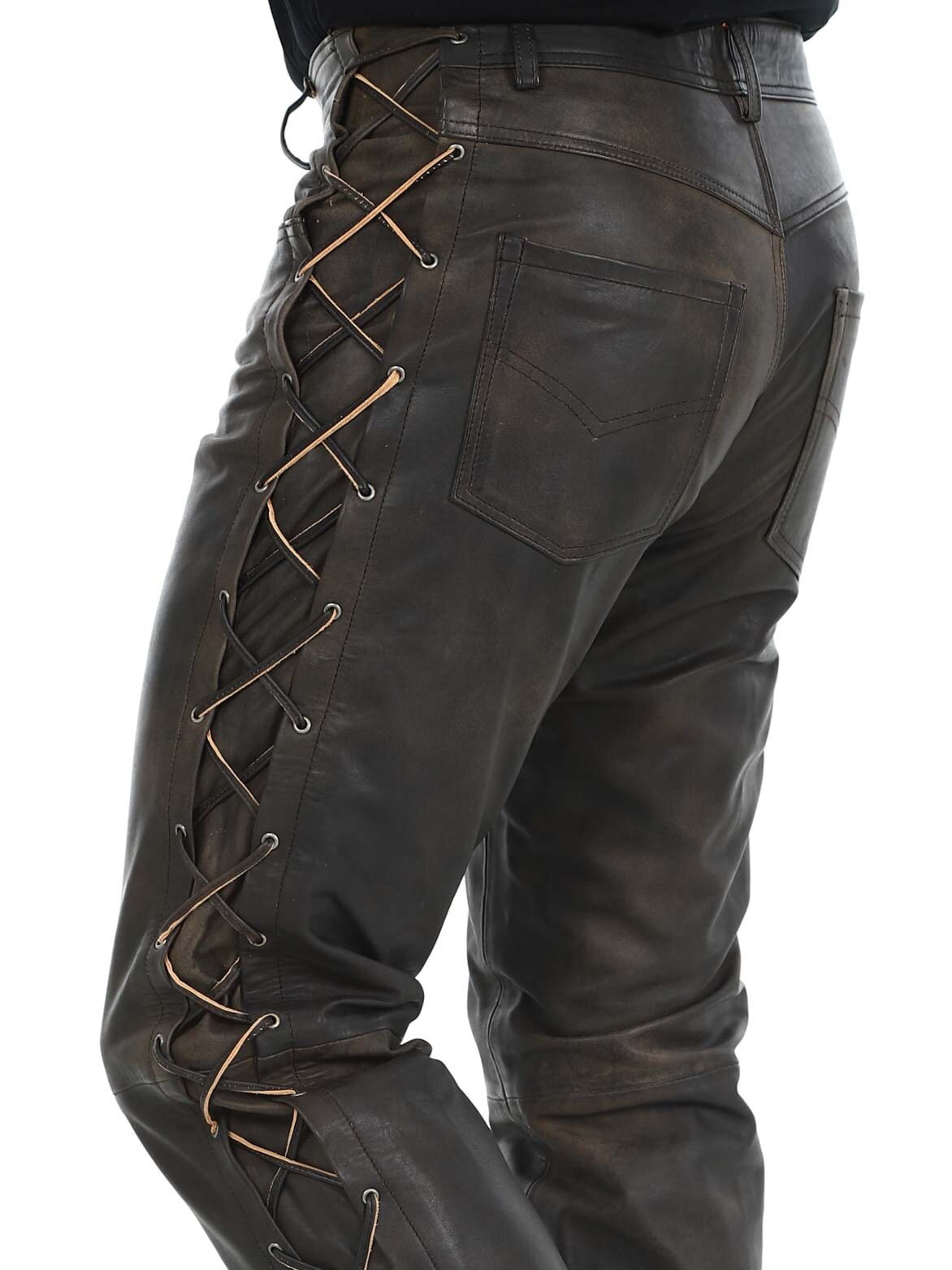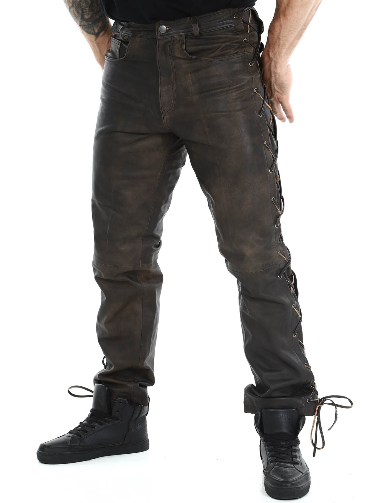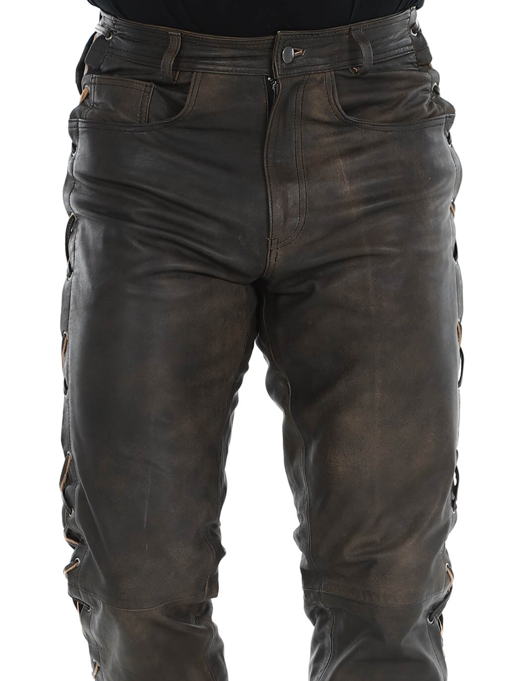 Bukser i ægte læder og med et tyndt fór samt snøring på siderne, så bredden kan justeres. Den har tre lomer fortil, to lommer bagpå samt stropper i taljen. De lukkes ved hjælp af lynlås samt en knap i metal.