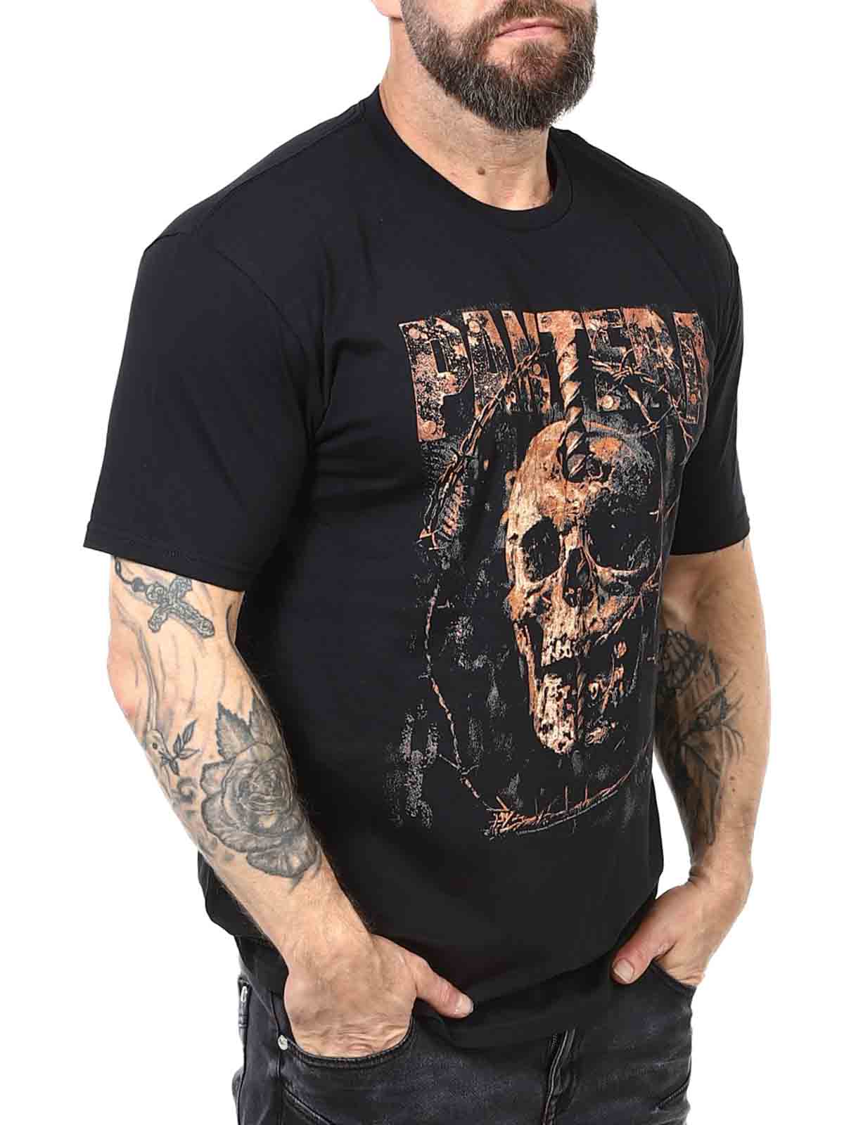 Denne T-shirt er et must-have for fans af legendariske Pantera, med et stort, markant print på forsiden, der hylder bandets rå energi. Printet består af det klassiske "PANTERA"-logo over et detaljeret, skræmmende kranie omgivet af pigtråd. På ryggen er der det kraftfulde budskab "STRONGER THAN ALL" i en slidt, matchende stil, også indpakket i pigtråd. Fremstillet i 100% blød bomuld og skåret i en Regular Fit, tilbyder denne T-shirt både komfort og et autentisk rock-look. Perfekt til koncerter, festivaler eller som en del af din hverdags metal-garderobe.