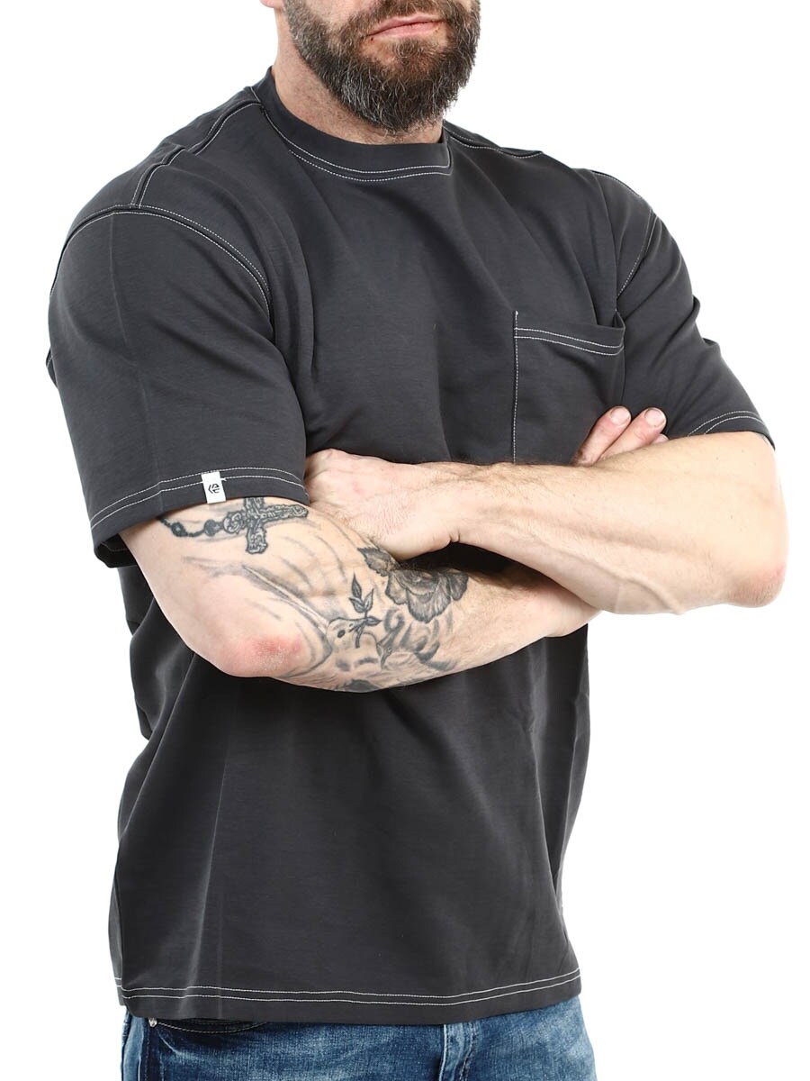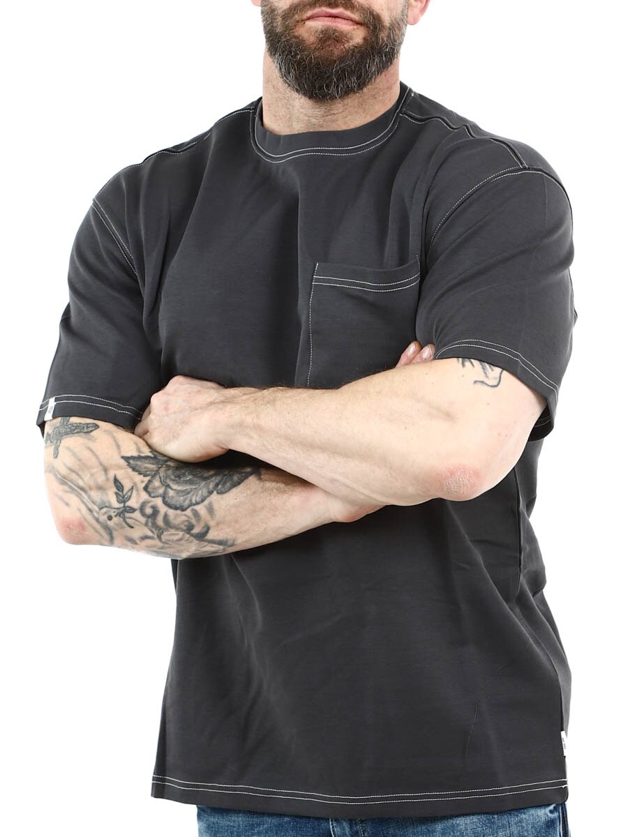 Stilren t-shirt i klassisk pasform med rund halsudskæring. Designet med markante hvide syninger og en åben brystlomme. Velegnet både til hverdagsbrug og som basis i et mere elegant outfit.