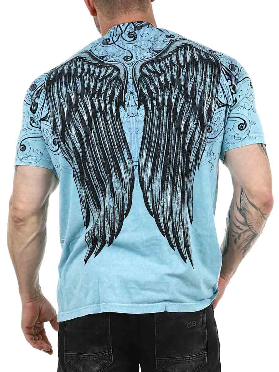 En unik t-shirt med tydelig rockattitude. Den blå, vasket base kombineres med et stort vingemotiv foran og bagpå, hvilket skaber et kraftfuldt helhedsindtryk. Perfekt til dig, der vil have en t-shirt, der virkelig skiller sig ud!