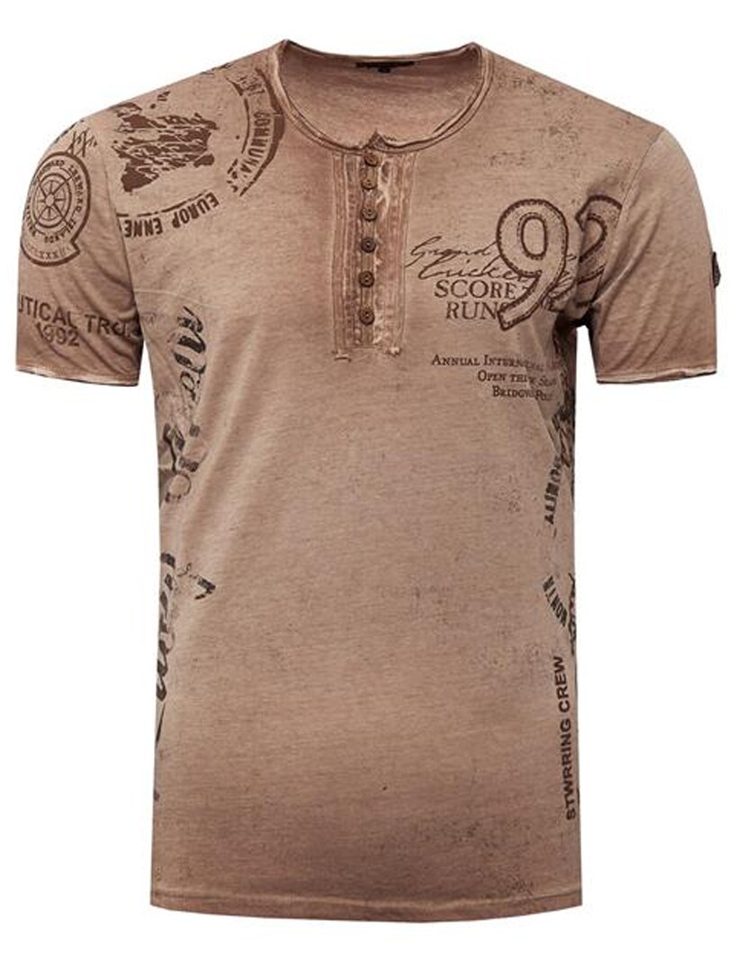 Cool t-shirt i 100 % bomuldsmateriale. T-shirten har seks brune knapper i halsen, et grå tryk med tekst og en lille brun lap på venstre ærme.