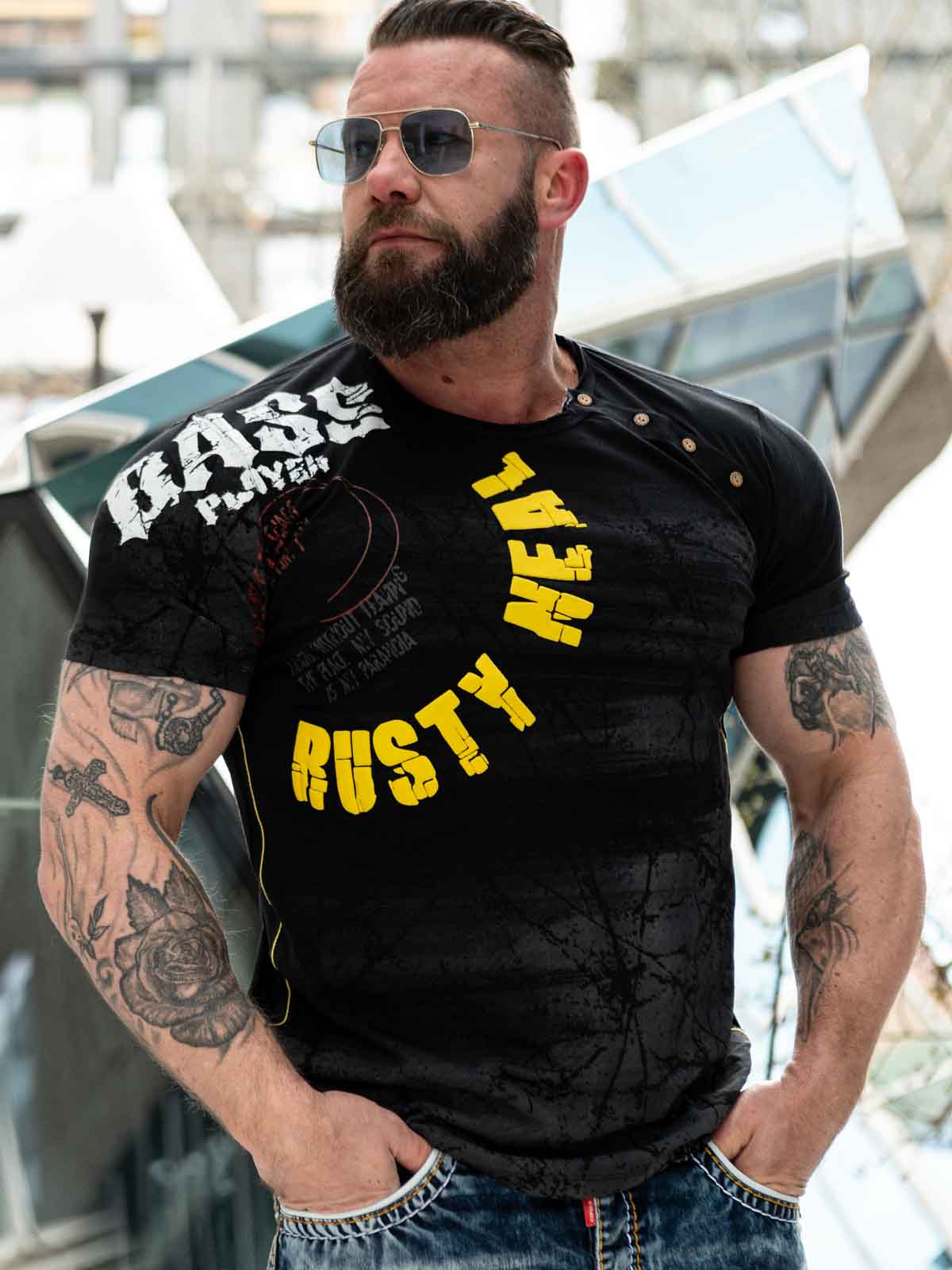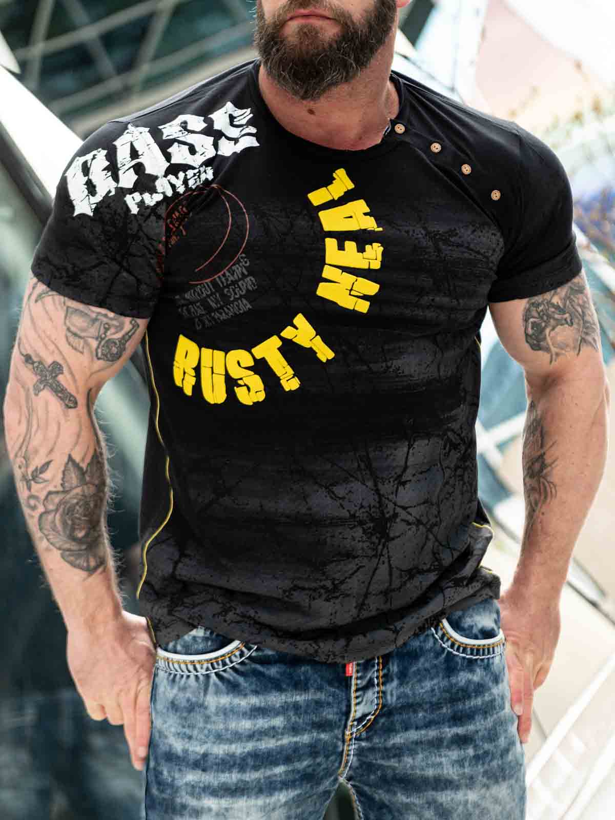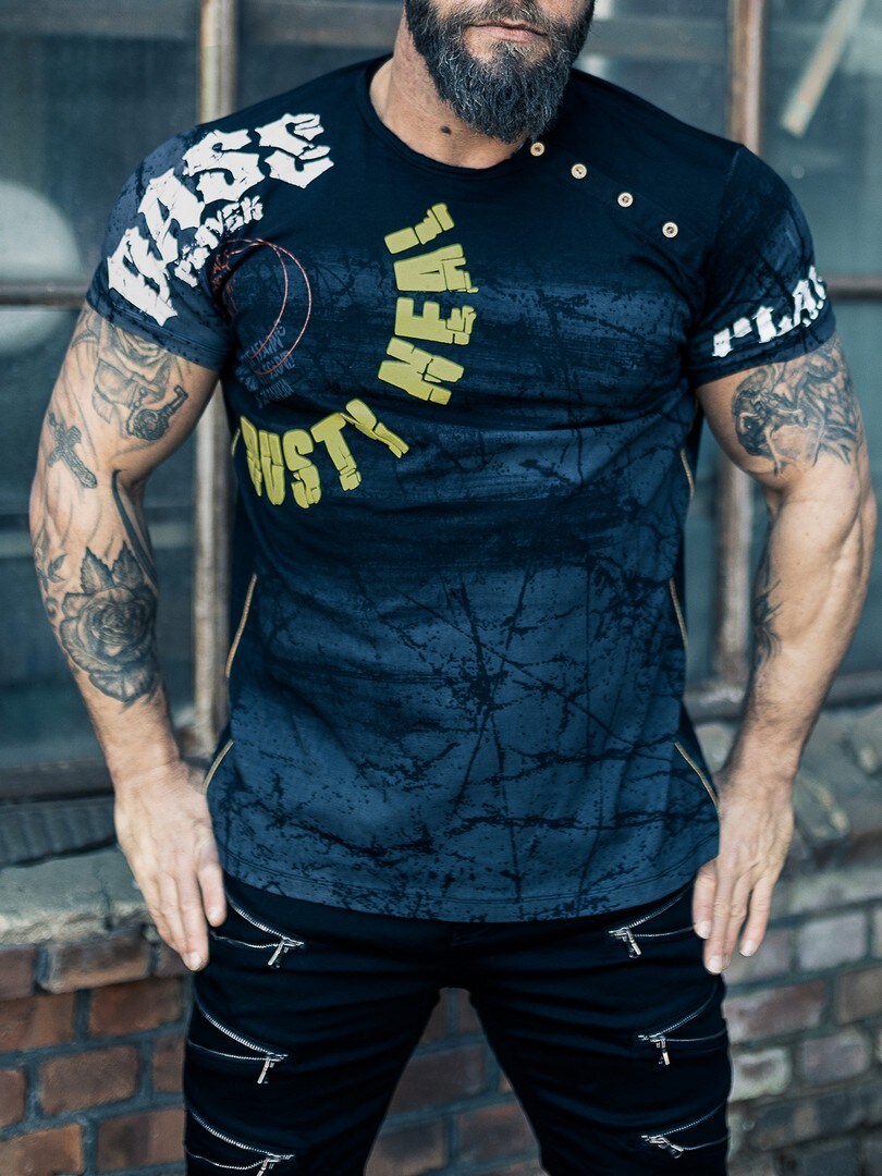 Unik t-shirt med flotte detaljer som 3D-print og mønster. Knapperne ved den afrundede hals kan knappes op og dermed give en større halsudskæring. Trykt motiv på forsiden, findes flere farvevariationer!