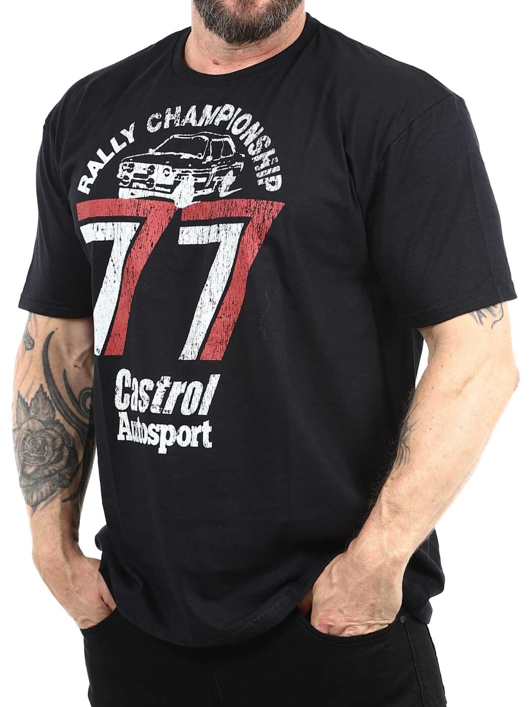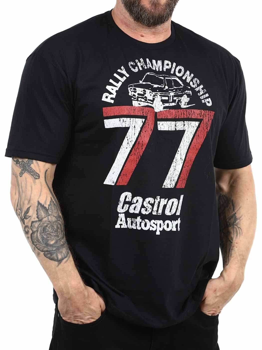 Vis din passion for motorsport med denne retro-inspirerede t-shirt. Den sorte t-shirt har et stort tryk fortil med ordene ""Rally Championship 77"" og ""Castrol Autosport"", suppleret med en klassisk rallybil i en vintage-stil. Perfekt til bilentusiaster og streetwear-fans, der ønsker at kunne bære en t-shirt med både stil og historie.