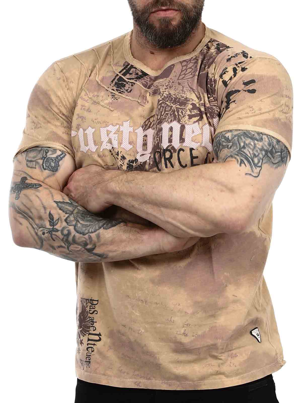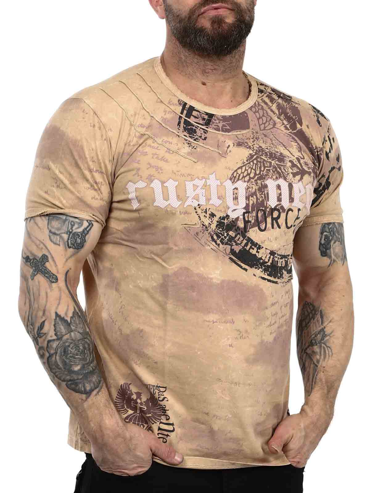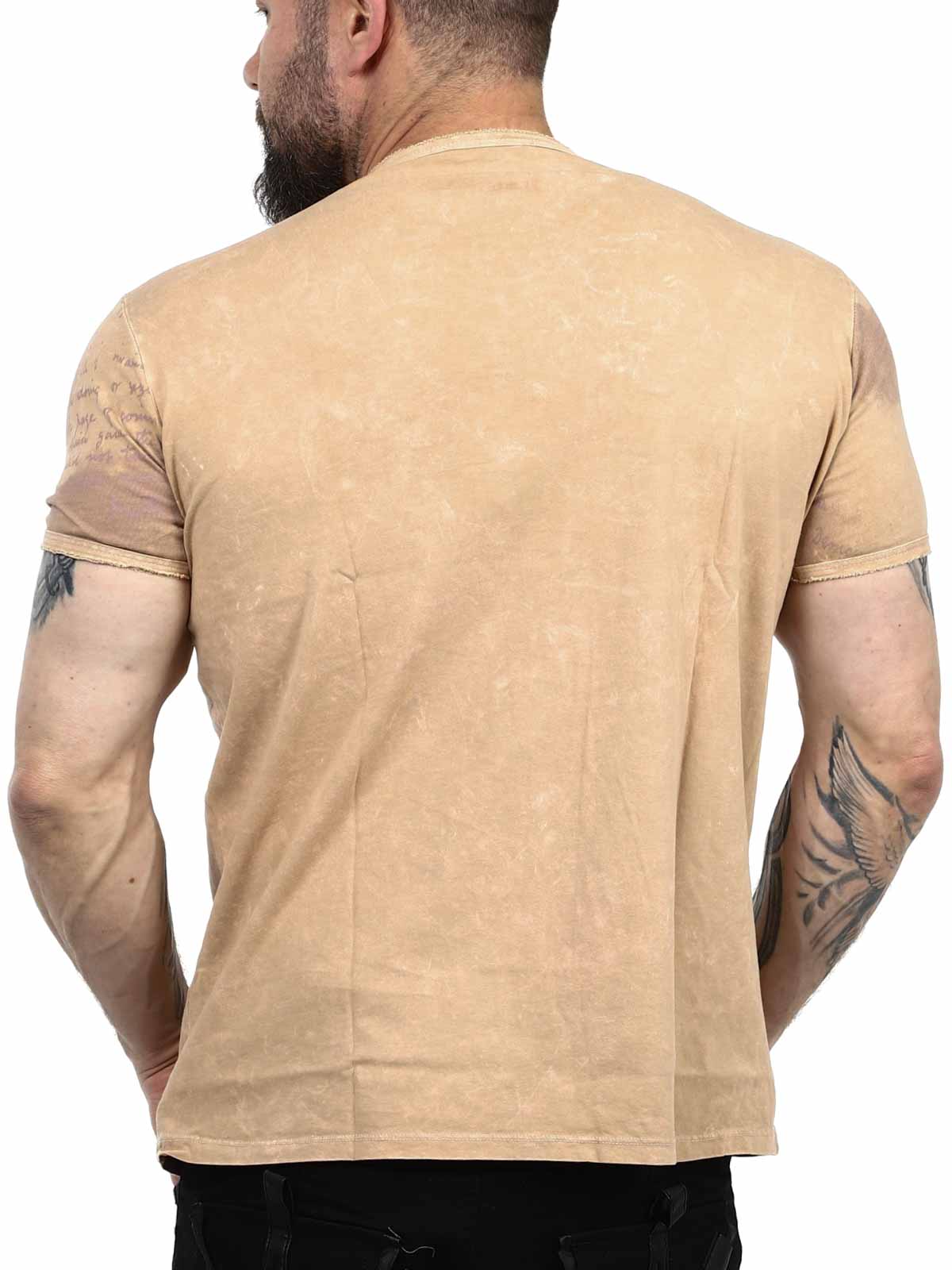 Orange t-shirt fremstillet af et 100% bomuldsmateriale. Den er rigtt dekoreet med mørke farvenuancer, teksttryk og cool dobbelte kanter i stof. Nederst fortil findes der en lille trekantet lap i stof med et sort logo. Halsenn er rund.