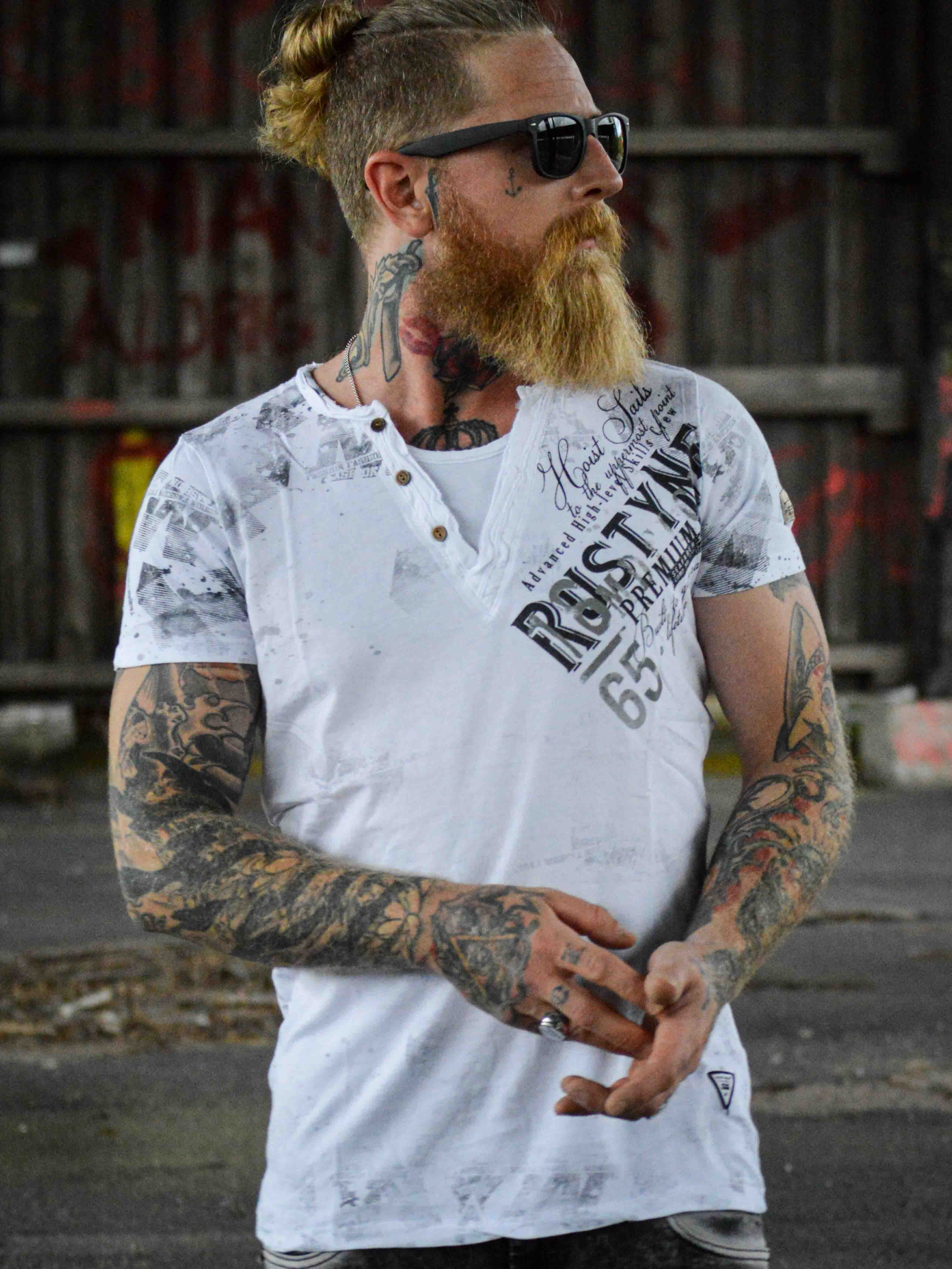 Hvid t-shirt med mørke effekter og teksttryk i sort og grå. T-shirten er detaljeret med knapper ved halsens åbnning, og hertil kommer en lap i stof med logoet på venstre ærme, og yderligere en ved linningen forneden. T-shirten er fremstillet i et behageligt bomuldsmateriale, hvor der er stræk i, hvilket gør, at den sidder fantastisk på kroppen.