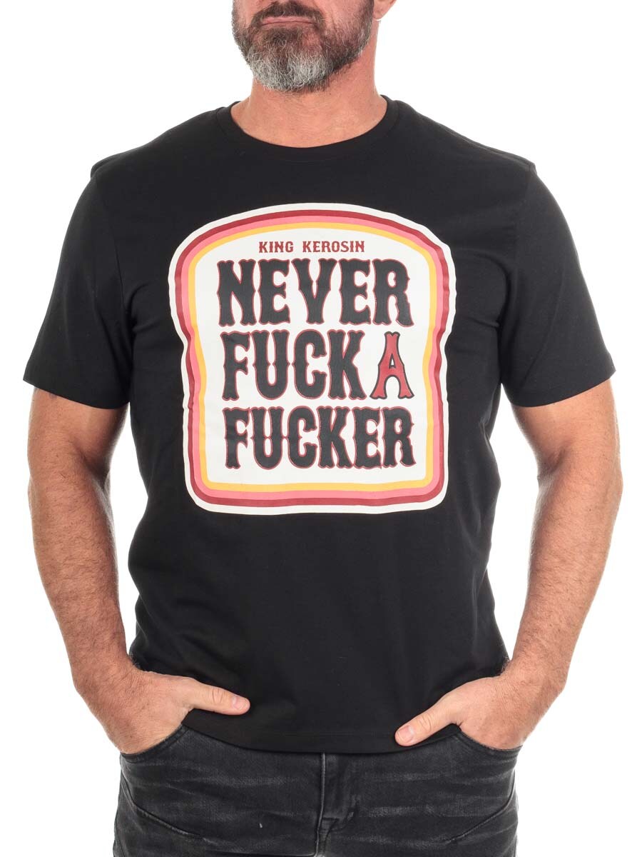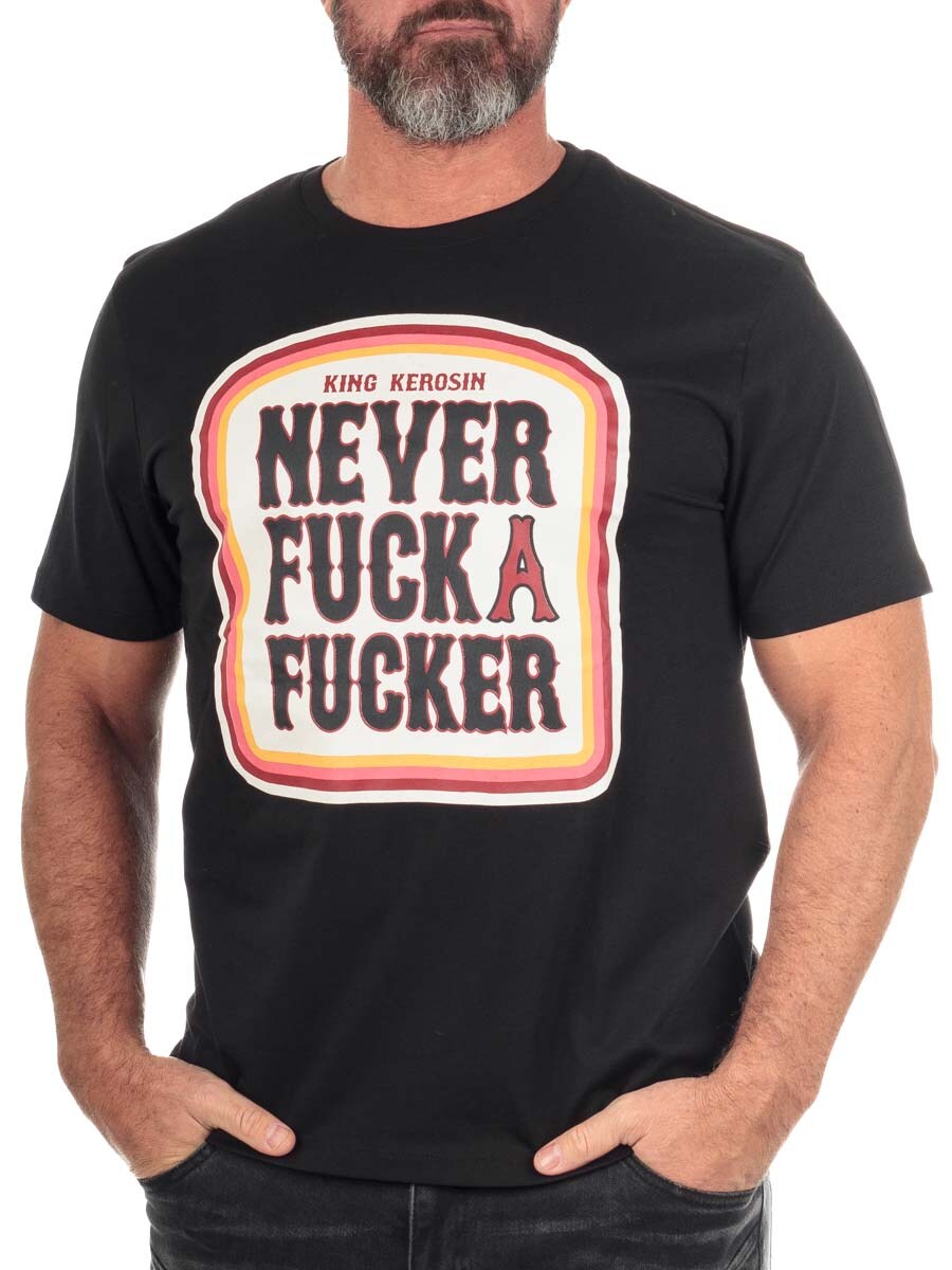Sort t-shirt med stort tryk foran med teksten "Never Fck A Fcker", der giver den perfekte kombination af ironi, attitude og rå stil. Et autentisk statement-plagg til dig, der tør stå ved dine holdninger og altid vil bære kompromisløs stil. Fremstillet i blød, slidstærk bomuld med klassisk pasform.