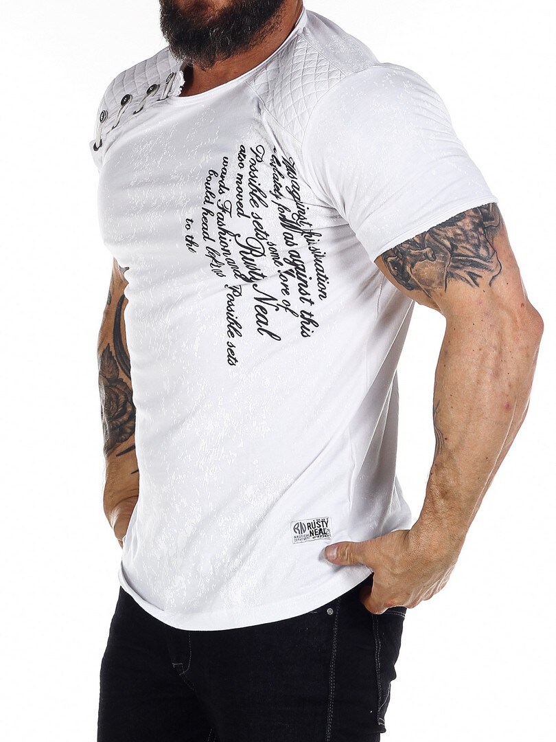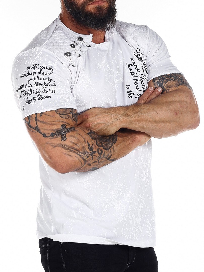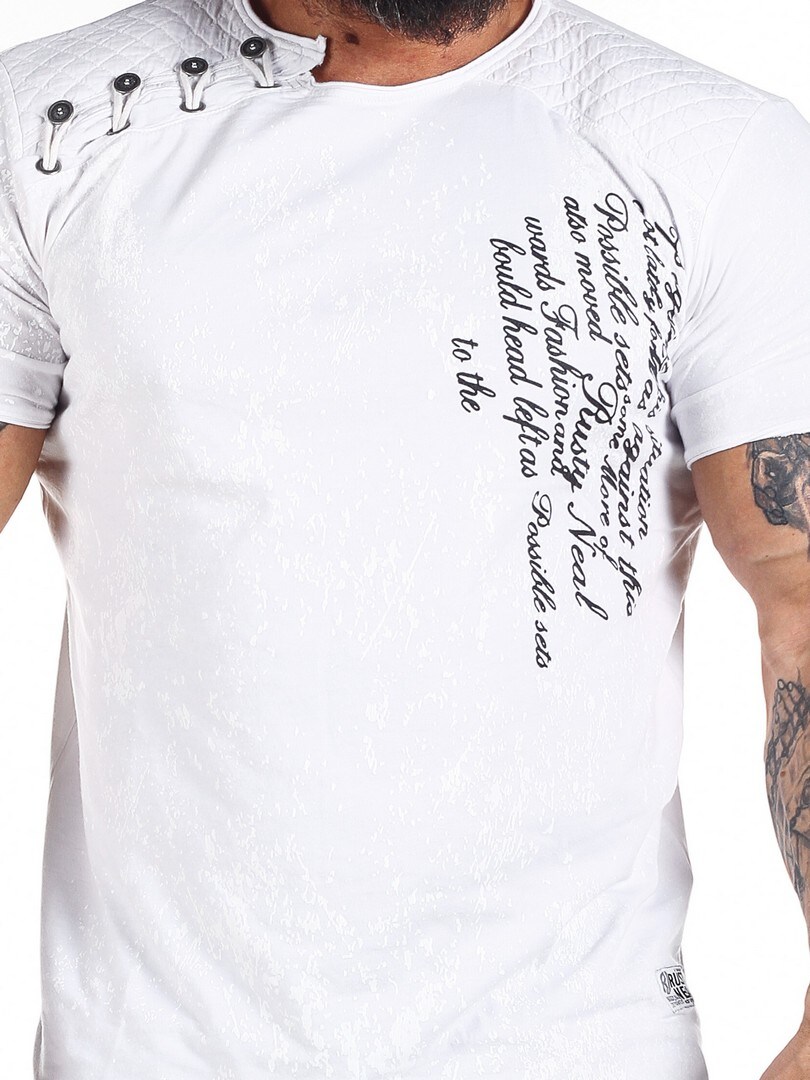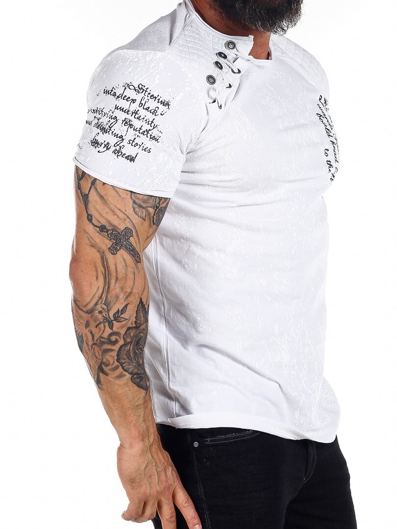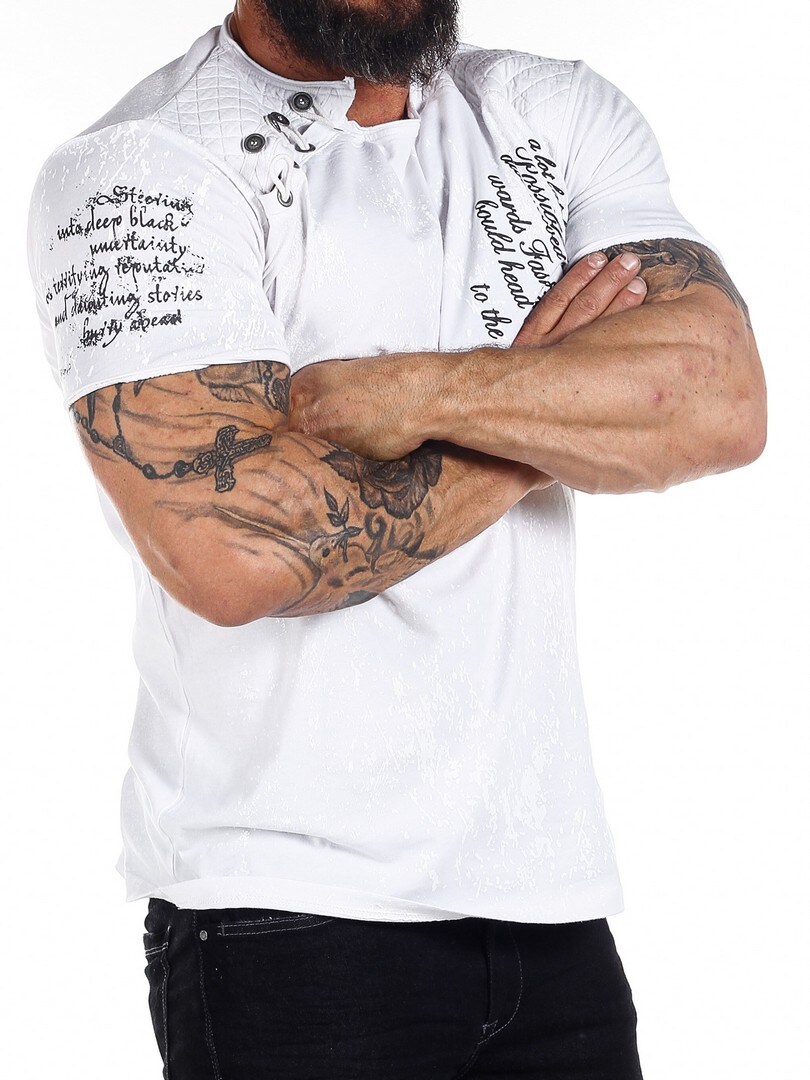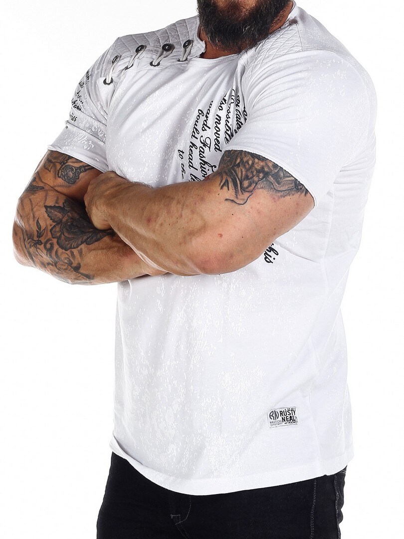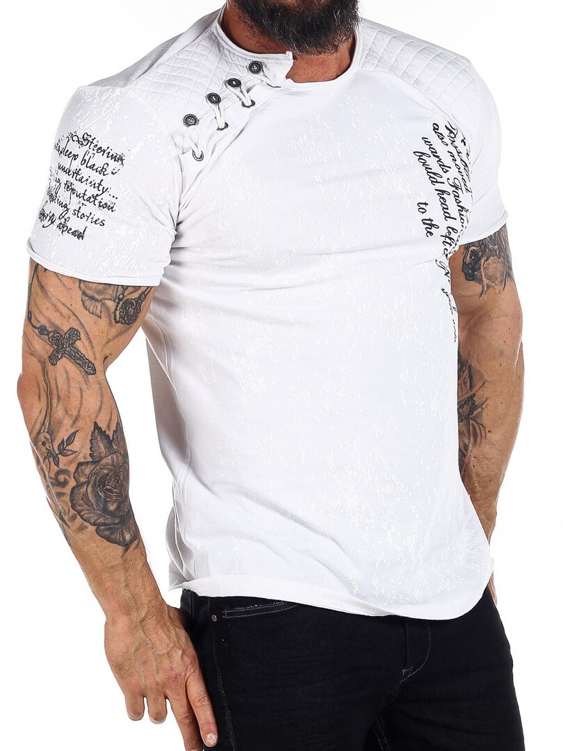 Mønstret t-shirt i bomuldsmateriale med stretch i. Teksttryk på venstre side af brystet og på den højre arm. Markerede skuldre med knapper og et ternet mønster, afrundet hals, rå kanter og en lap i stof med logoet i linningen forneden. Findes i flere farver!