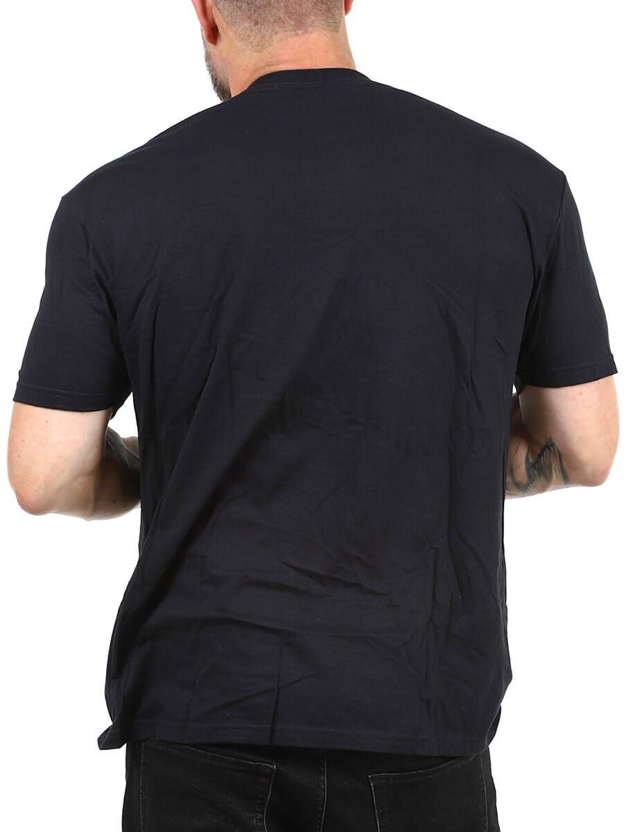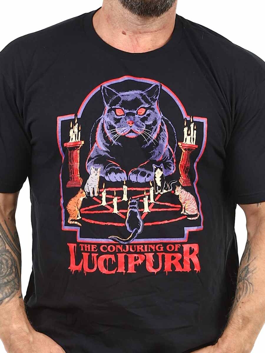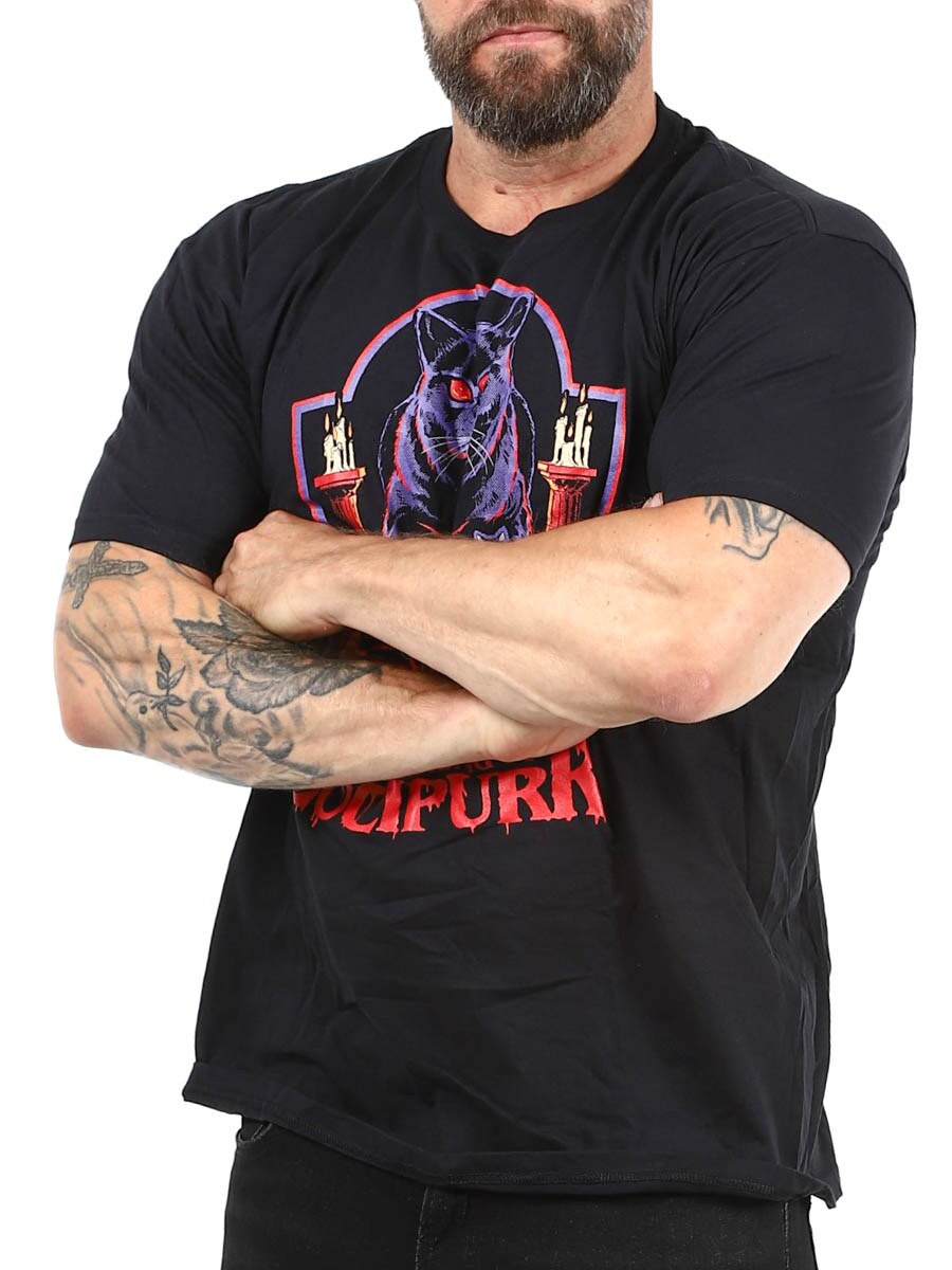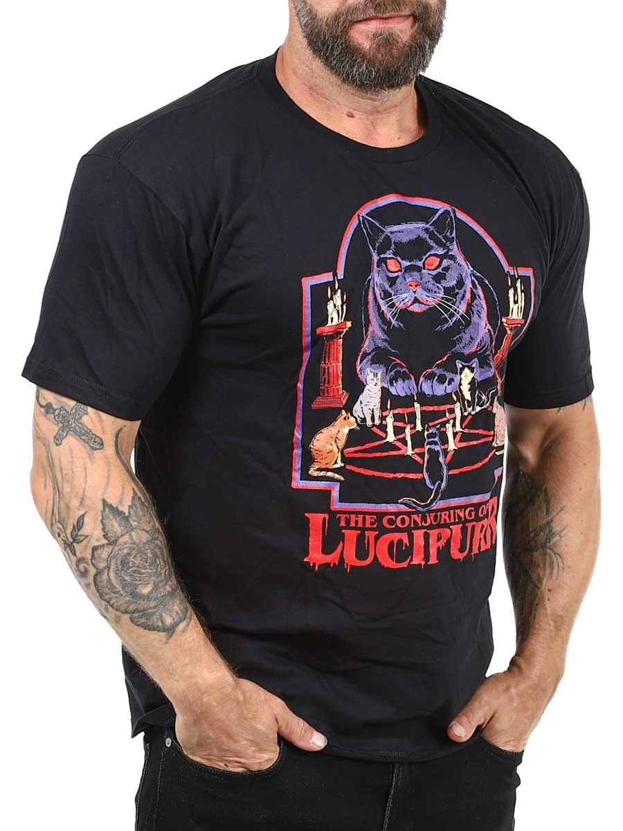 En sort T-shirt med et Lucipurr-tryk på forsiden, der blander mørk humor med kattecharme. Den har en klassisk pasform og en rund udskæring i halsen.