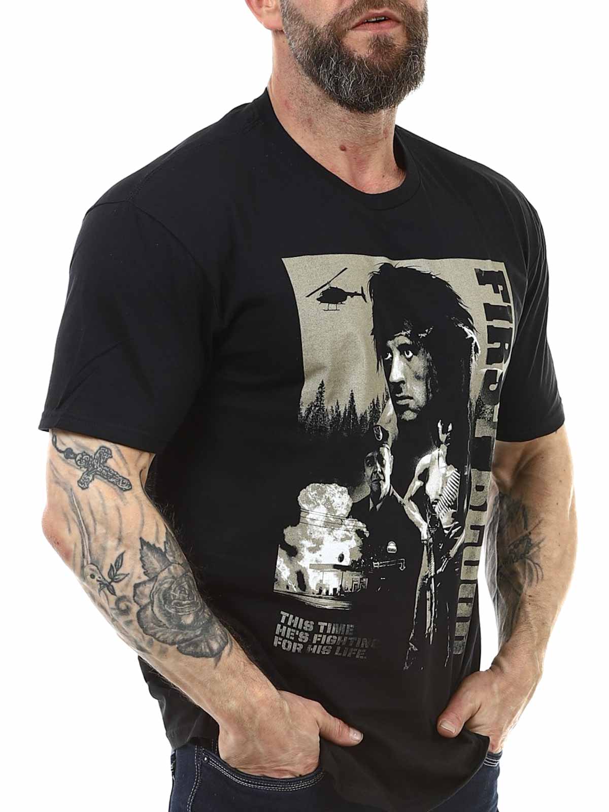 Hyld en af actionfilmens mest ikoniske karakterer med denne First Blood-inspirerede T-shirt, hvor John Rambo kæmper for overlevelse og frihed i en hård og uforglemmelig 80’er-actionhistorie. Printet giver en rå, nostalgisk følelse og passer perfekt til dig, der elsker actionklassikere og kultfilm. Den har klassisk pasform og rund halsudskæring.
