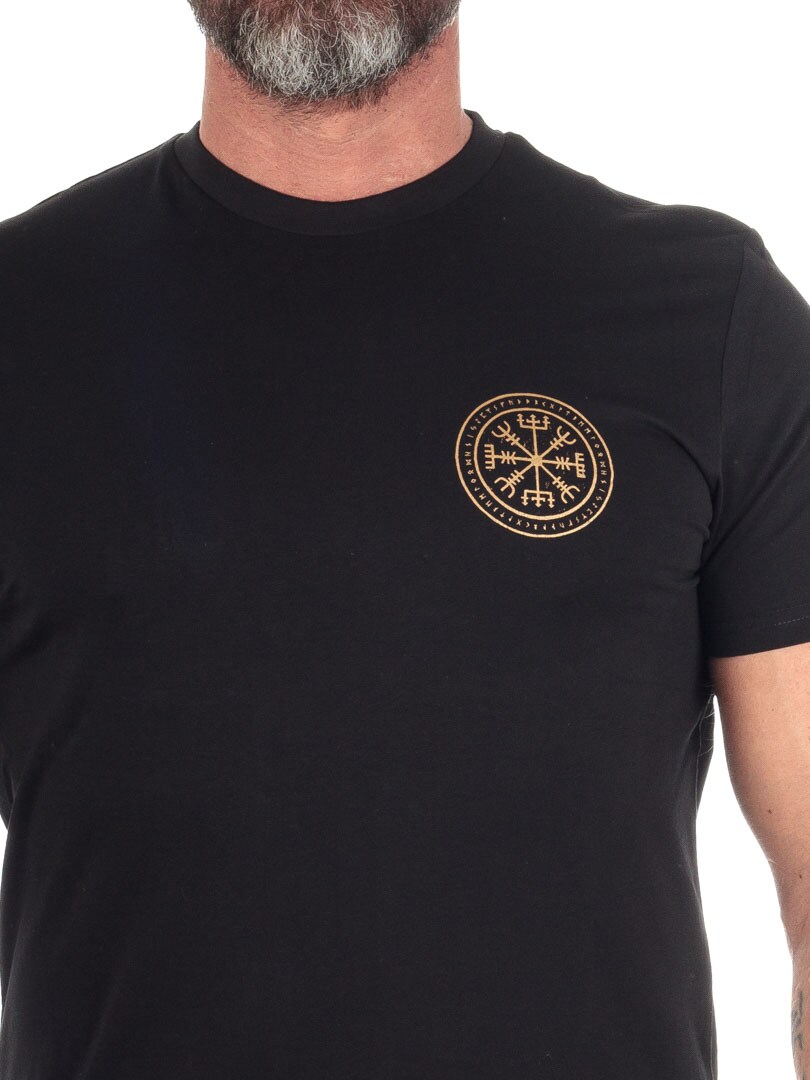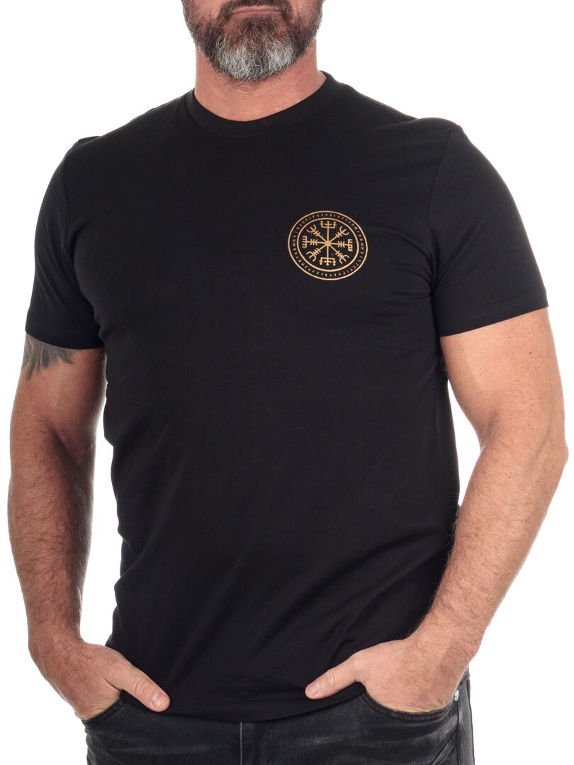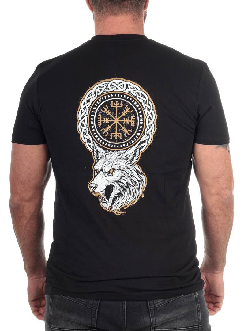 Denne t-shirt tilbyder en perfekt balance mellem attitude og stil med sit detaljerede design. Ryggen domineres af et stort, iøjnefaldende motiv forestillende Fenrisulven og et runekompas, mens brystet prydes af et mindre, guldfarvet symbol for et mere diskret look forfra. Trøjen har en klassisk pasform og en ribbet, rund halsudskæring, der gør den behagelig at bære. Den er fremstillet i 100% bomuld og kan kun købes hos RockDenim.