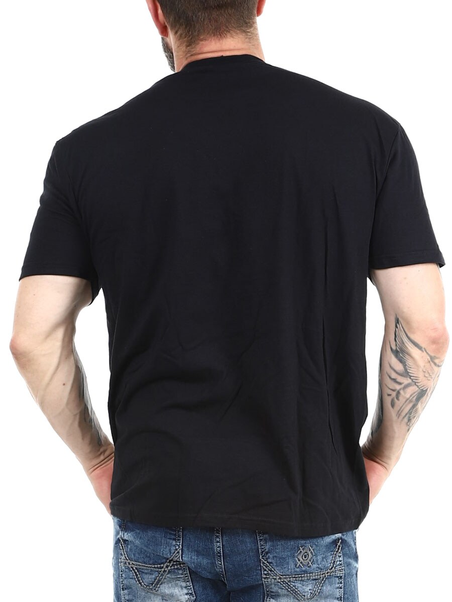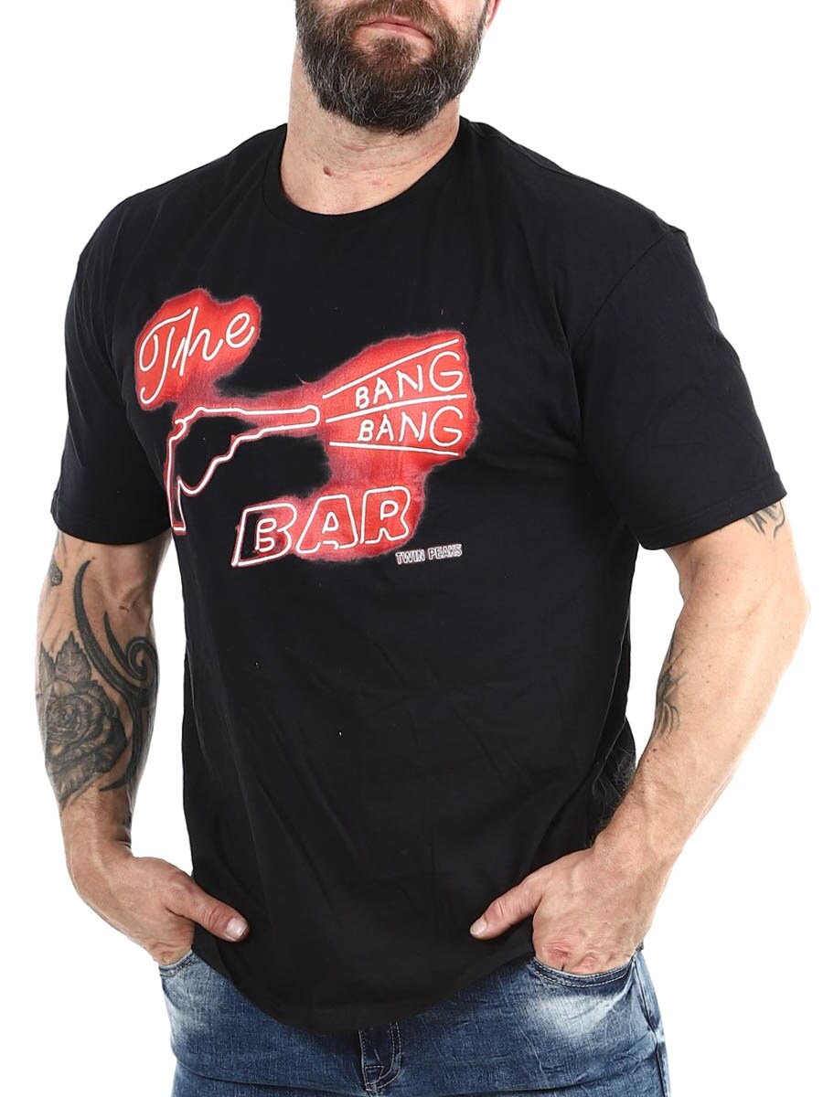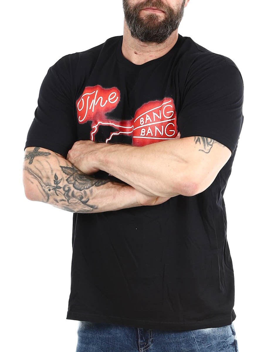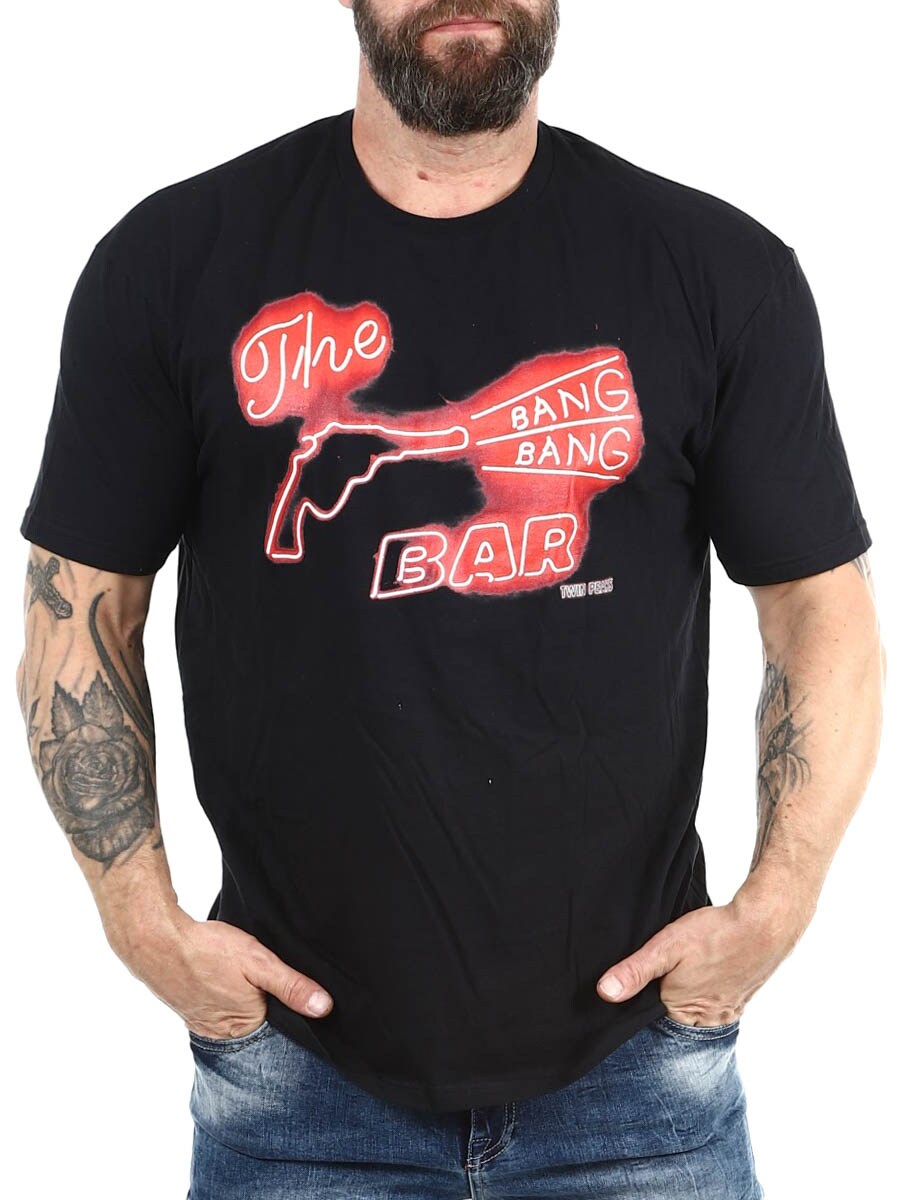 Sort t-shirt med retroinspireret neonprint, der forestiller en revolver og teksten "The Bang Bang Bar". Fremstillet af blødt bomuld med en behagelig pasform – perfekt til dem, der kan lide et vintage look med attitude.