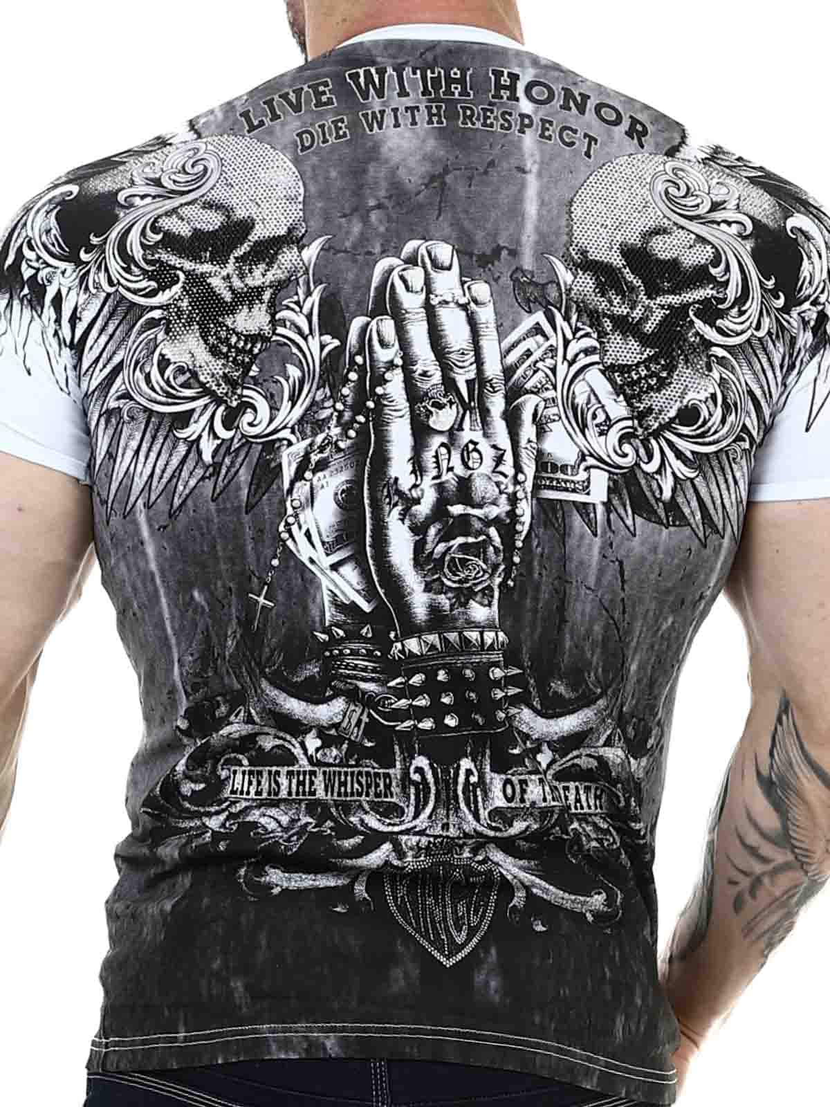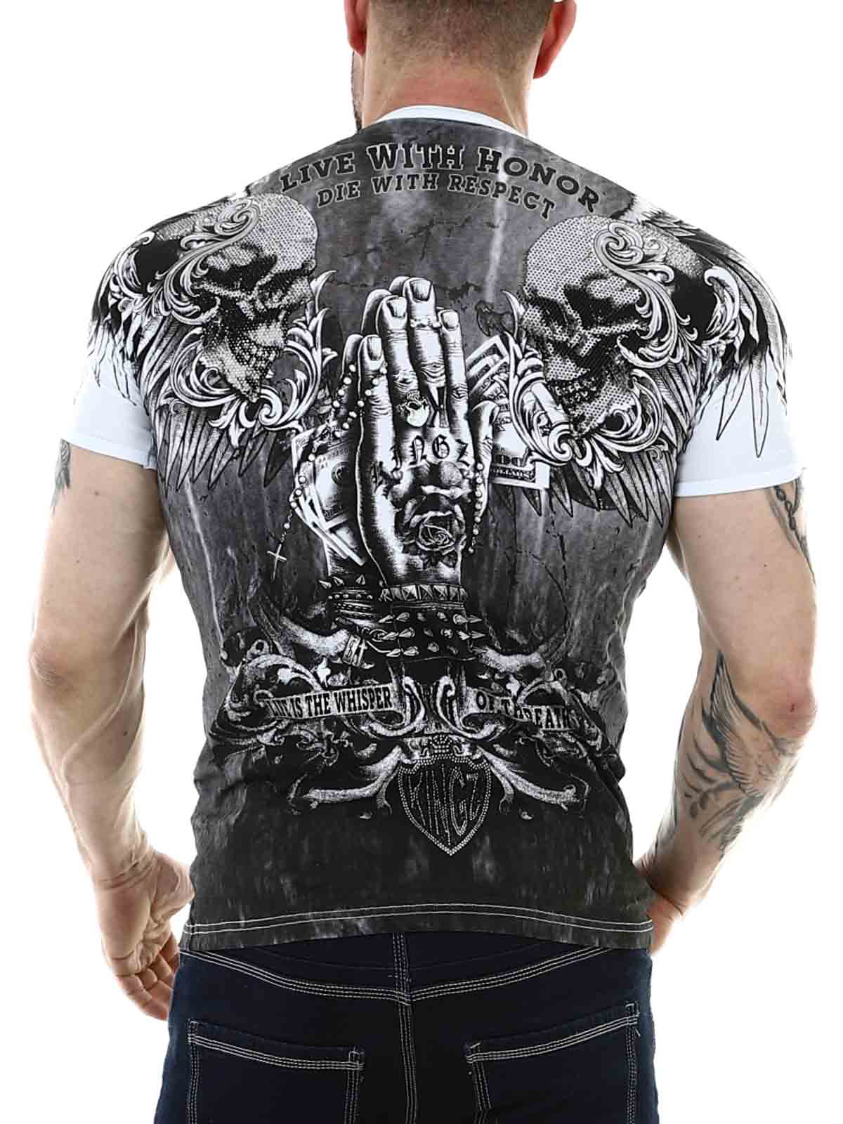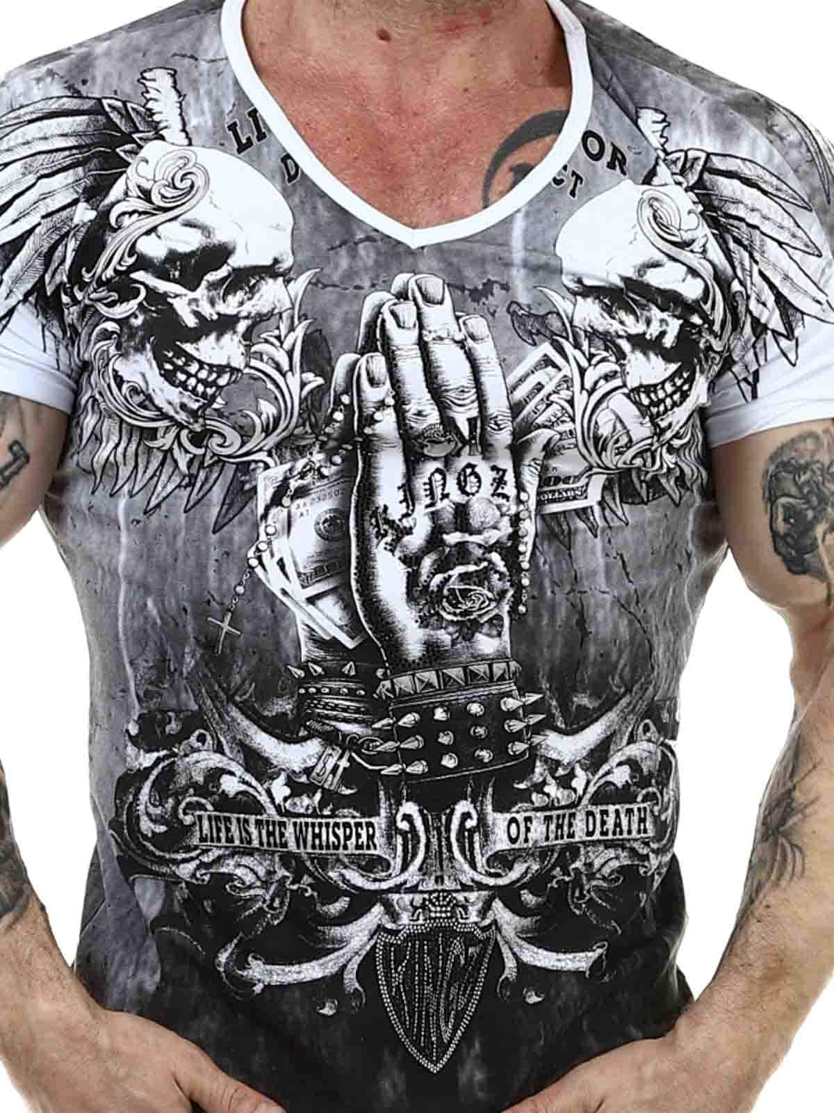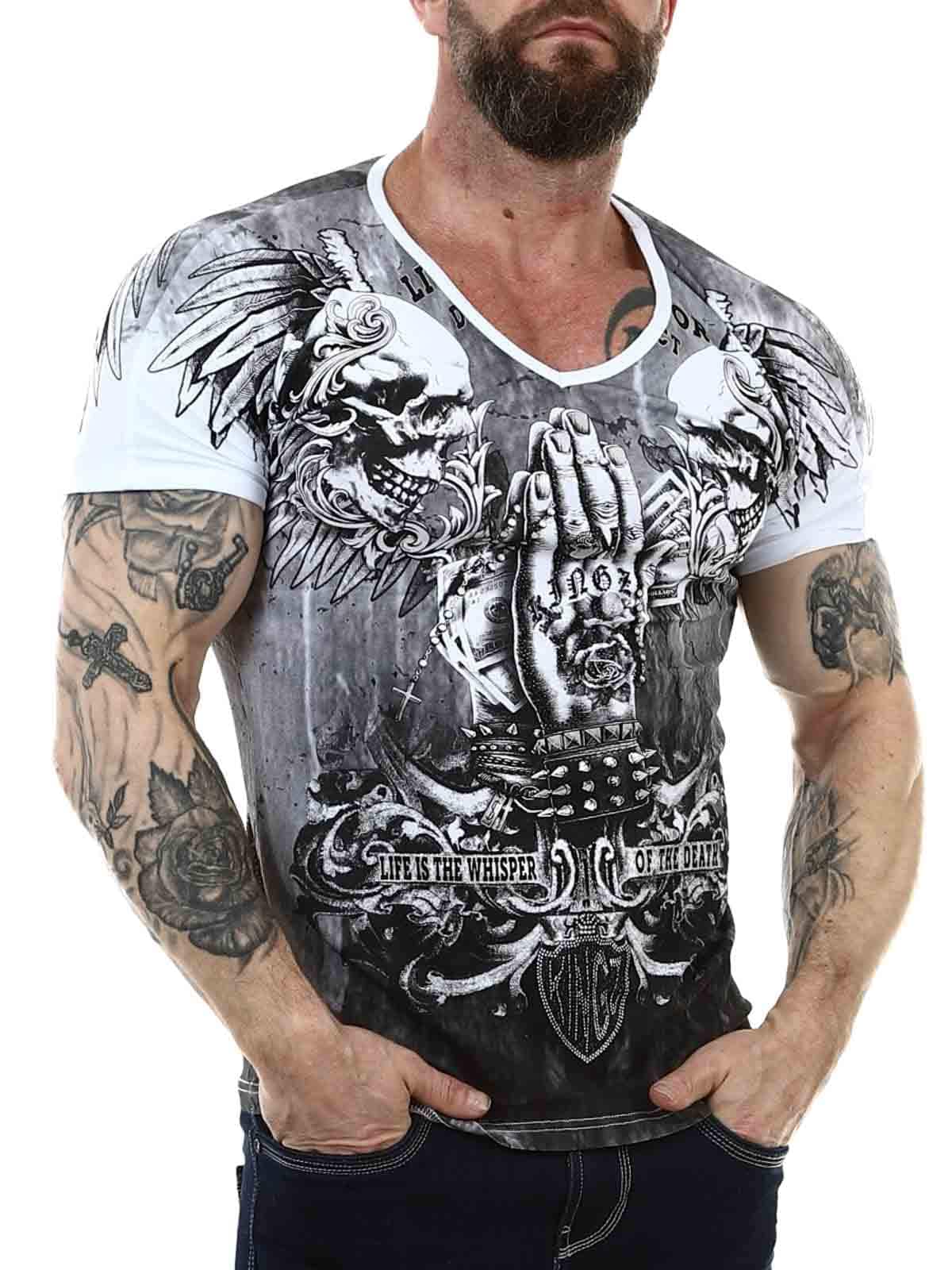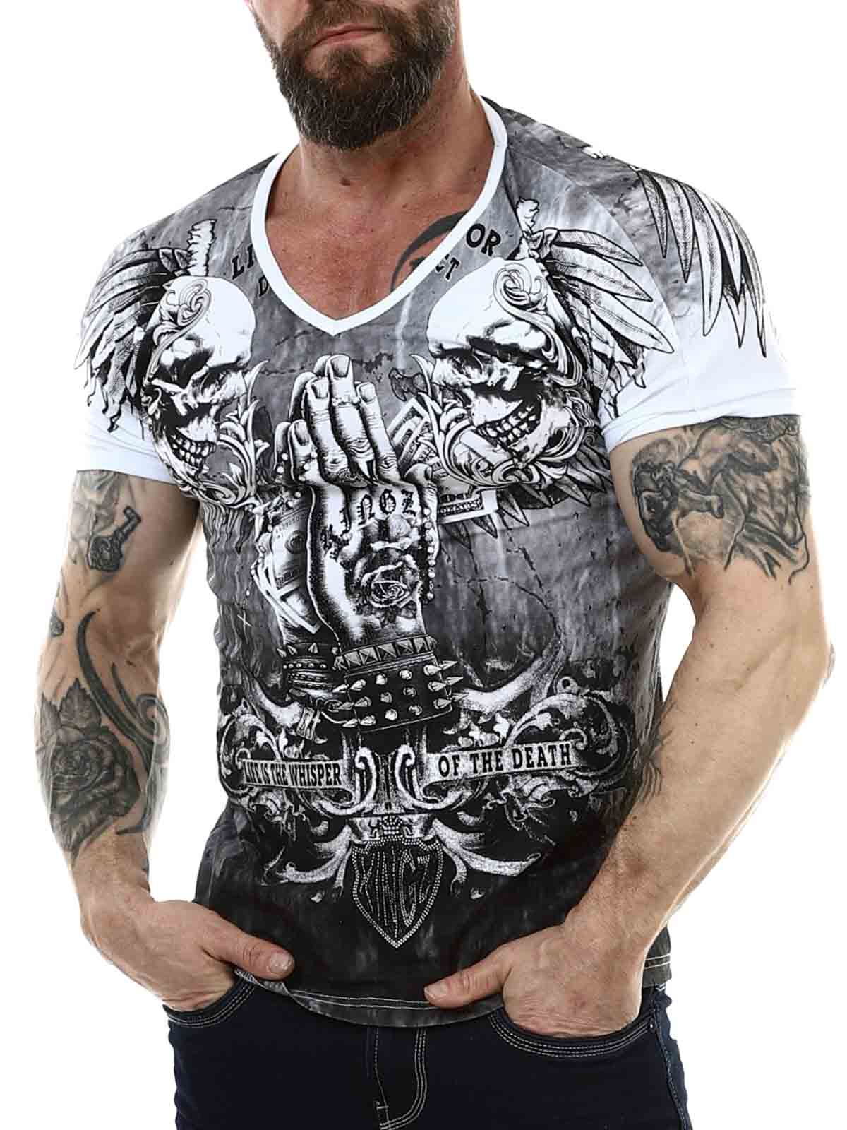 Hvid T-shirt med V-hals i behageligt bomuldsmateriale med let stretch. Rock-agtigt print i sort og sølv pryder både for- og bagside. Strasssten forstærker mønstrets effekt flere steder.