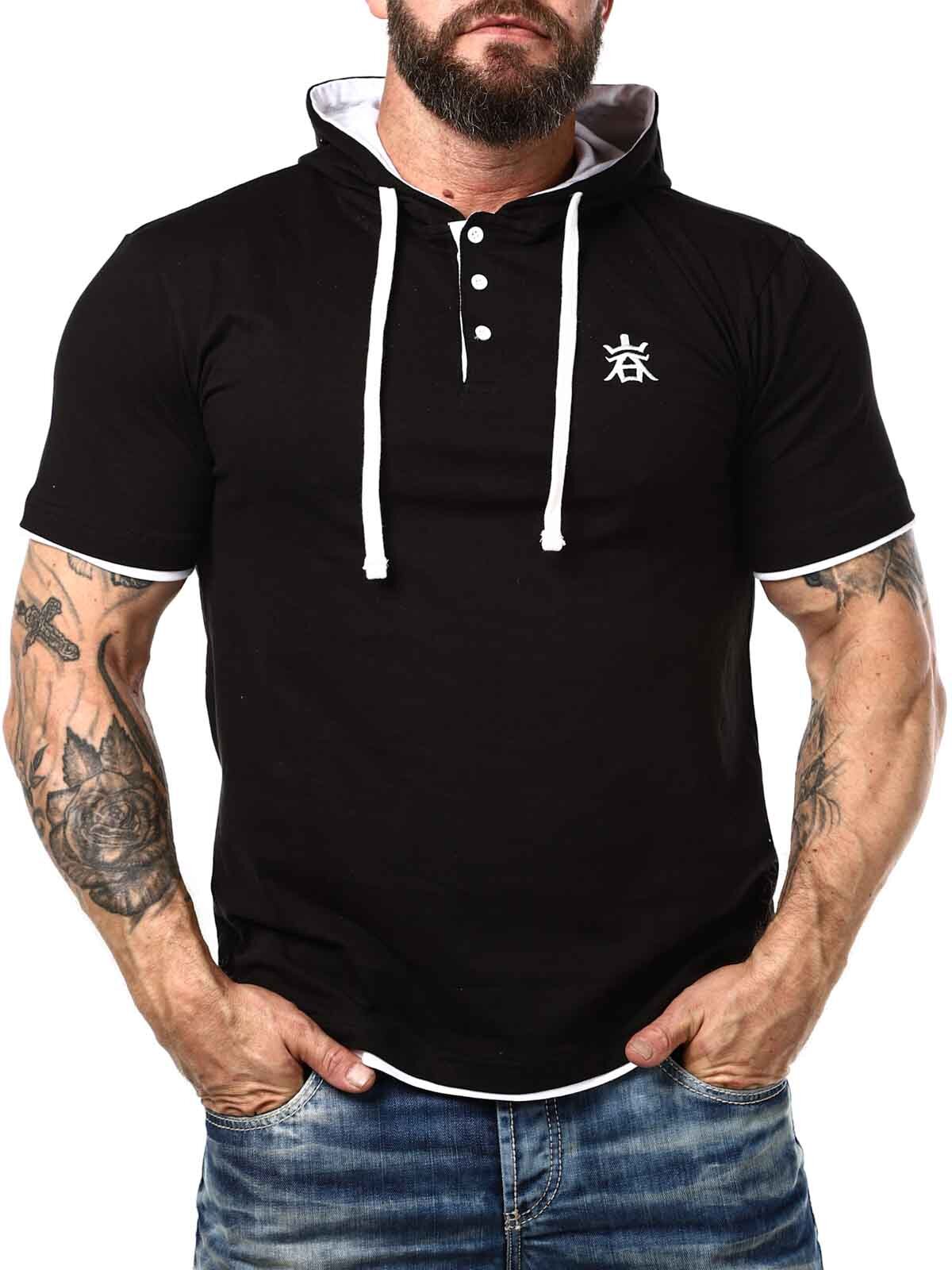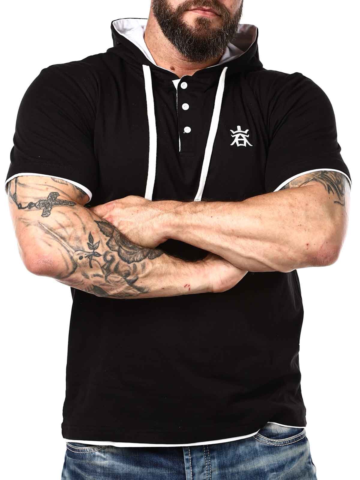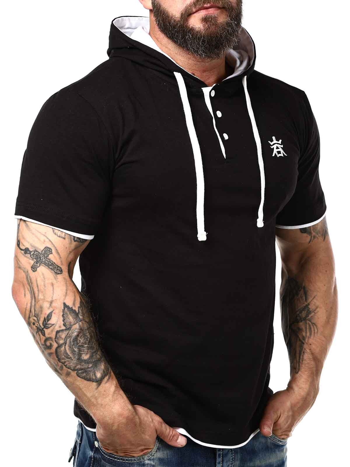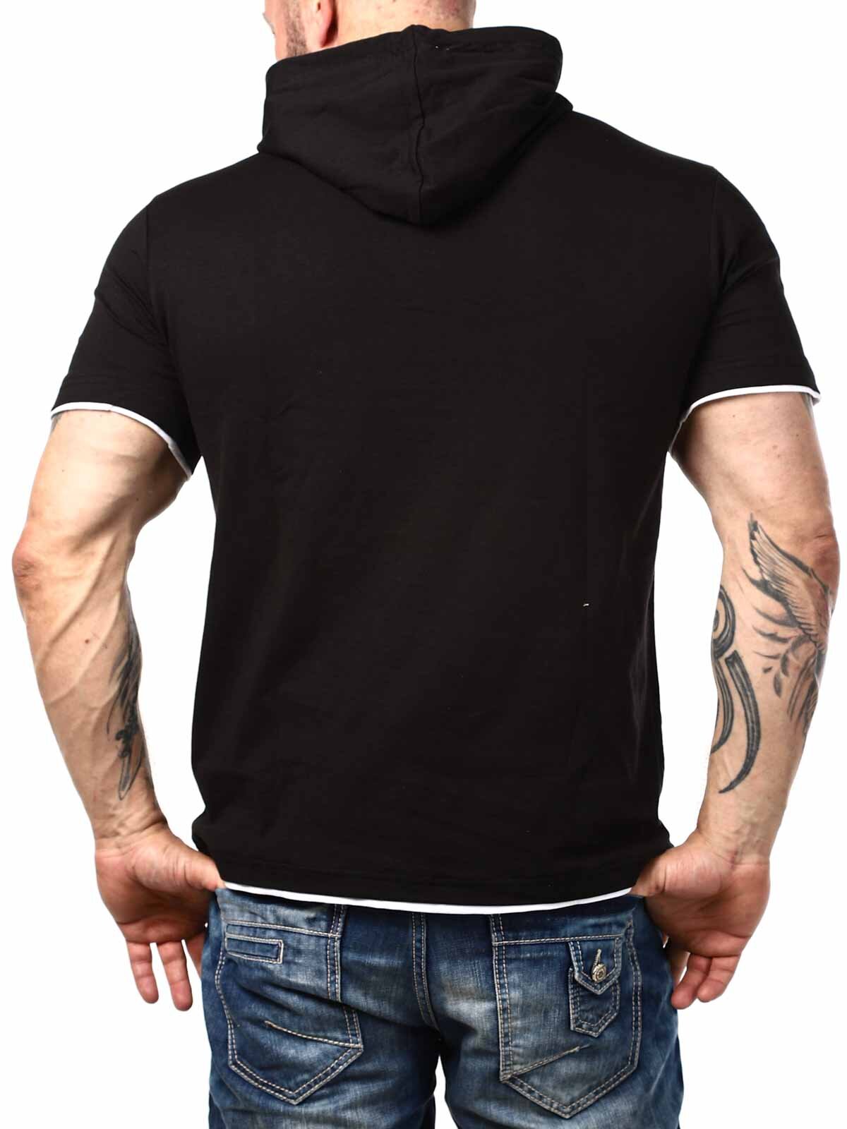 Sort t-shirt med hvide detaljer. Den har en klassisk pasform, og er designet med en hætte og en knaplukning fortil. Denne unikke t-shirt finder du kun hos RockDenim!