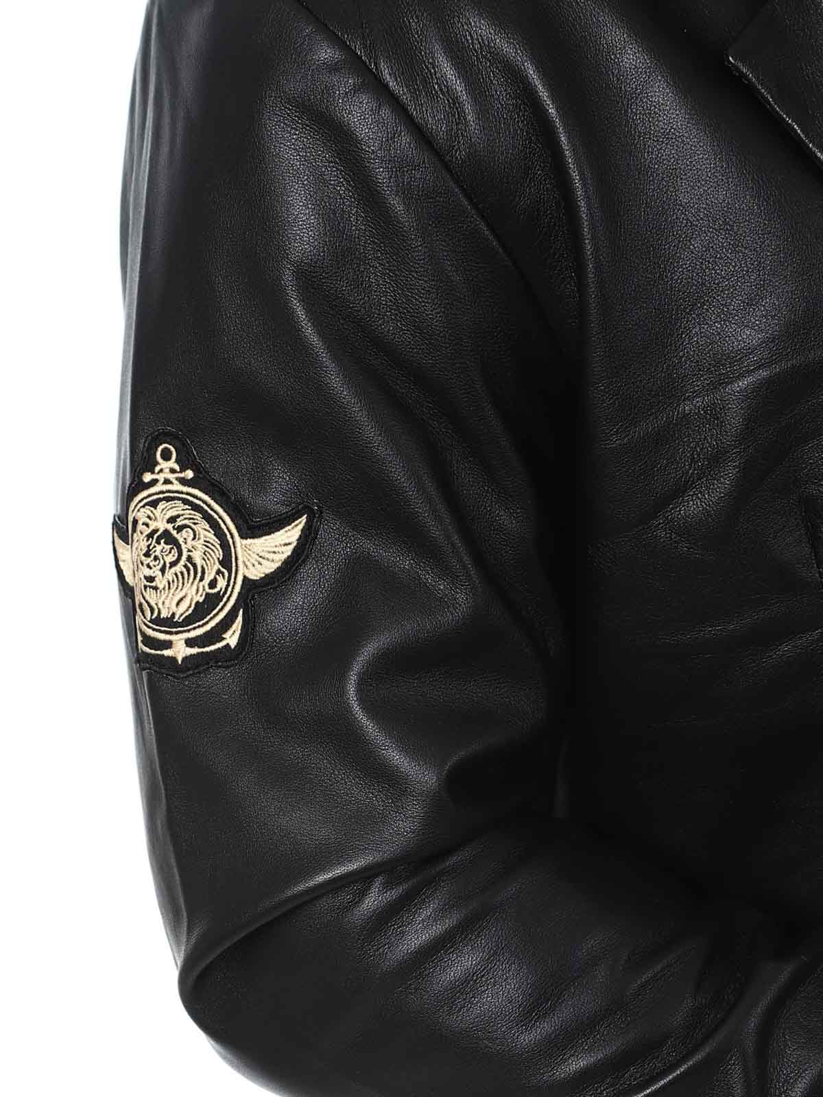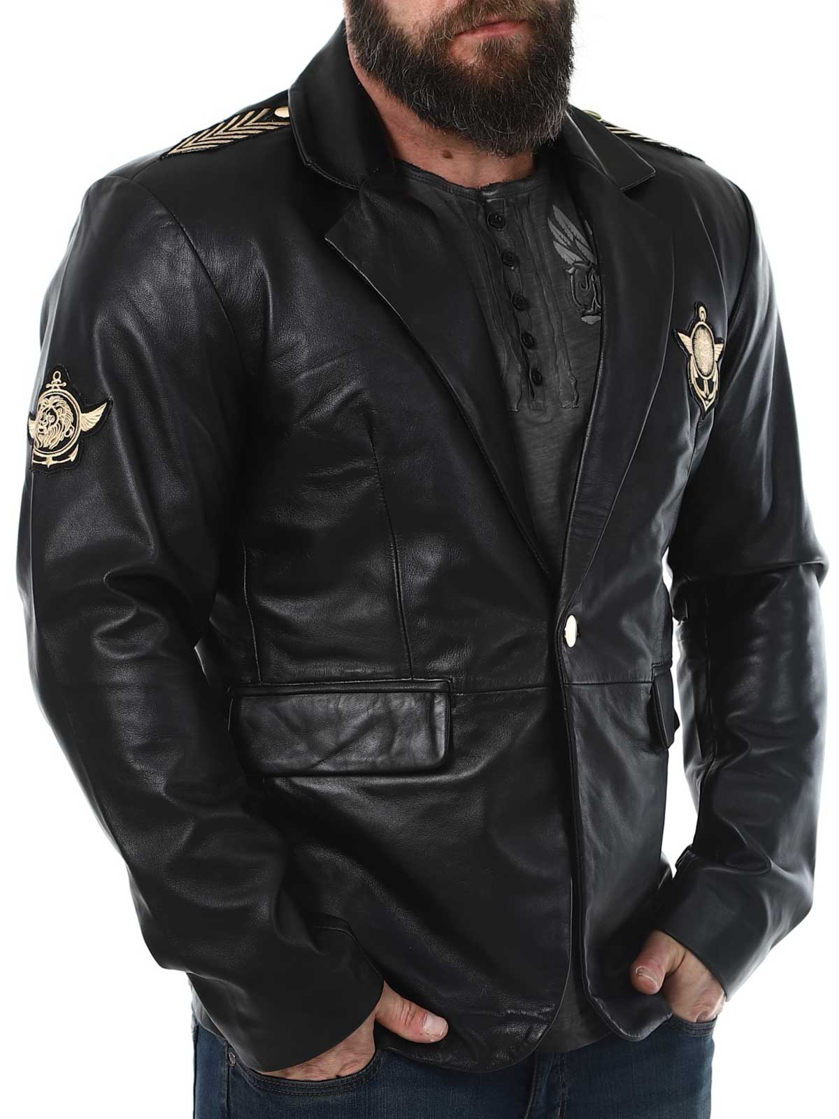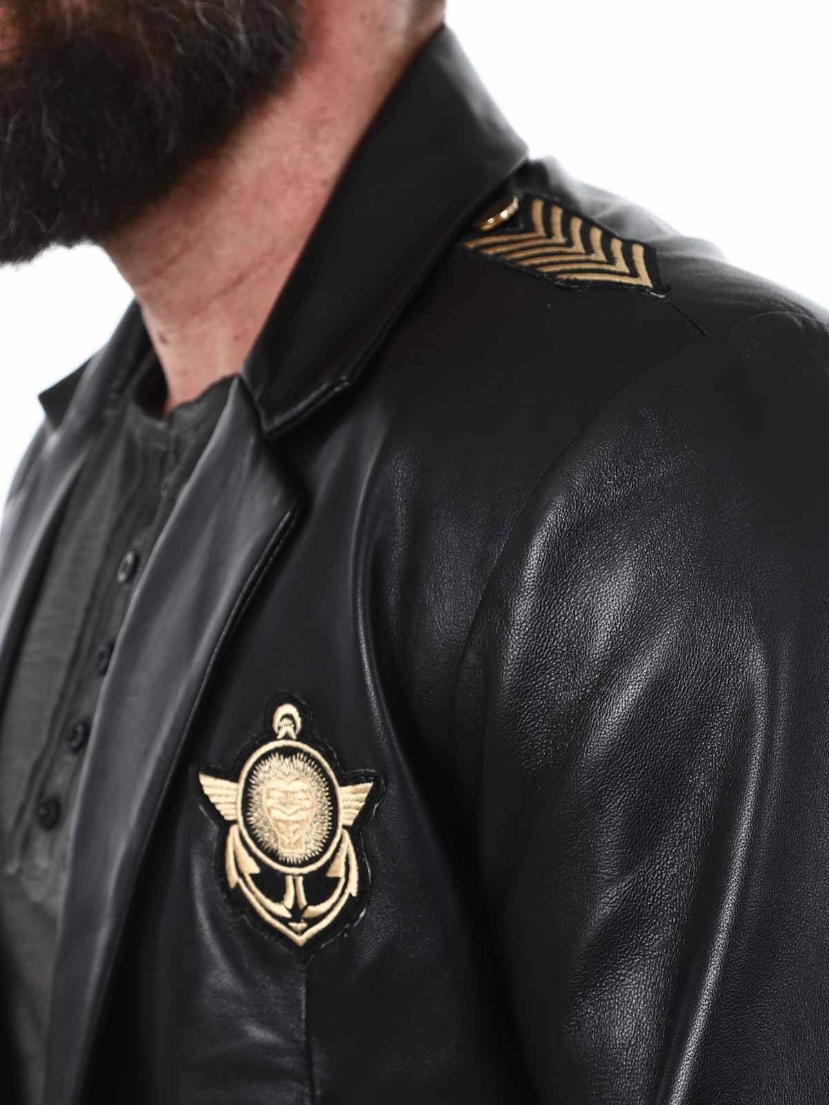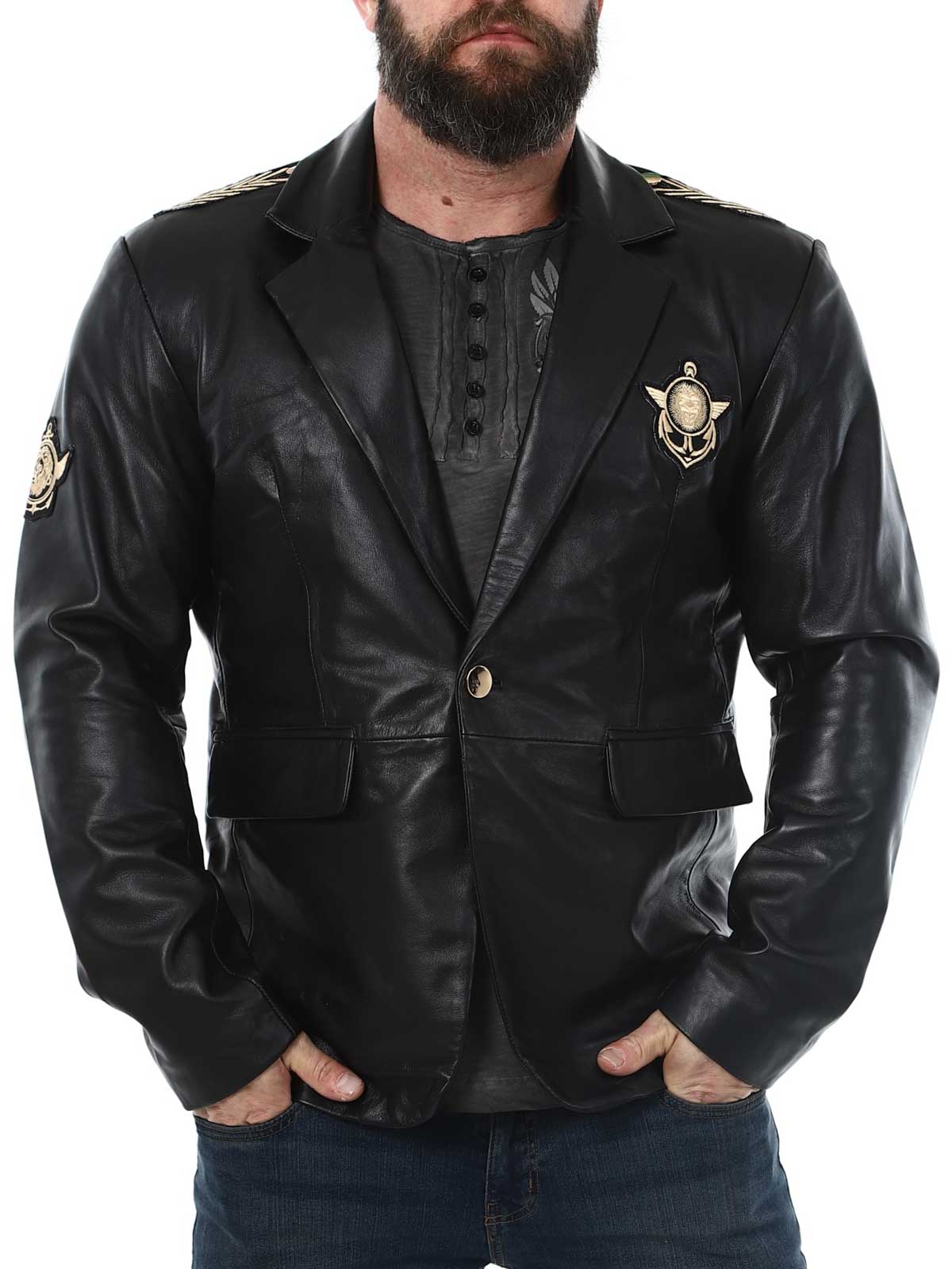 Sort blazer med lapper i et guldfarvet stof. Det er en enkeltknapsmodel med krave og to lommer fortil samt to lommer indvendigt. Denne jakke er lavet af et blødt læder for den bedste komfort og den fås kun hos RockDenim!