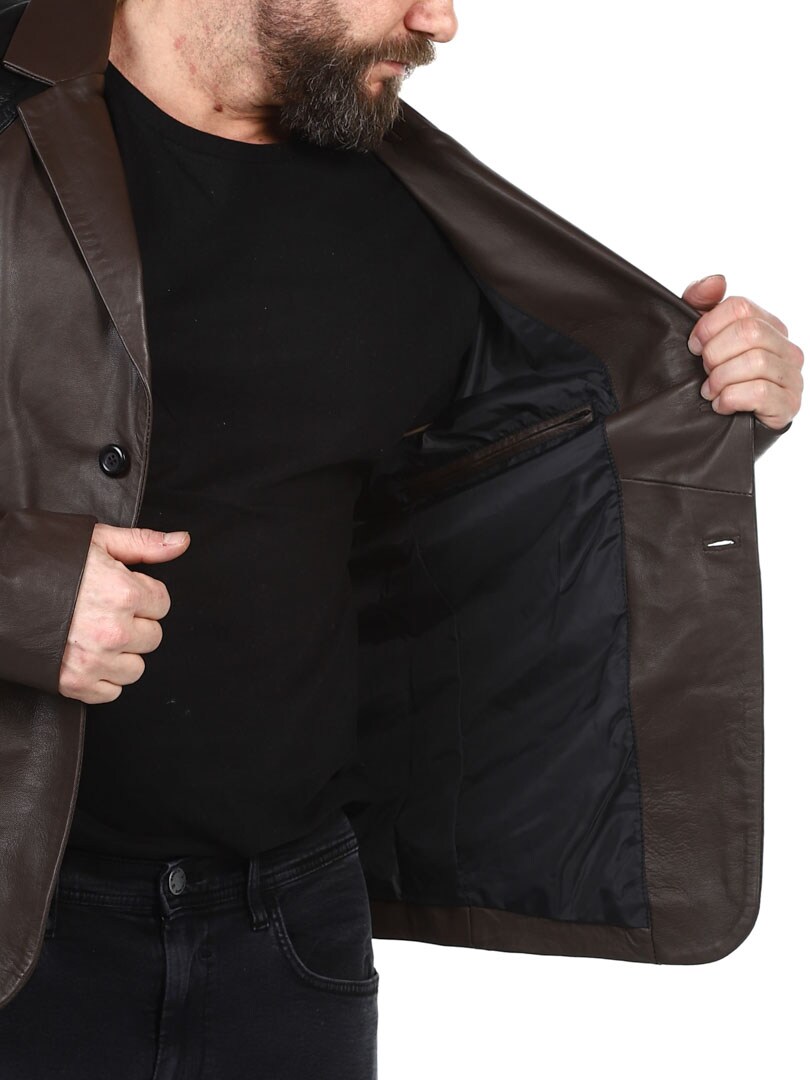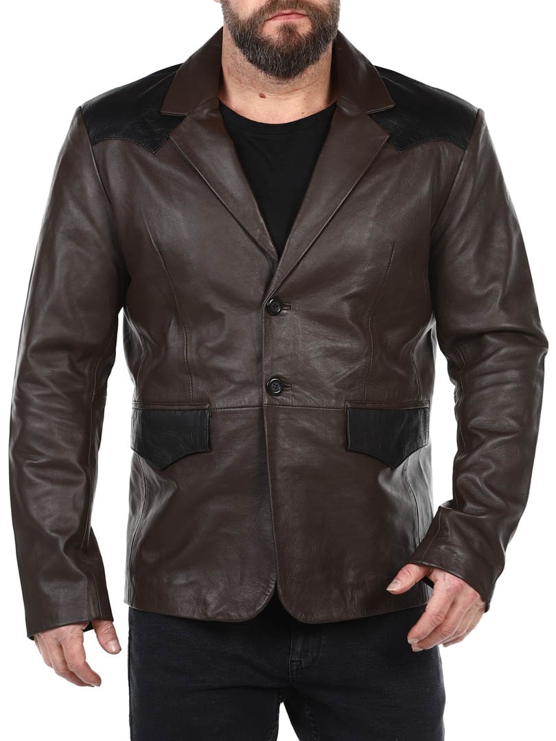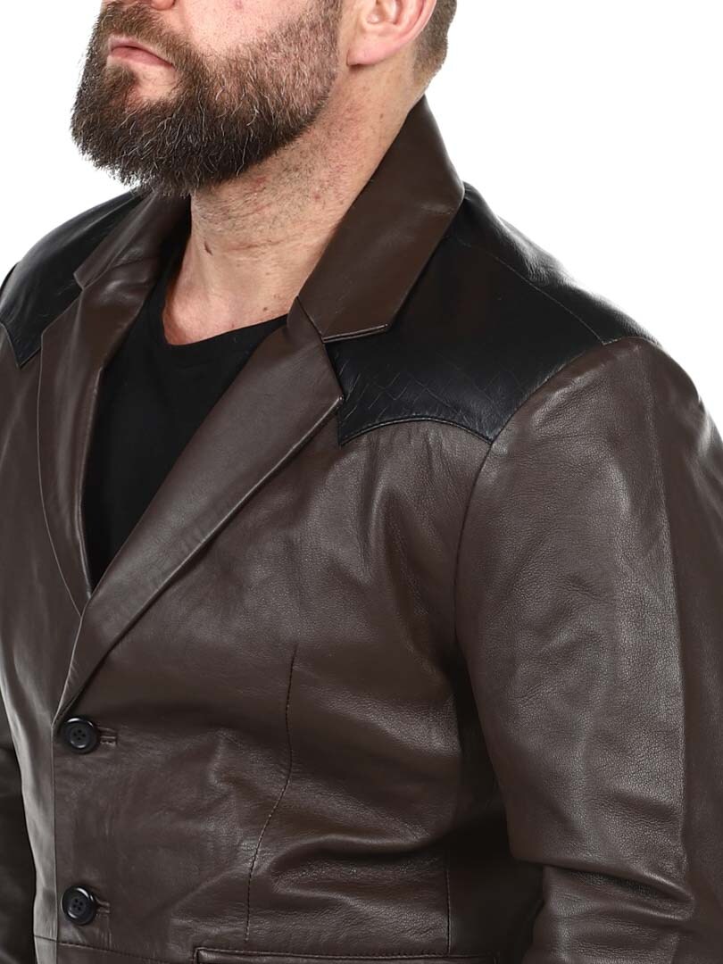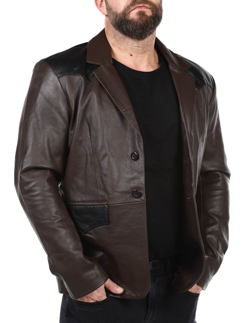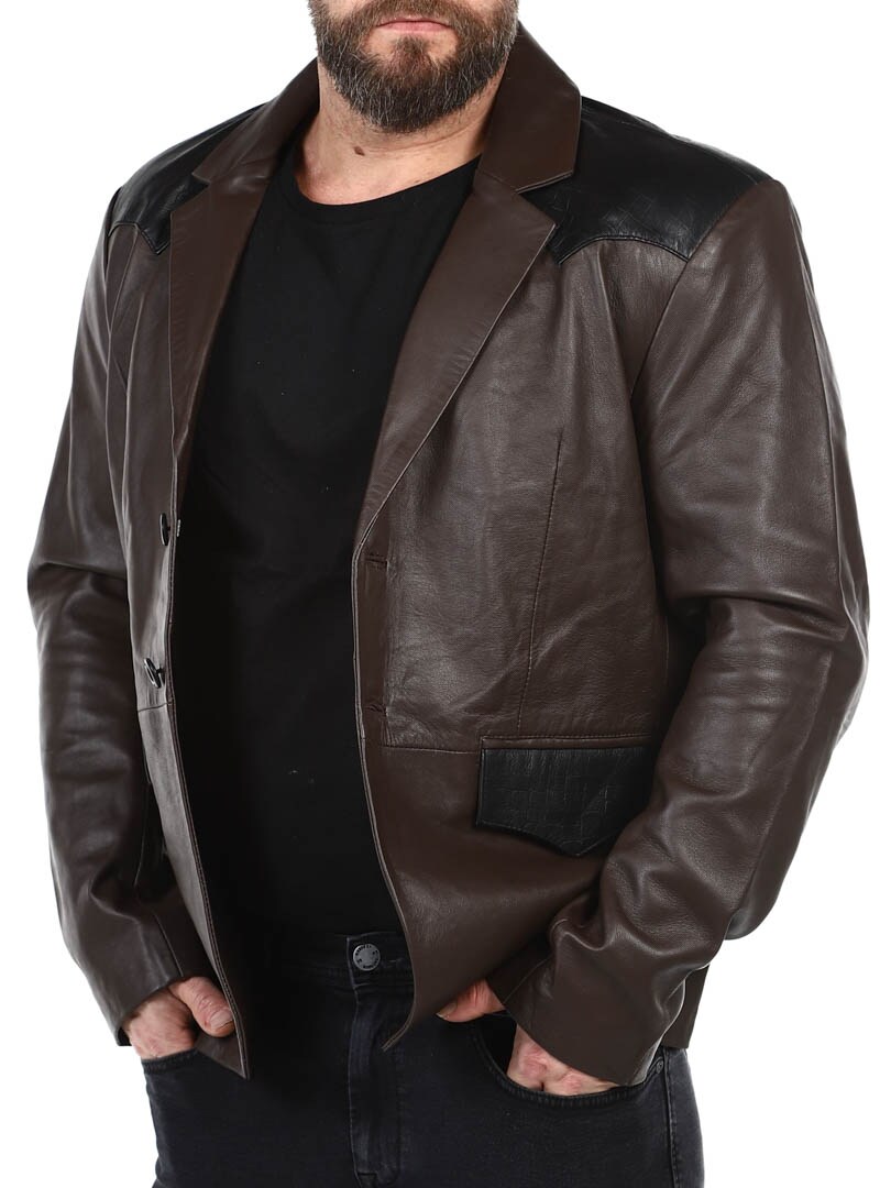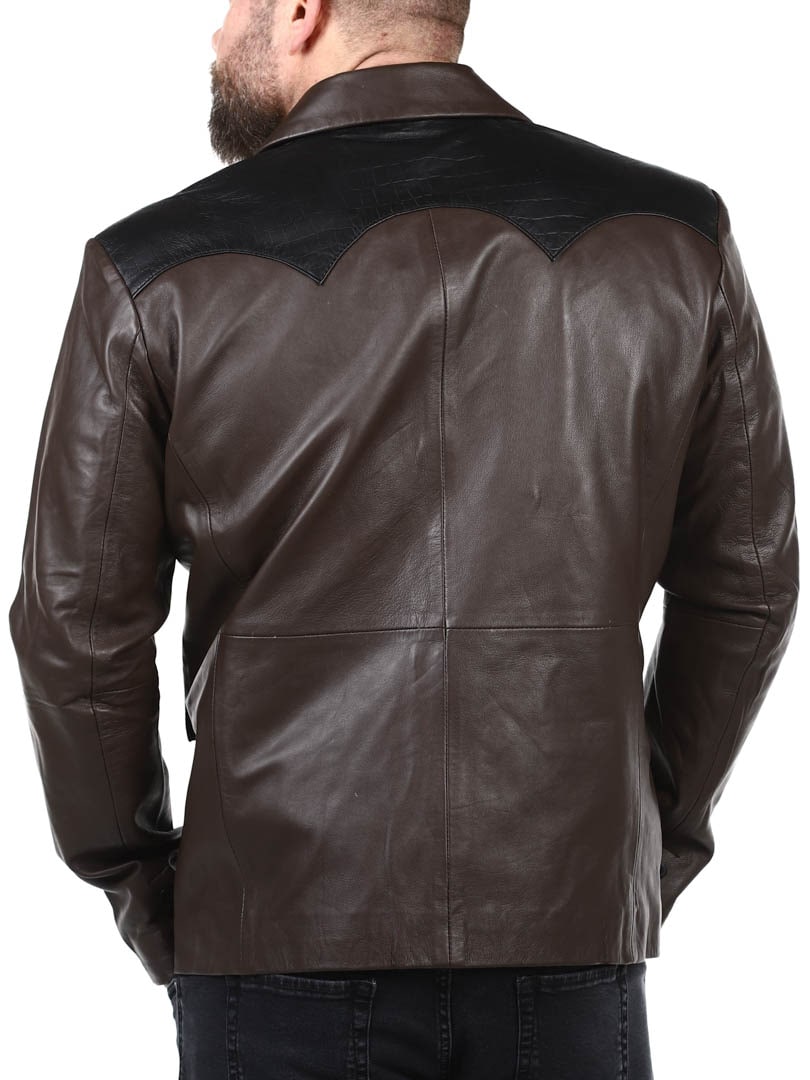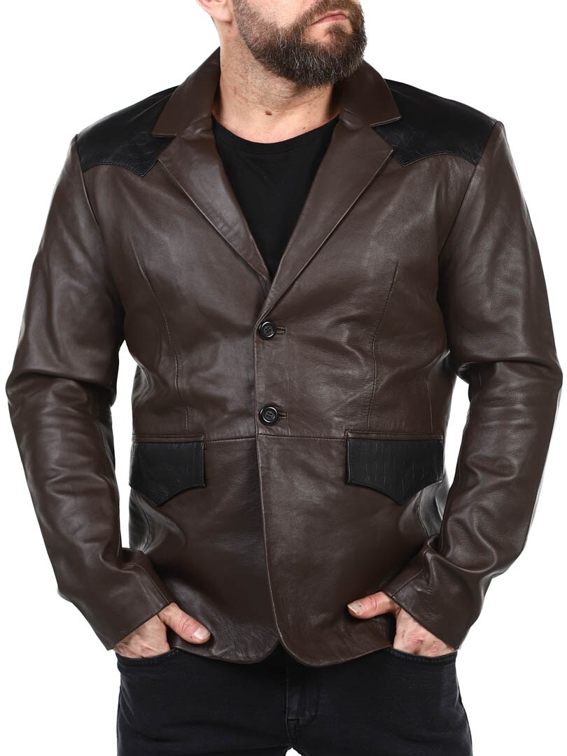Brun blazer med skuldre og lommeflapper i et sort krybdyrmønster. Det er en enkeltknapsmodel med en krave og to lommer fortil. Hertil kommer to ommer indvendigt. Denne jakke er lavet i et blødt læder for den bedste komfort og fås kun hos RockDenim!