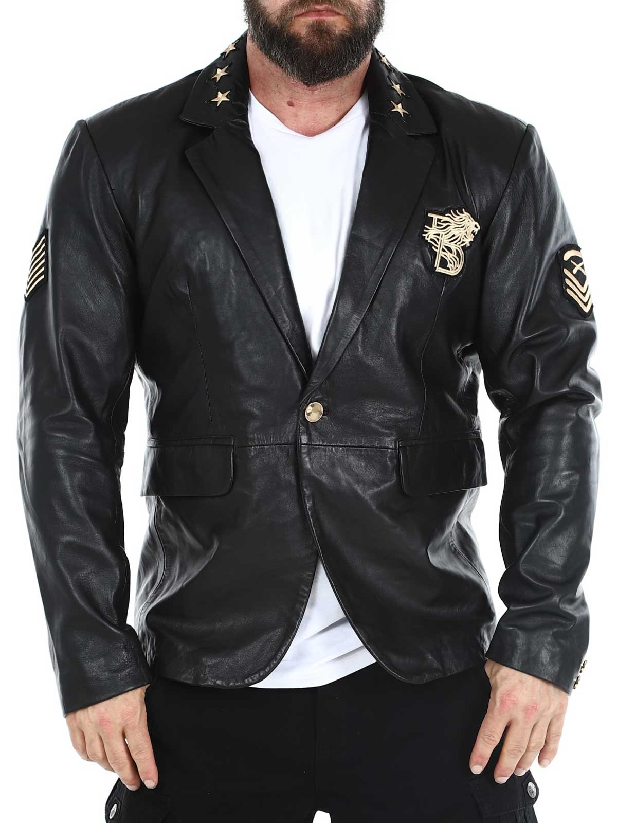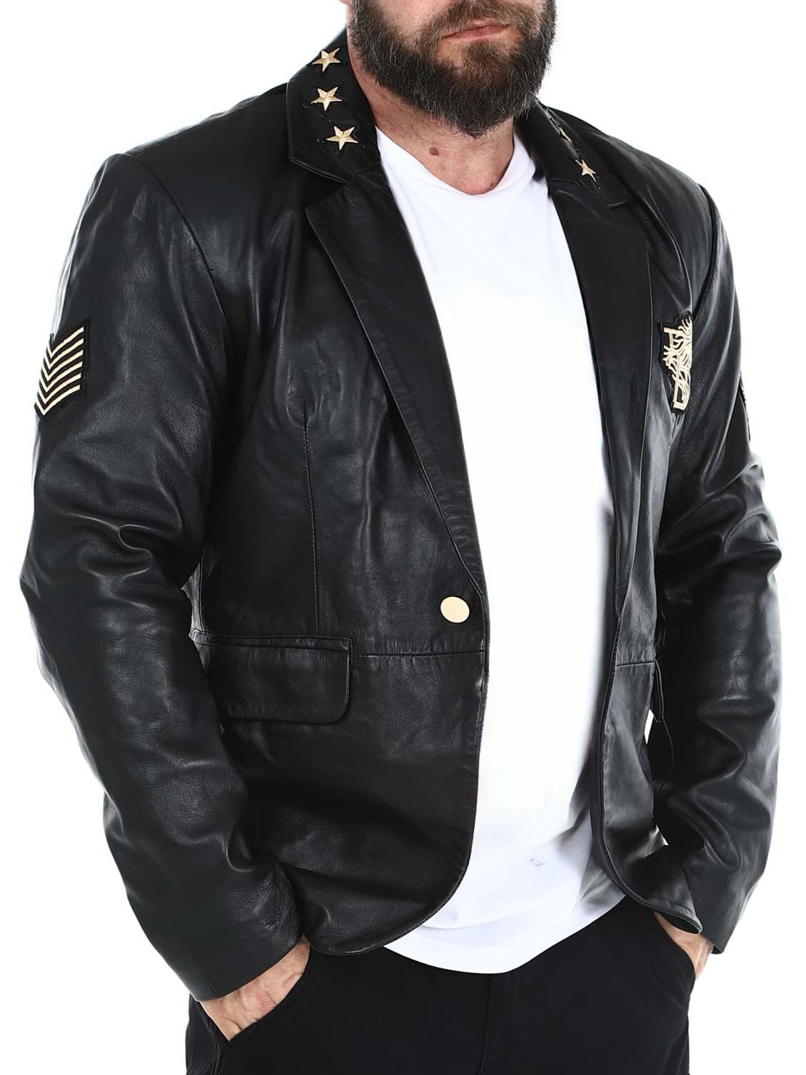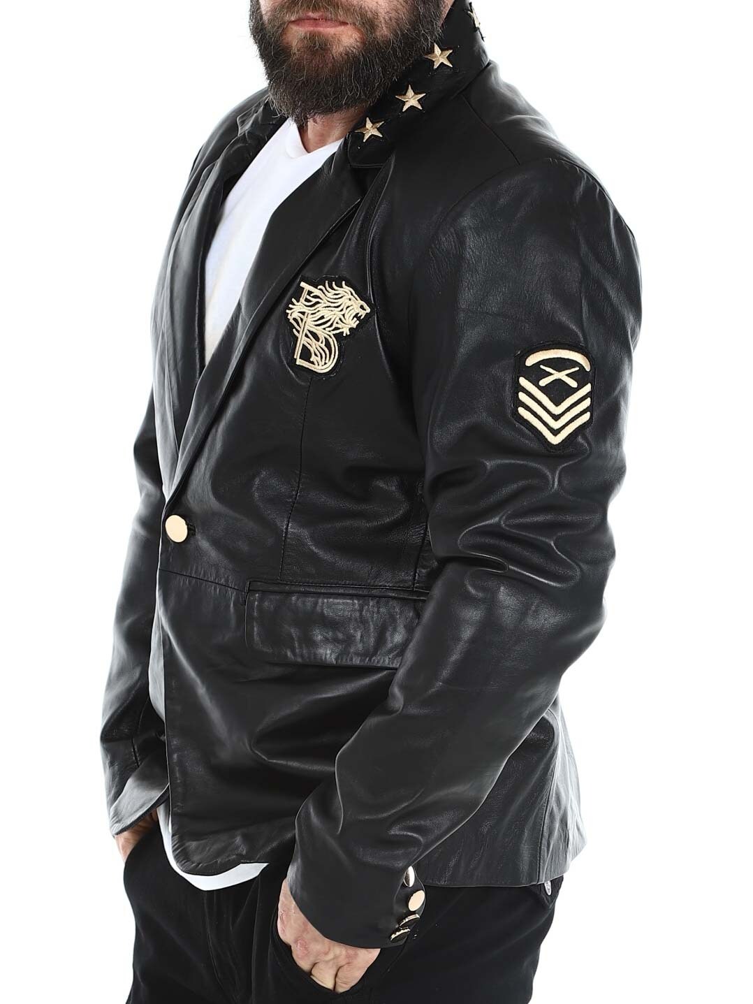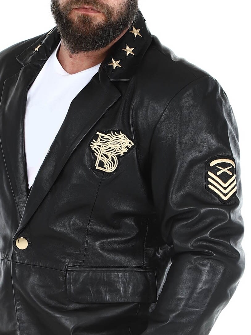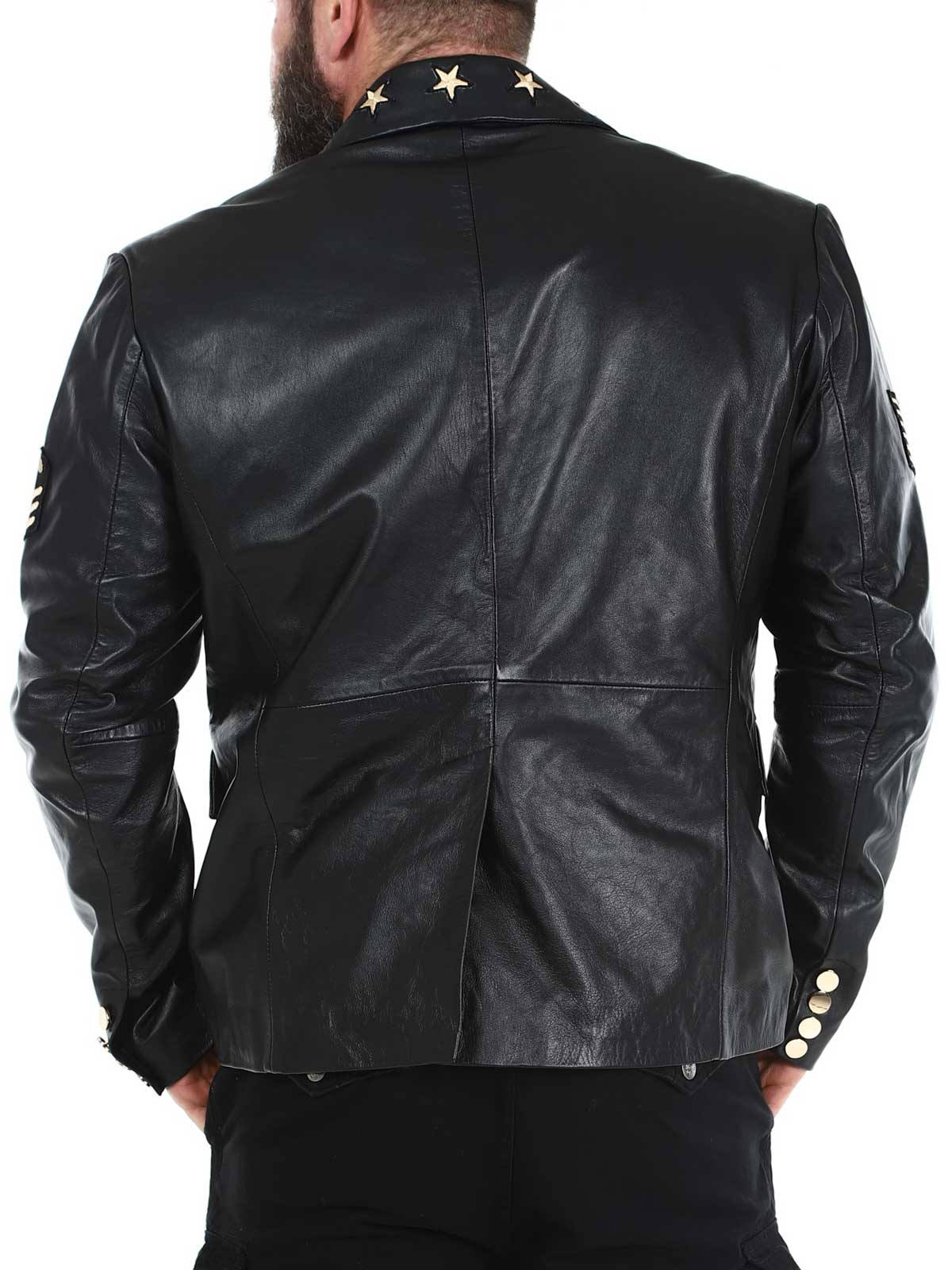 Sort blazer med lapper i et guldfarvet stof. Det er en enkeltknapsmodel med krave og to lommer fortil samt to lommer indvendigt. Denne jakke er lavet af et blødt læder for den bedste komfort og den fås kun hos RockDenim!