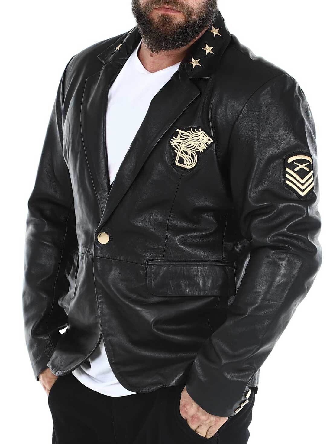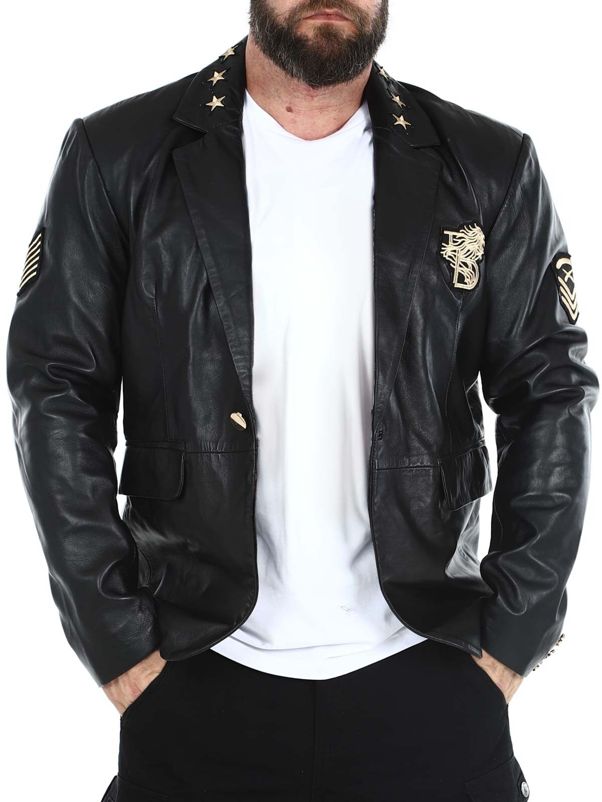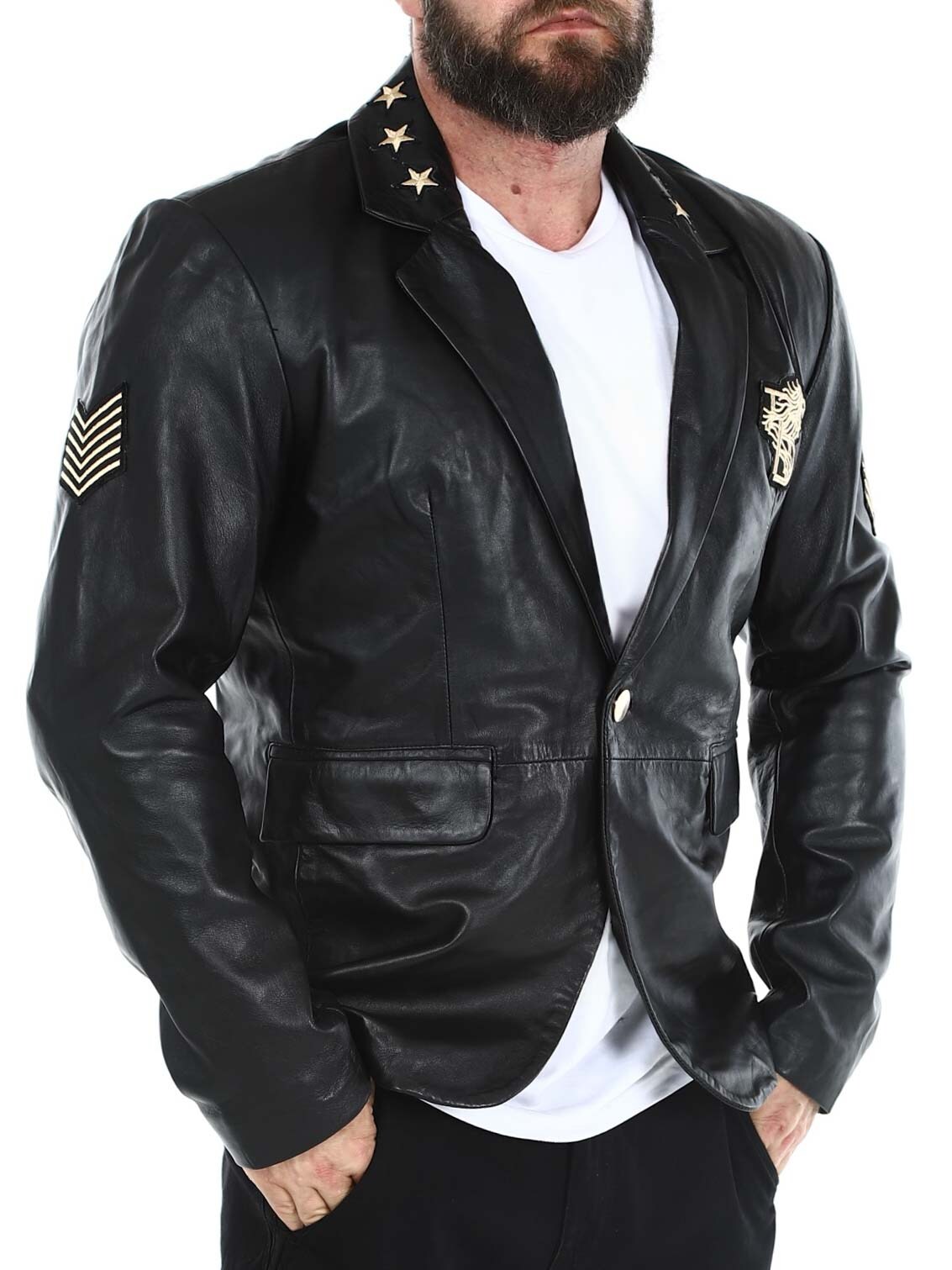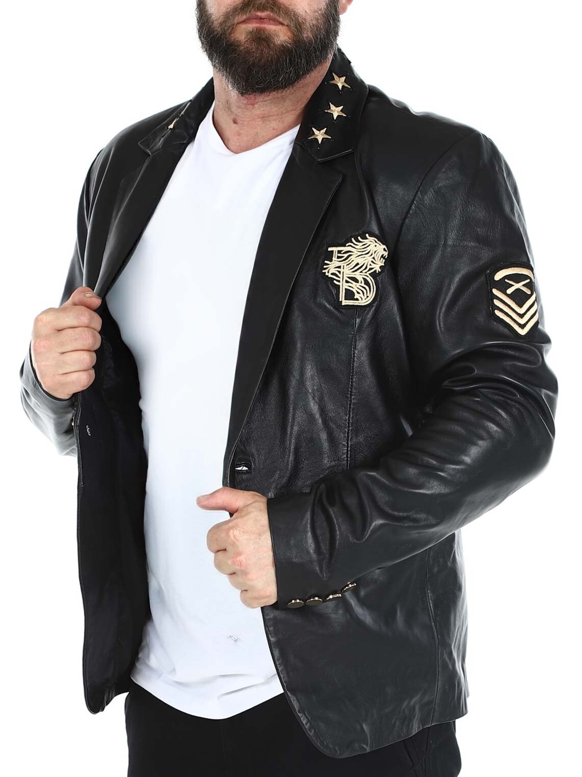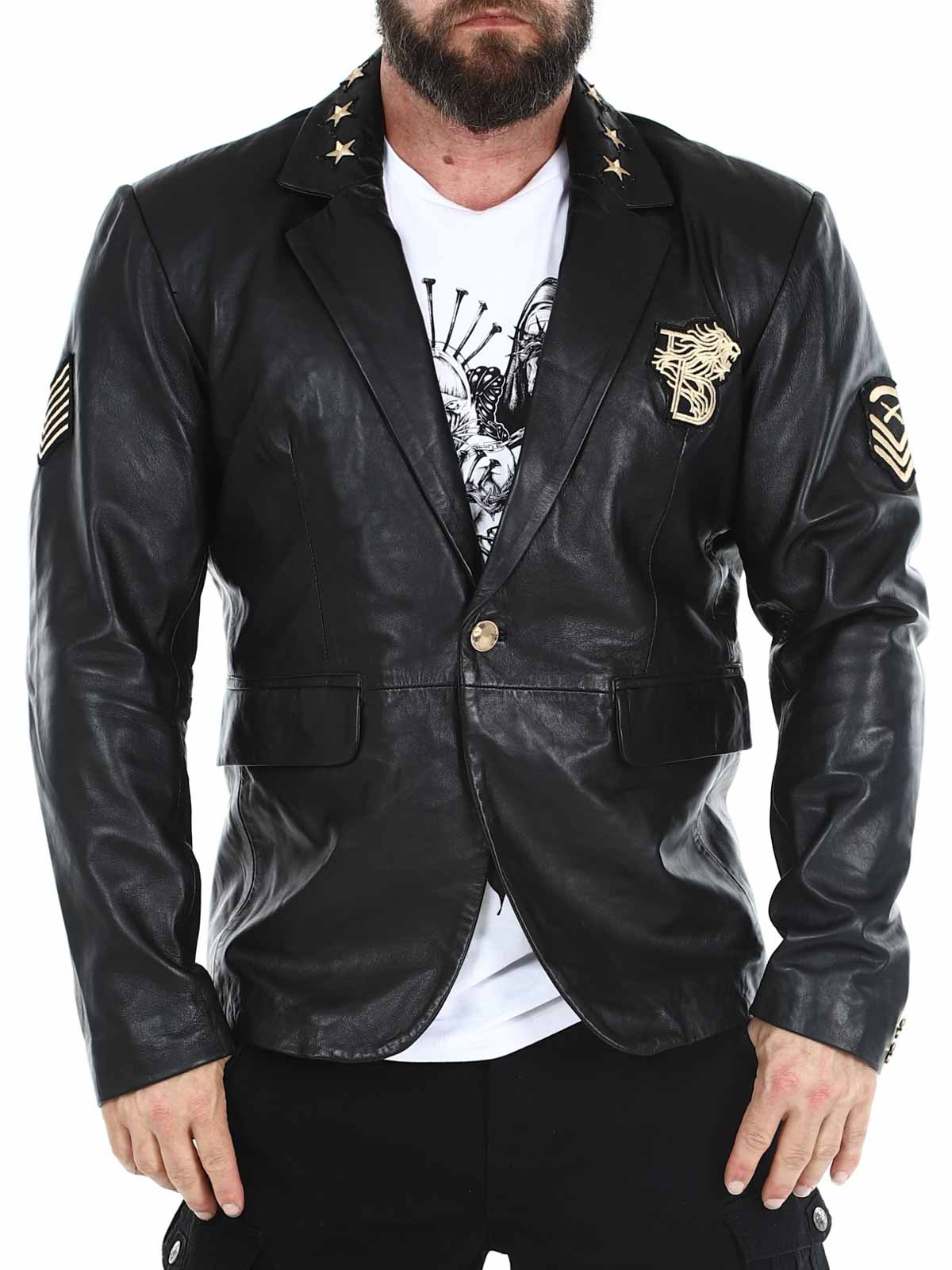 Sort blazer med lapper i et guldfarvet stof. Det er en enkeltknapsmodel med krave og to lommer fortil samt to lommer indvendigt. Denne jakke er lavet af et blødt læder for den bedste komfort og den fås kun hos RockDenim!