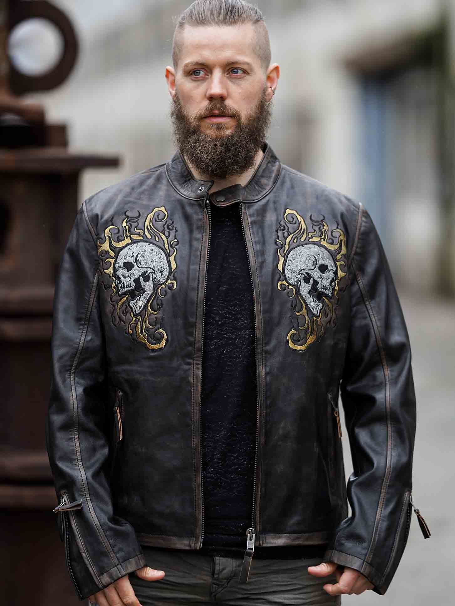 Jakke i ægte læder med et skræddersyet motiv i form af et dødningehoved samt brune nuancer, der giver jakken et flot vintage look. Enderne af ærmerne kan justeres, og der findes desuden lommer med lynlås og trykknap ved halsen. Dette er en kvalitetsjakke med et cool design, som du udelukkende finder hos RockDenim!