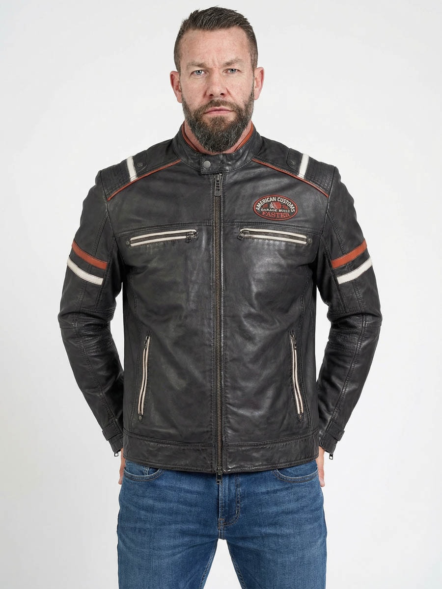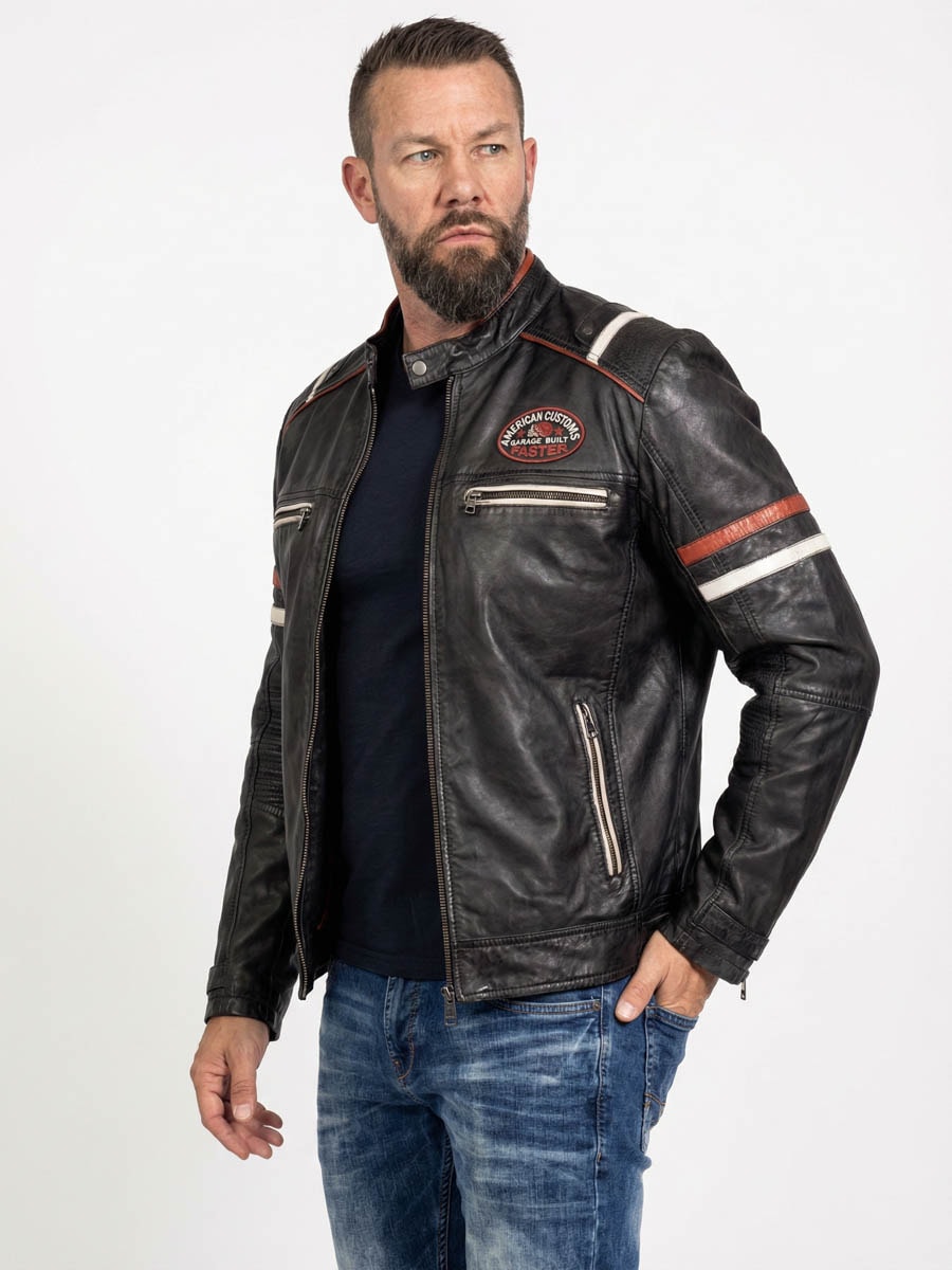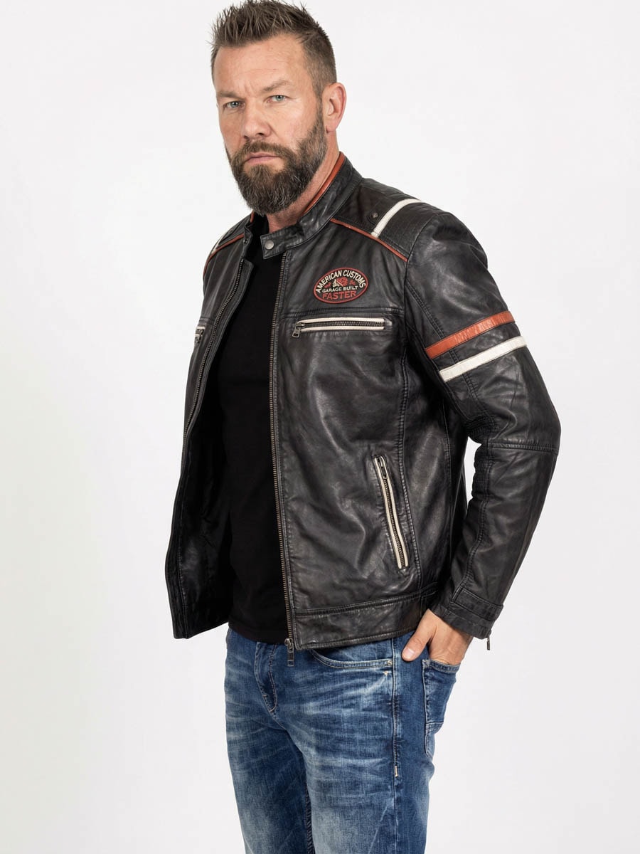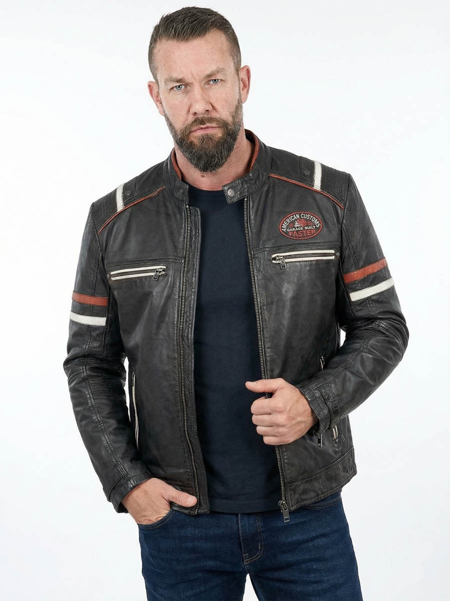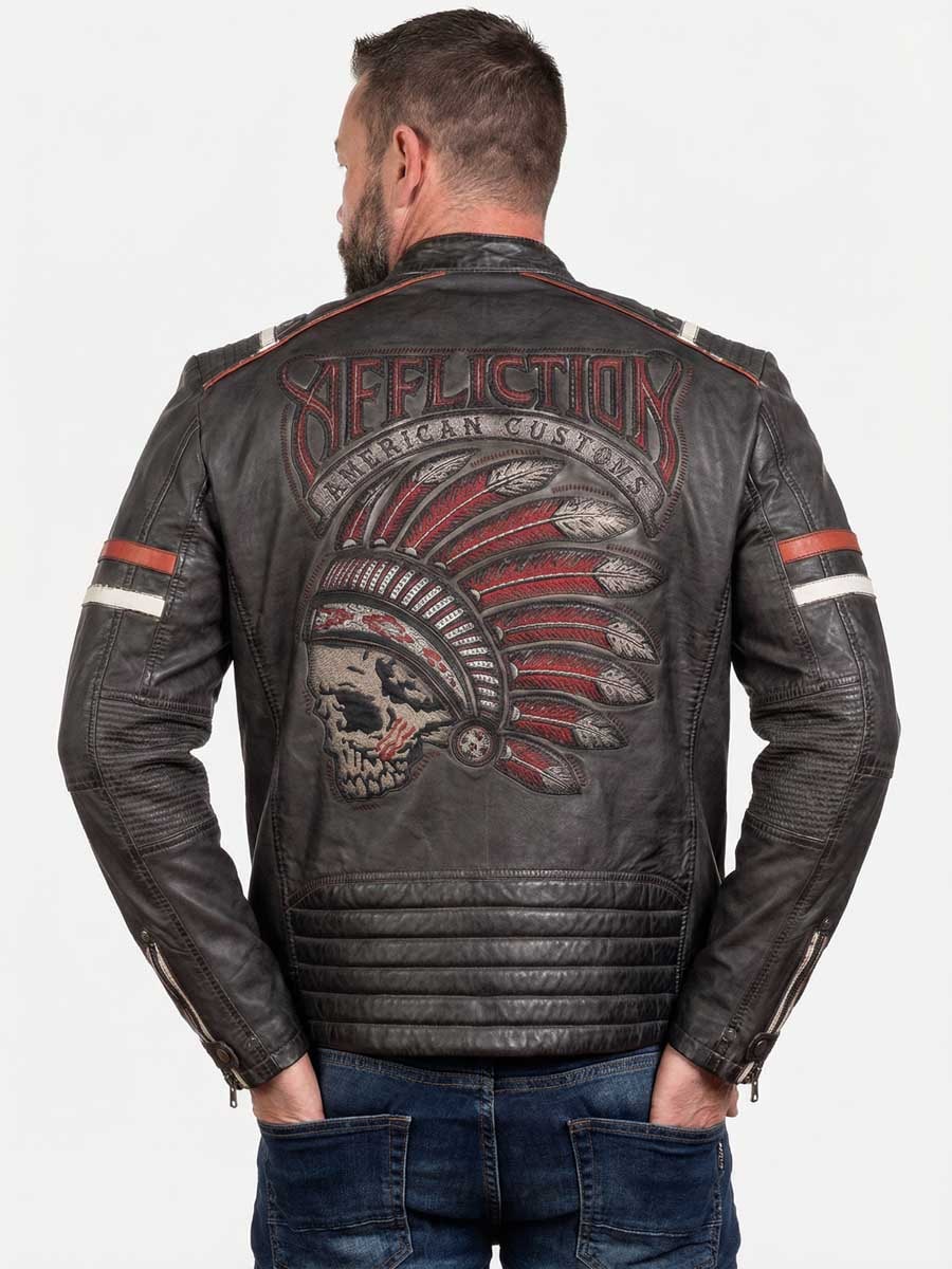 En robust og detaljeret jakke i ægte læder, som kun bliver flottere med tiden. Den har et kraftfuldt design med kontrastsyninger, broderede patches og flere lynlåslommer på forsiden. På ryggen findes et stort, imponerende broderet motiv, som giver jakken det ikoniske Affliction-look. Perfekt til dig, der ønsker kvalitet og en markant stil – uanset om du kører motorcykel eller bare elsker udtrykket!