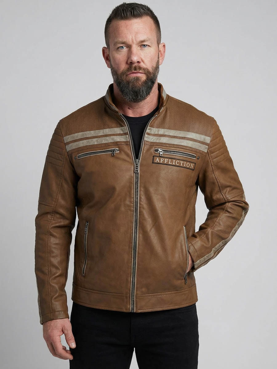 En stilfuld og detaljerig PU-jakke med en eksklusiv nubuck-effekt, der giver et blødt, let mat og luksuriøst udtryk. Jakken kombinerer MC-inspireret stil med Afflictions karakteristiske rockede look og store broderede motiver på ryggen. Den aftagelige sorte hætte gør jakken fleksibel: brug den med hoodie for et afslappet streetlook eller uden for et mere rent biker-inspireret udtryk.