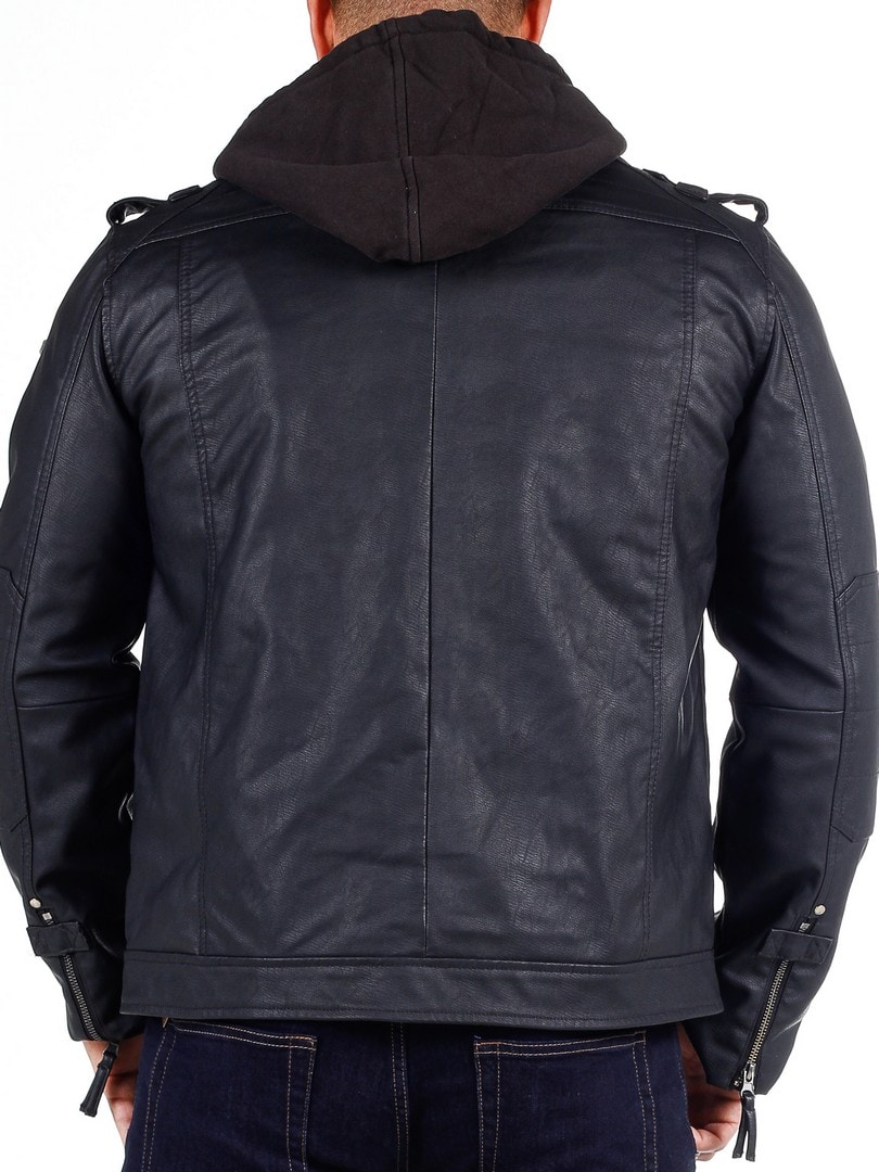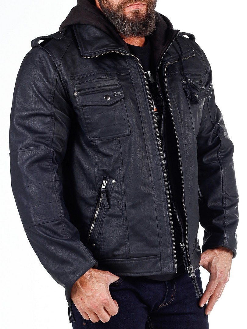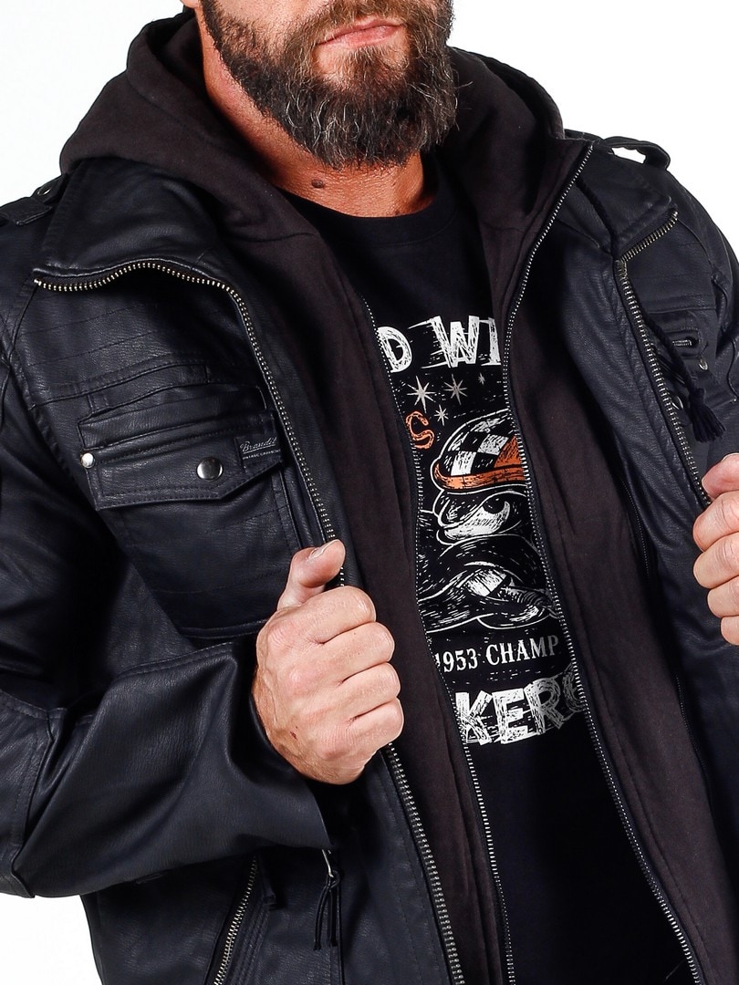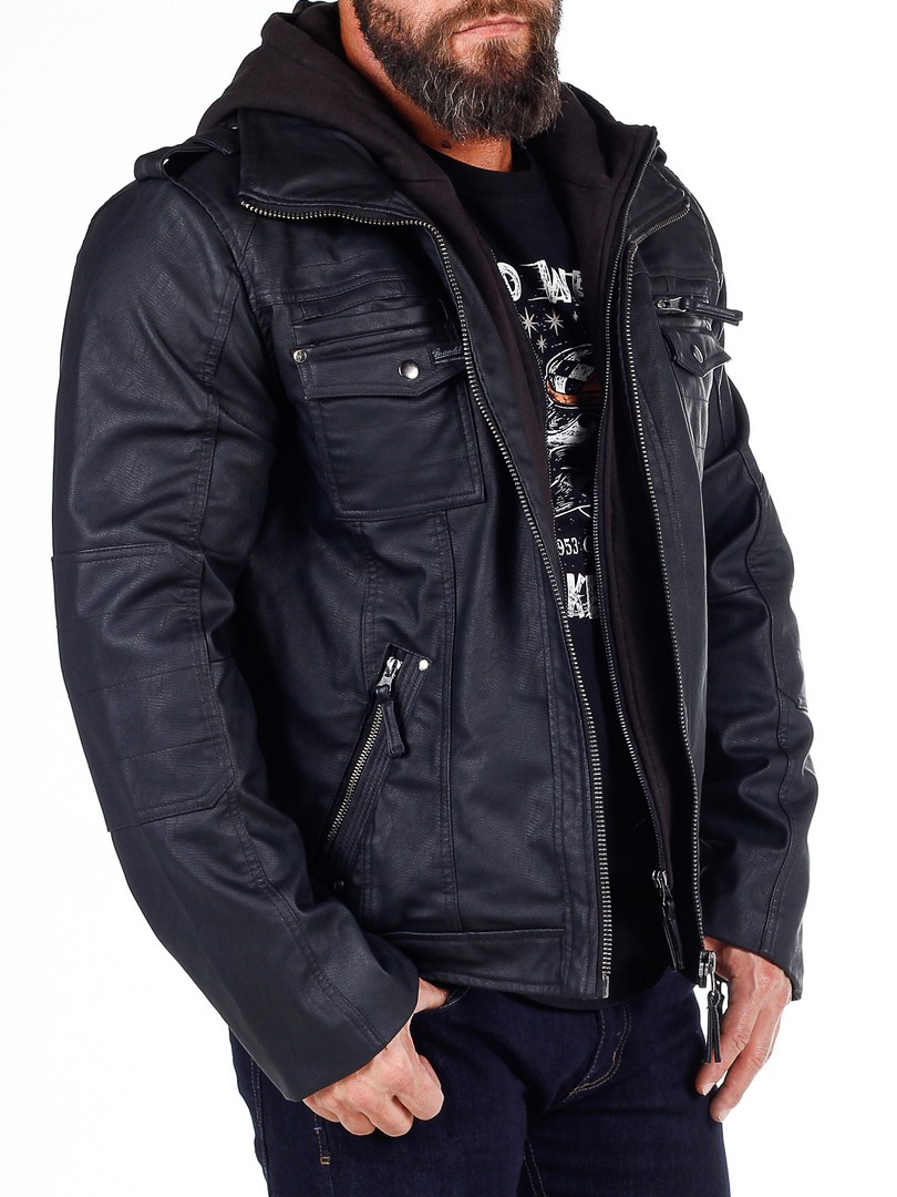 Jakke i en sort skindimitation med en hætte som let kan tages af, takket være lynlåsen. Tre brystlommer, som lukkes med trykknapper og en ved hjælp af en lynlås. Hertil kommer to rummelige lommer på maven. Jakken har en høj krave og lukkes med en lynlås i sølv. Flotte detaljer som sømme, fastsyede partier af stof på albuer og remme på skuldrene.