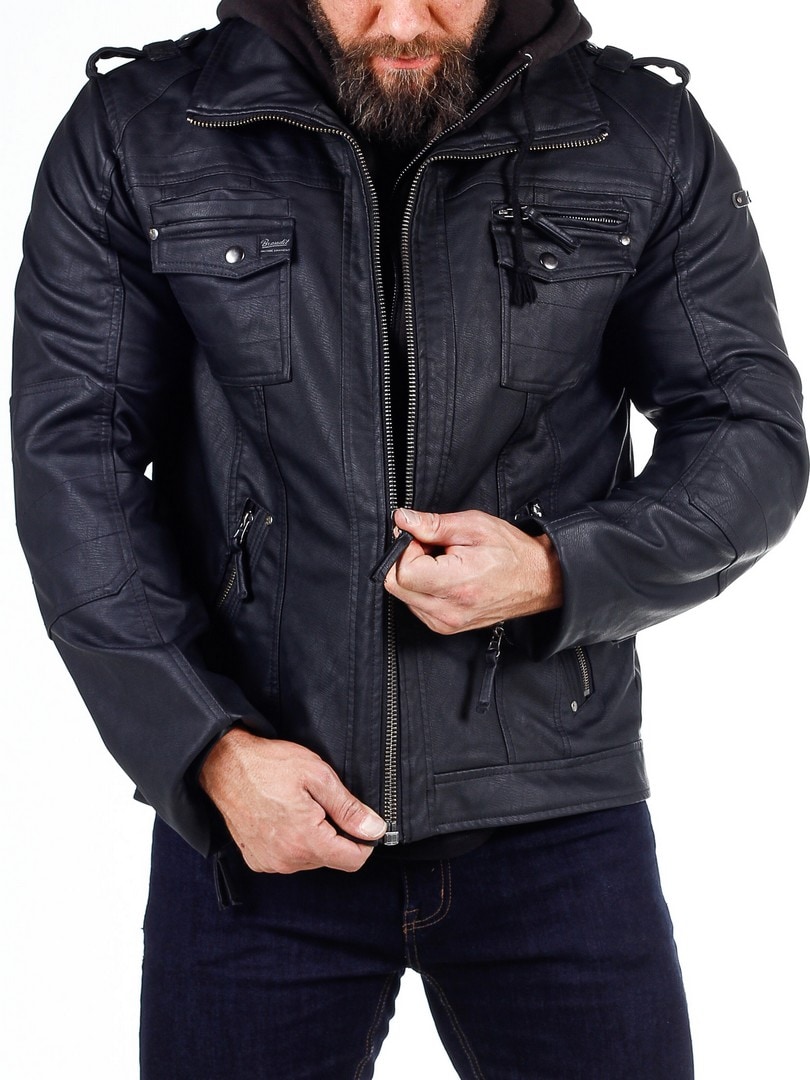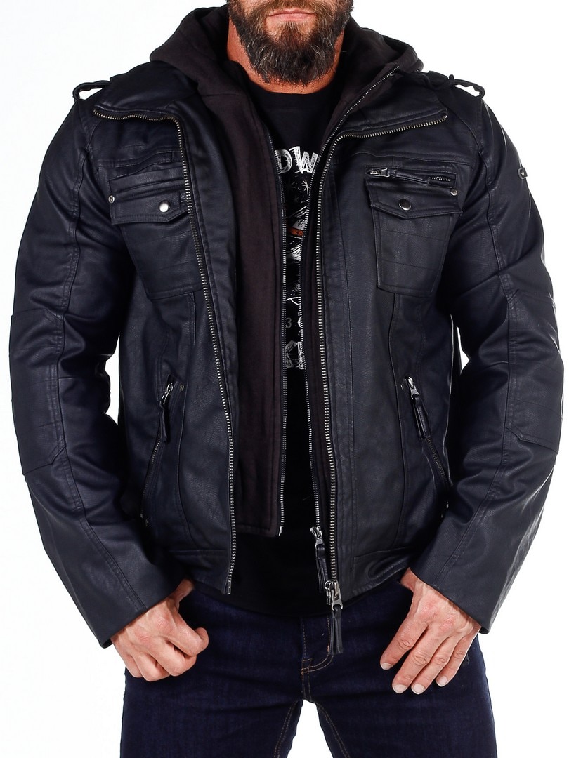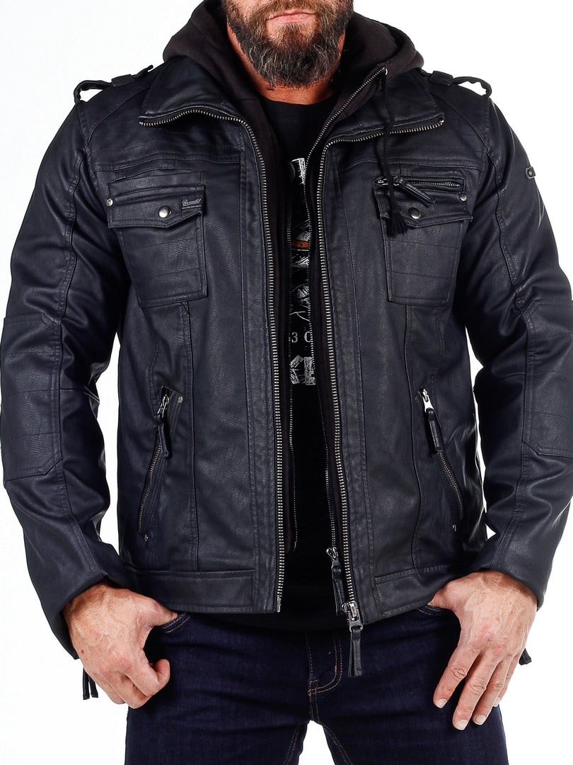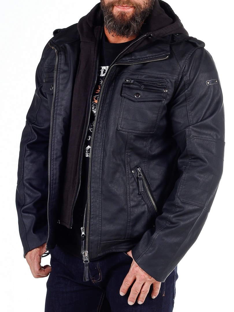 Jakke i en sort skindimitation med en hætte som let kan tages af, takket være lynlåsen. Tre brystlommer, som lukkes med trykknapper og en ved hjælp af en lynlås. Hertil kommer to rummelige lommer på maven. Jakken har en høj krave og lukkes med en lynlås i sølv. Flotte detaljer som sømme, fastsyede partier af stof på albuer og remme på skuldrene.