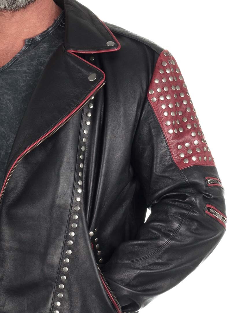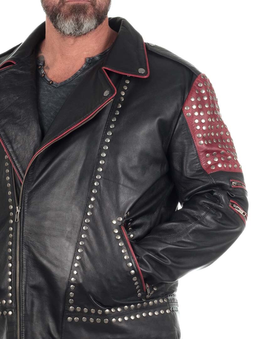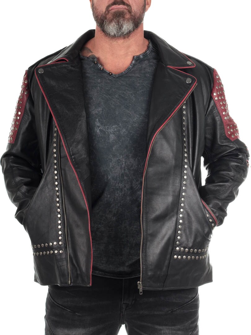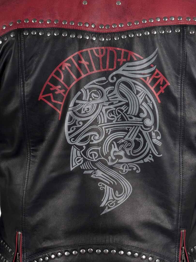 En vatteret jakke i ægte, smidigt læder med kontrasterende røde paneler og dekorative nitter, som giver et råt og markant udtryk. På ryggen findes et stort vikingeinspireret print, der understreger det unikke look. Jakken har flere praktiske lommer samt justerbare manchetter og kant. En jakke til dig, der ønsker en rock’et stil – med premiumfølelse!