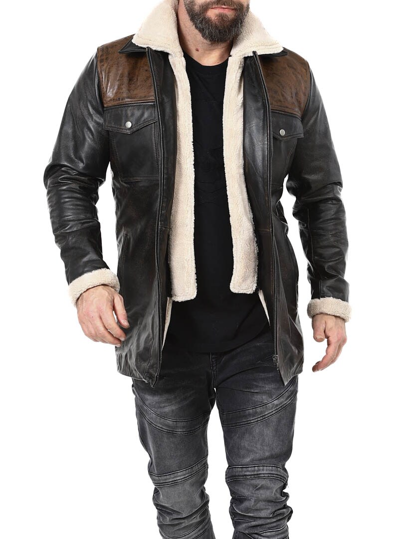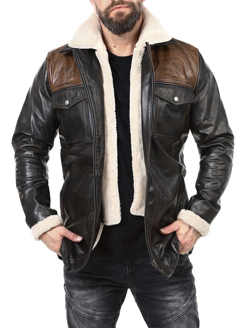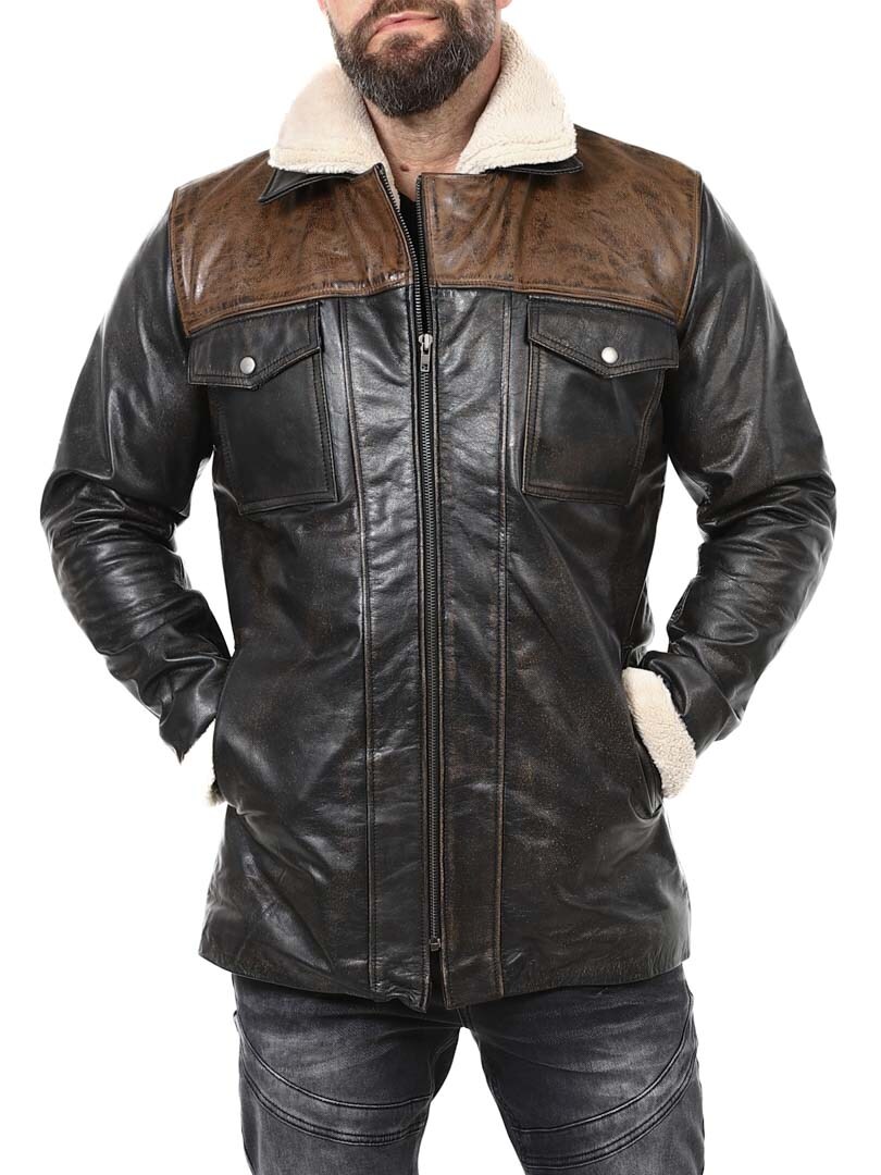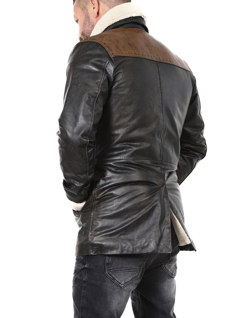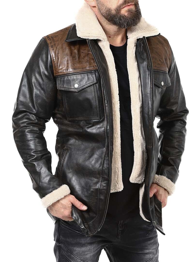 Robust og kraftfuld jakke i ægte bøffellæder med et design, der udstråler selvtillid og attitude. Kombinationen af sort læder og kontrasterende brune skulderpartier giver et markant og stilfuldt udtryk. Indersiden er foret med varmt teddyfor, som giver komfort og varme på kolde dage. Jakken har flere praktiske lommer og en aftagelig teddykrave, så du nemt kan variere dit look efter vejr og stil. En jakke til manden, der kræver stil, styrke og holdbar kvalitet – eksklusivt hos RockDenim!
