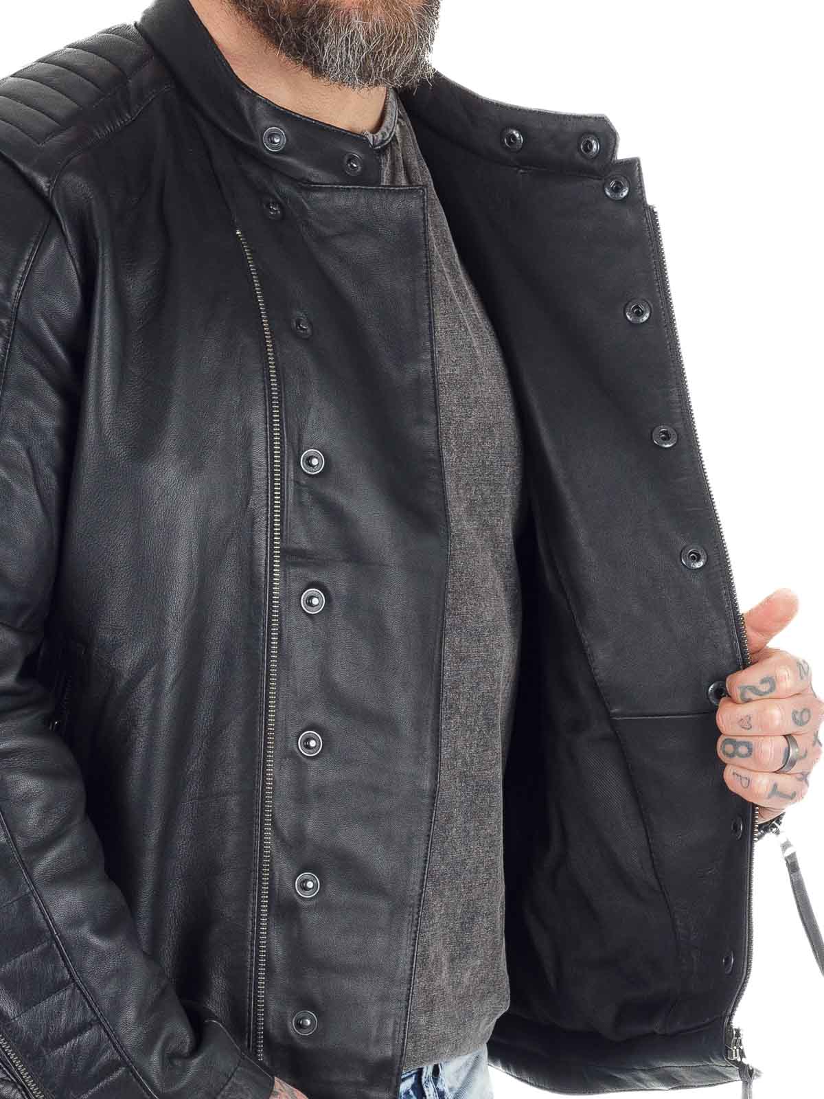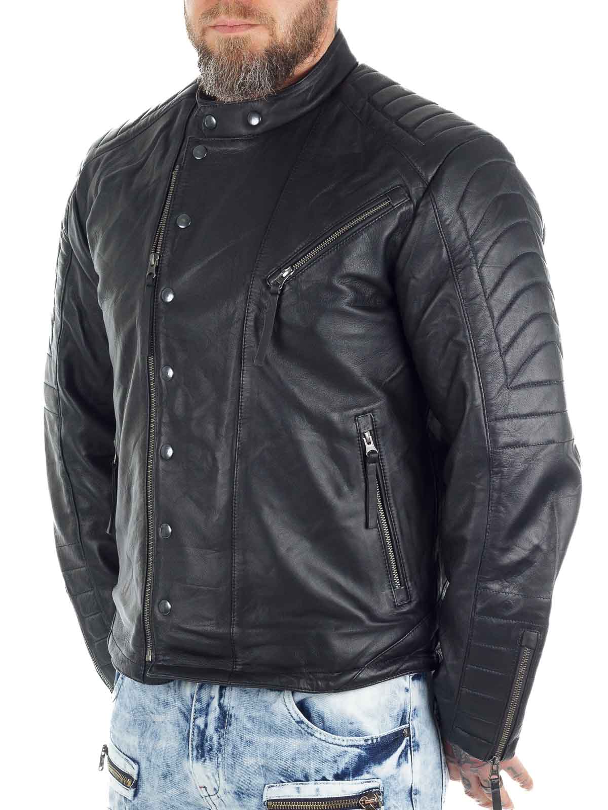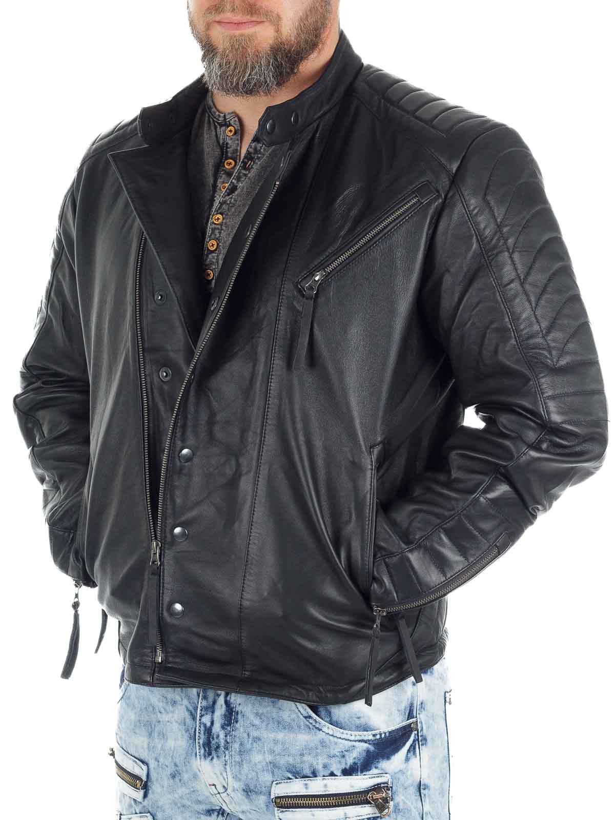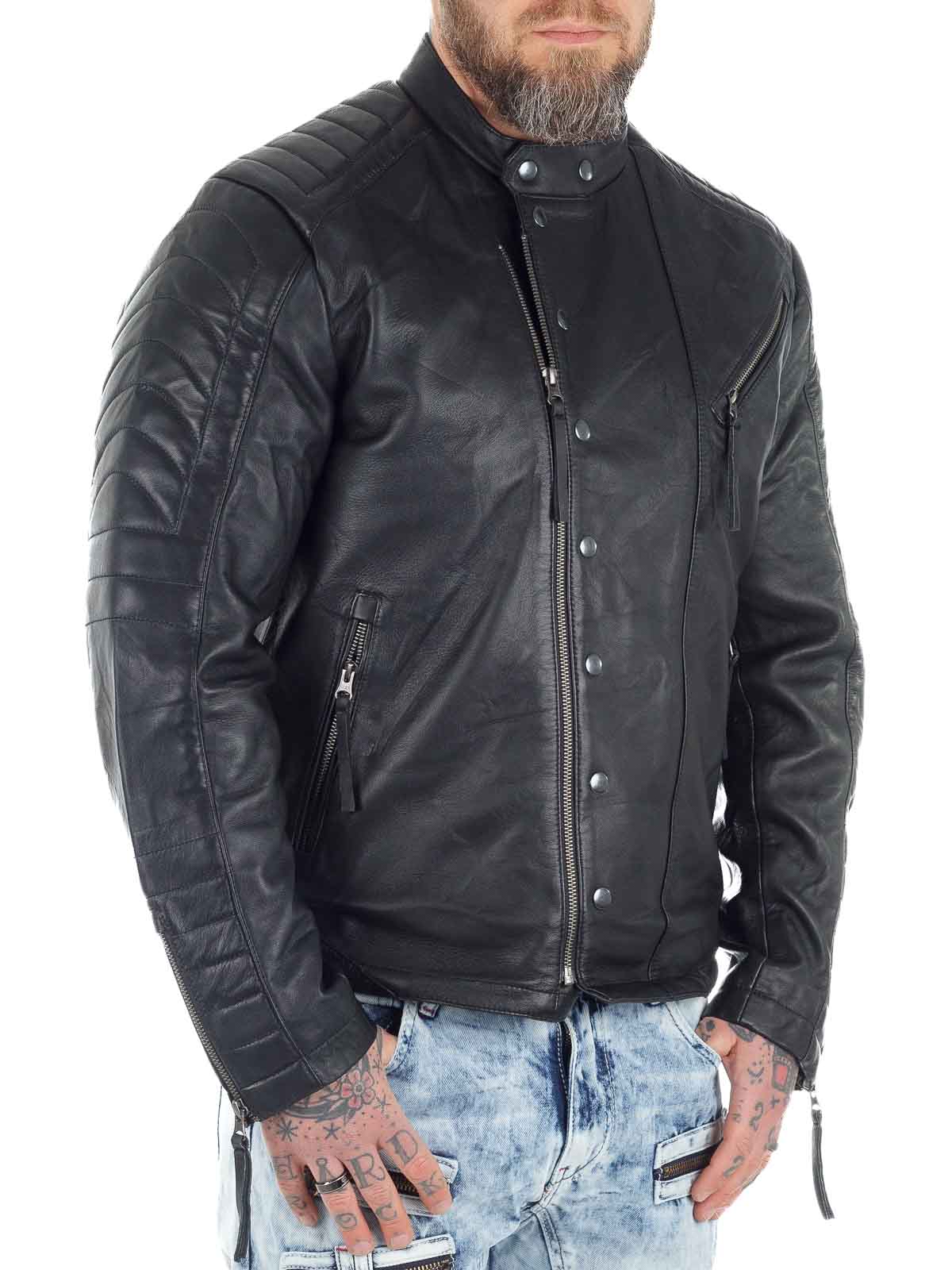 Rå skindjakke i blødt og smidigt fåreskind med markante detaljer, der giver et kraftfuldt udtryk. Modellen har lynlås- og knaplukning foran samt vatterede partier på skuldre, ærmer og ryg, som understreger det bikerinspirerede look. Tre praktiske yderlommer og to inderlommer gør jakken både stilfuld og funktionel. En eksklusiv skindjakke med attitude, perfekt til dig, der ønsker både komfort og karakter!